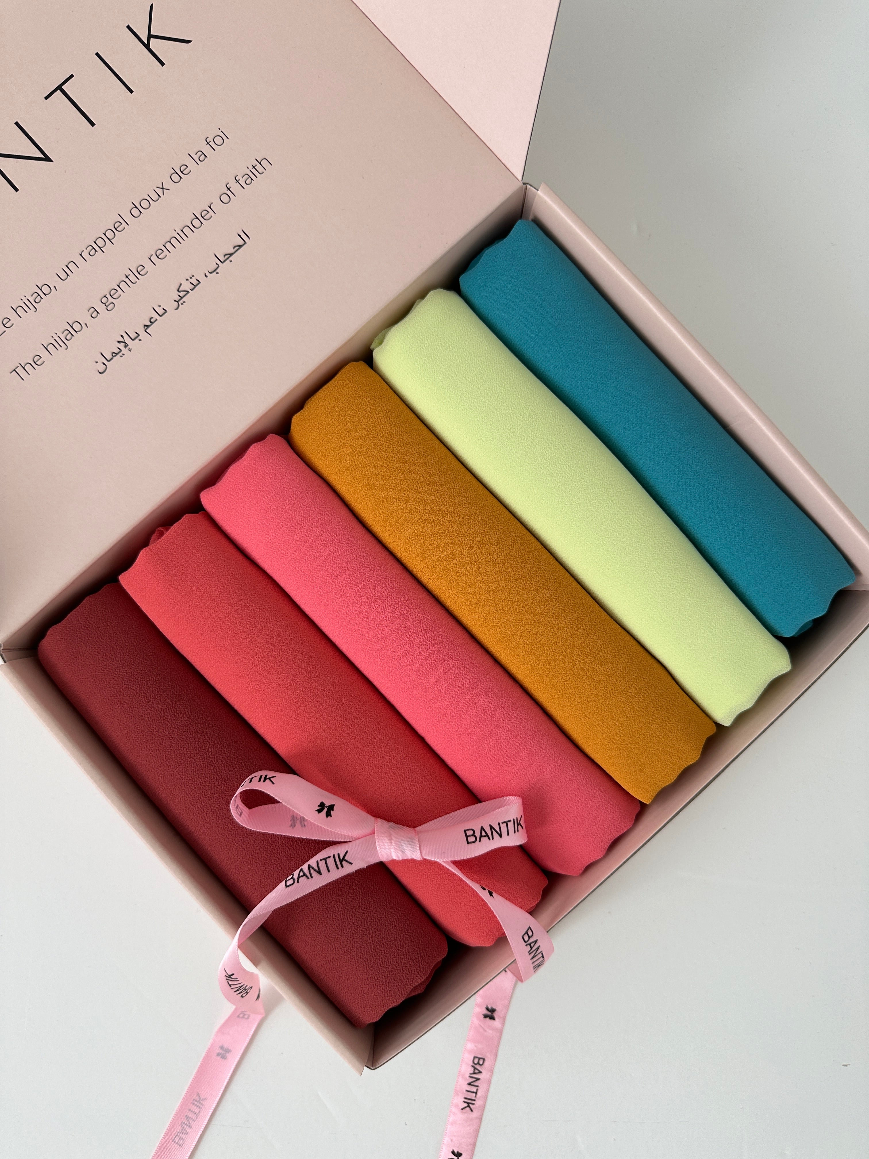 Un écrin d'élégance regroupant 6 hijabs en mousseline premium, soigneusement sélectionnés pour une palette lumineuse et audacieuse.