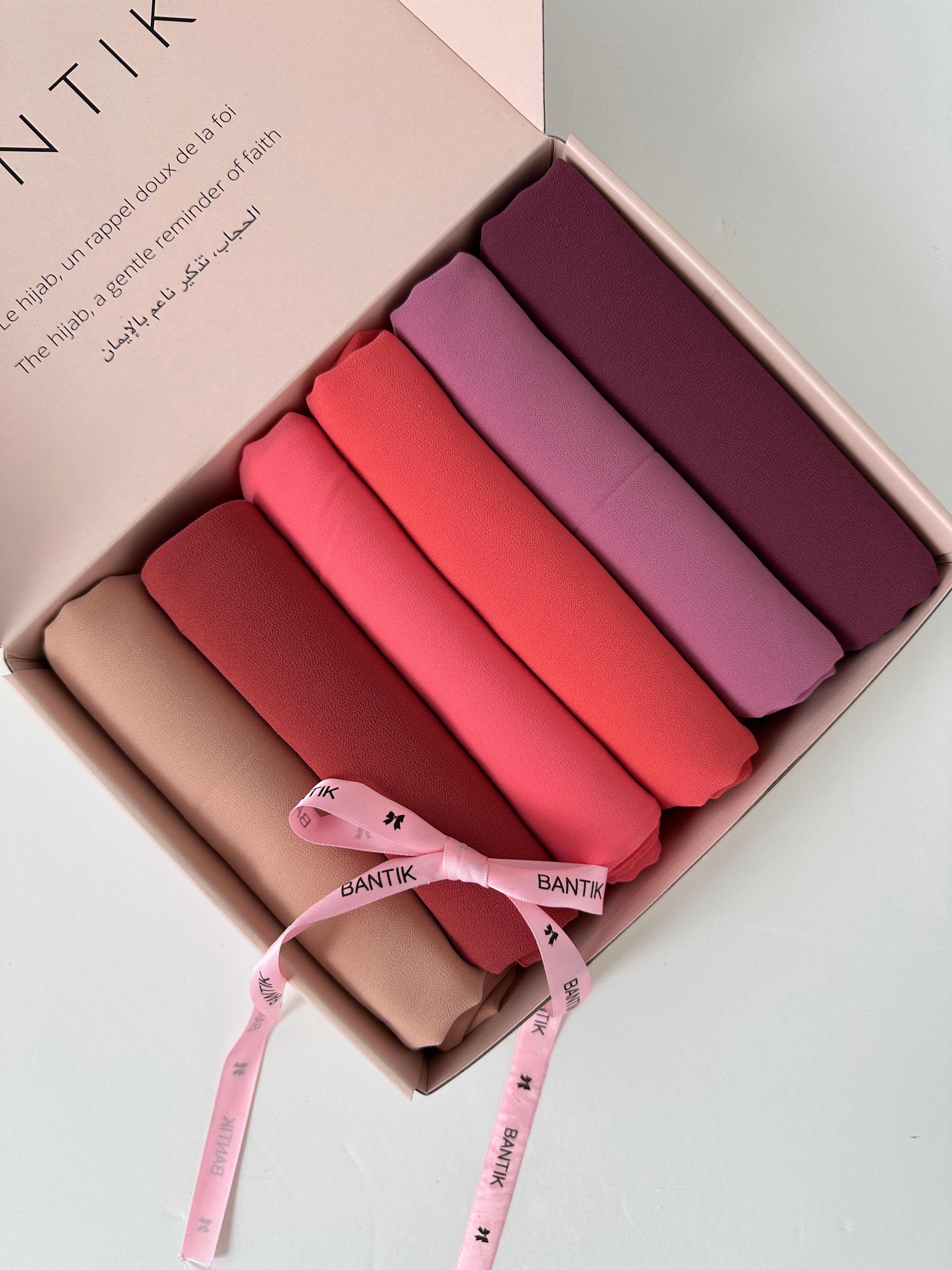 Un écrin d'élégance regroupant 6 hijabs en mousseline premium, soigneusement sélectionnés pour un dégradé chaleureux allant des tons nudes aux nuances de baies profondes.