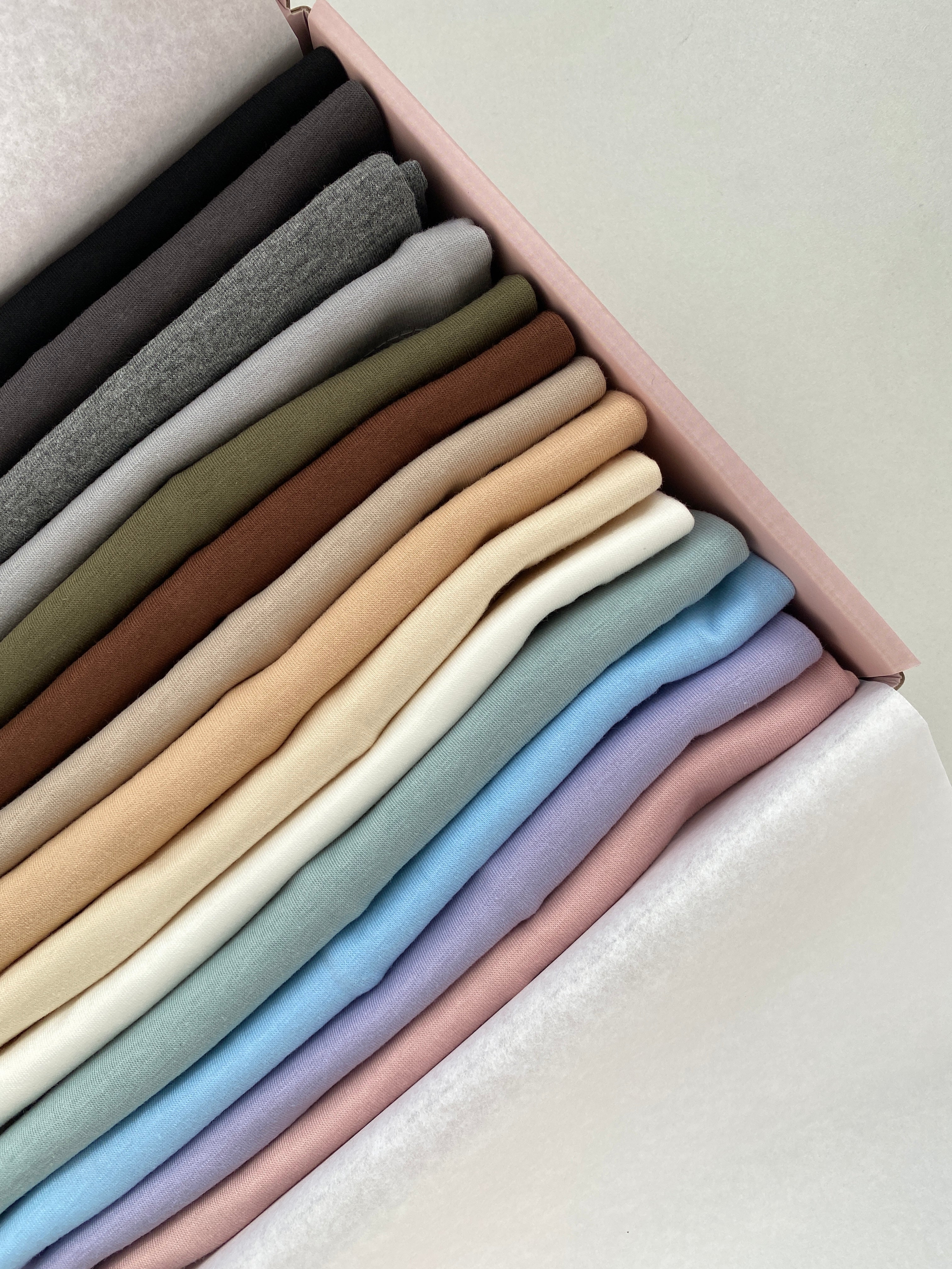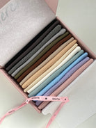 Entdecken Sie unsere exklusive Box mit 14 Schlauchhüten in sanften, neutralen und trendigen Farben, sorgfältig ausgewählt, um zu all Ihren Outfits zu passen.