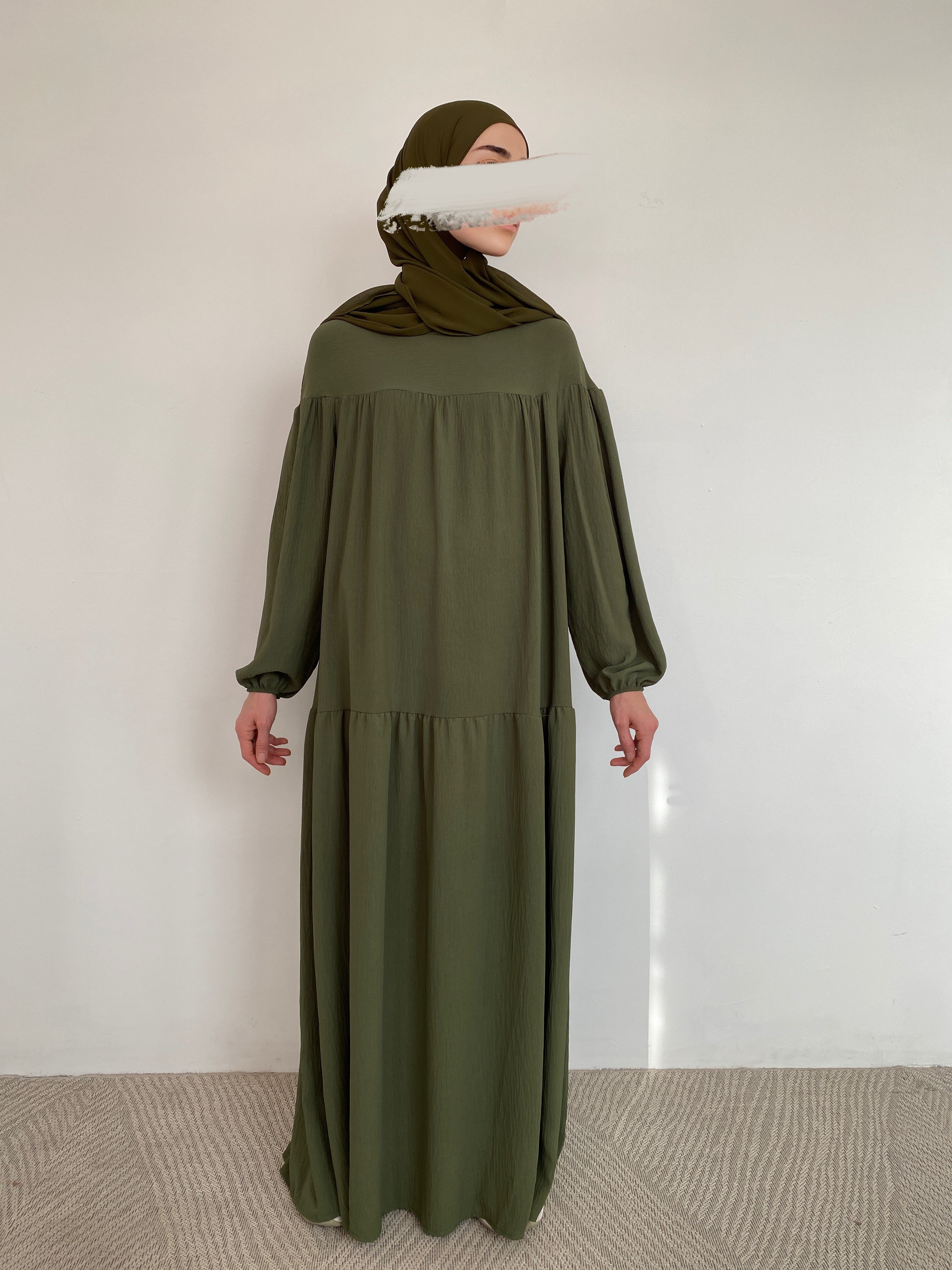 Verlieben Sie sich in diese Abaya mit mehreren Rüschen aus Jazz-Stoffen (Baumwollart, Knittereffekt). Die bauschigen, langen Ärmel werden am Ende durch einen Gummizug festgezogen, sodass sie beim Heben des Arms nicht hochrutschen. Runder Kragen.
