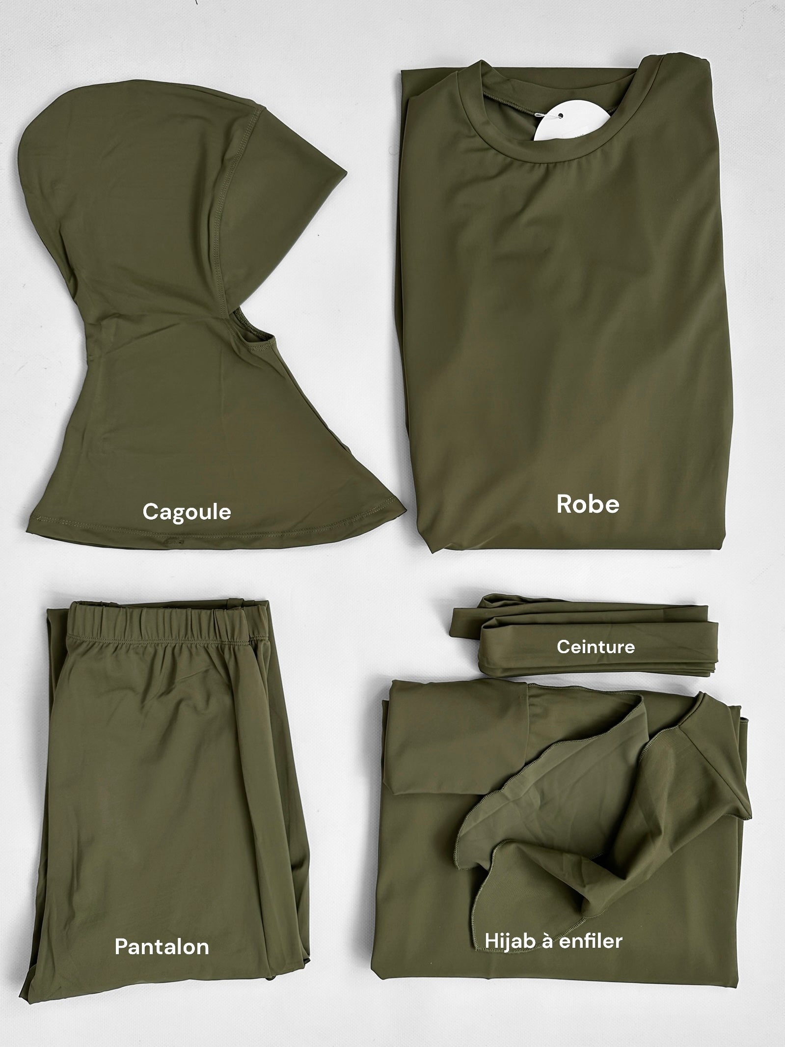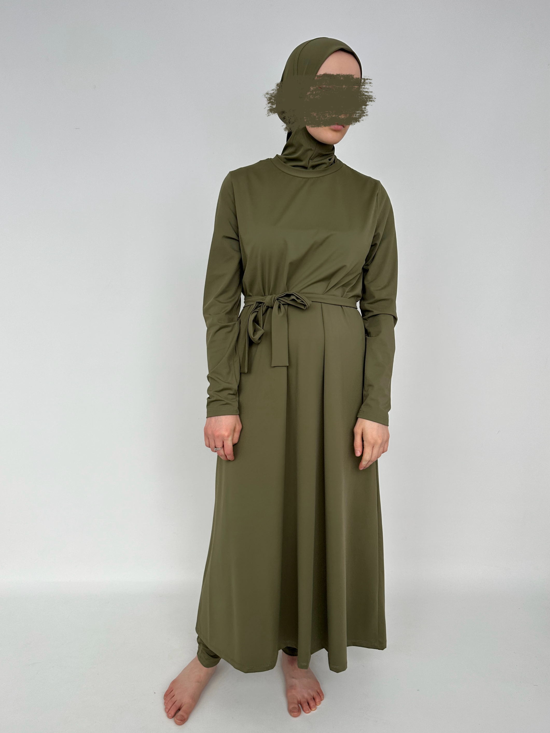 Dieser Burkini ist ein komplettes und schlichtes Outfit. Es besteht aus einem langen Kleid mit Bändern zur Befestigung an den Leggings, wodurch ein Hochrutschen des Kleides verhindert wird. Ich füge noch eine Sturmhaube, einen Hijab mit Stirnband und einen Gürtel hinzu, um das Outfit anzupassen. Mit diesem Burkini kann ich bequem schwimmen und gleichzeitig meine Werte respektieren. Es ist praktisch, elegant und perfekt auf meine Bedürfnisse abgestimmt!