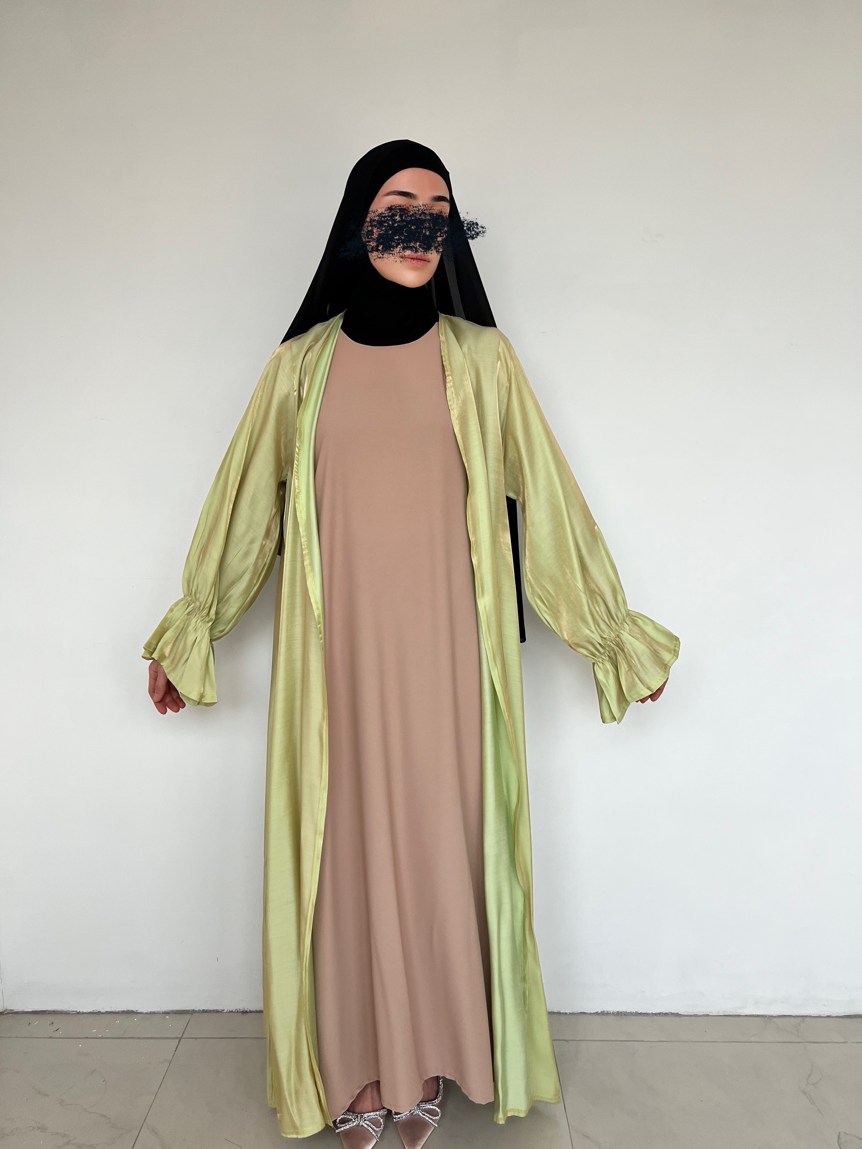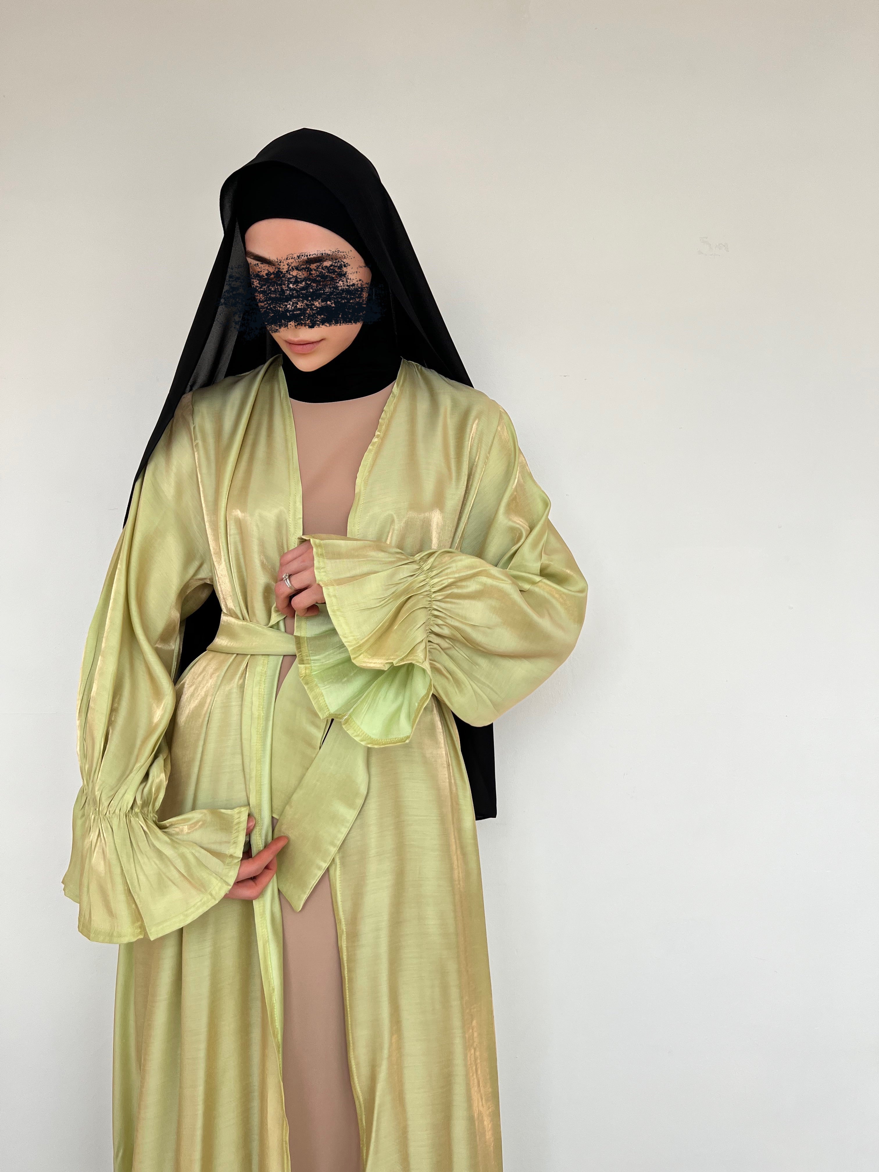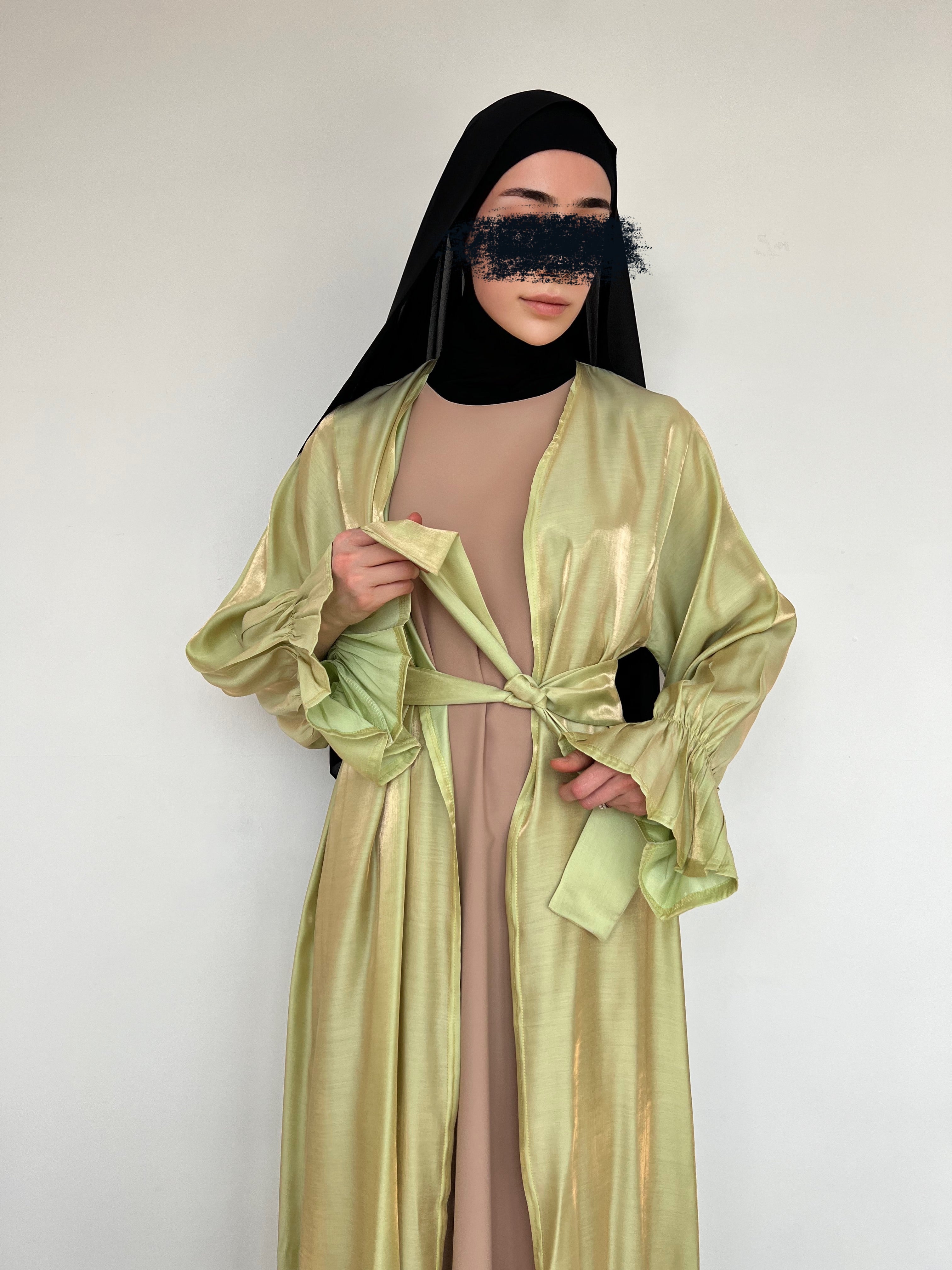 Leichter und eleganter Organza-Kimono, ideal für besondere Anlässe oder Abende. Hergestellt aus einer Stoffart aus transparenten und zarten Stoffen mit Satineffekt und Ballonärmeln, die dem Set einen Hauch von Volumen und Bewegung verleihen.