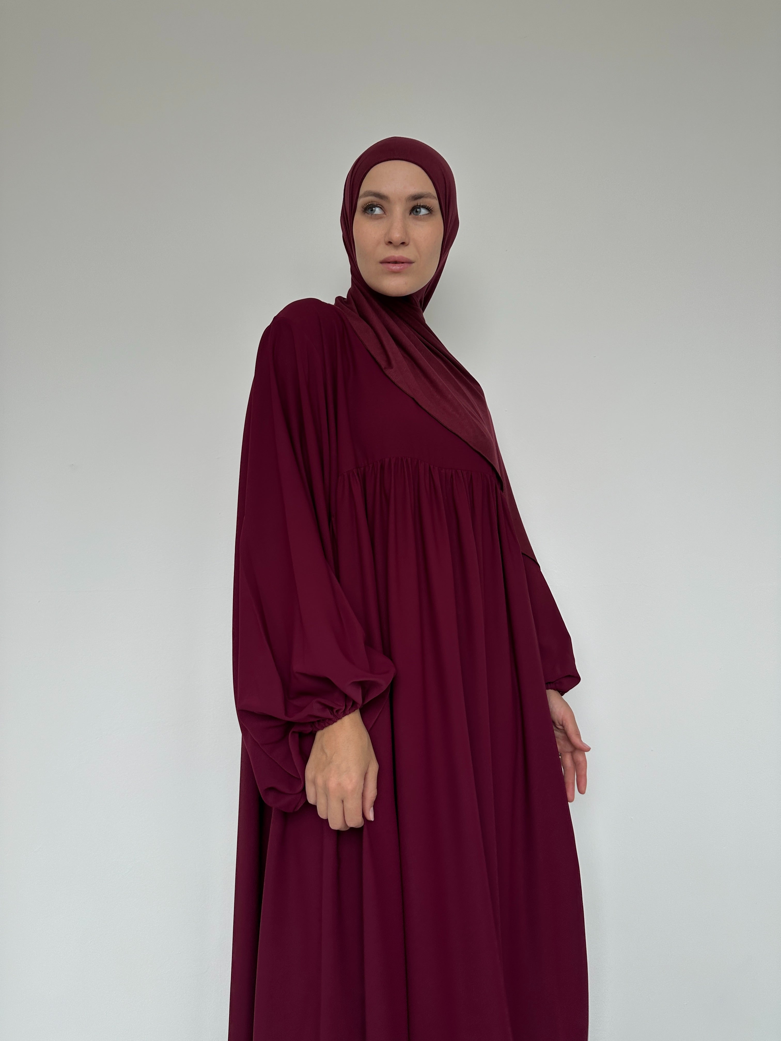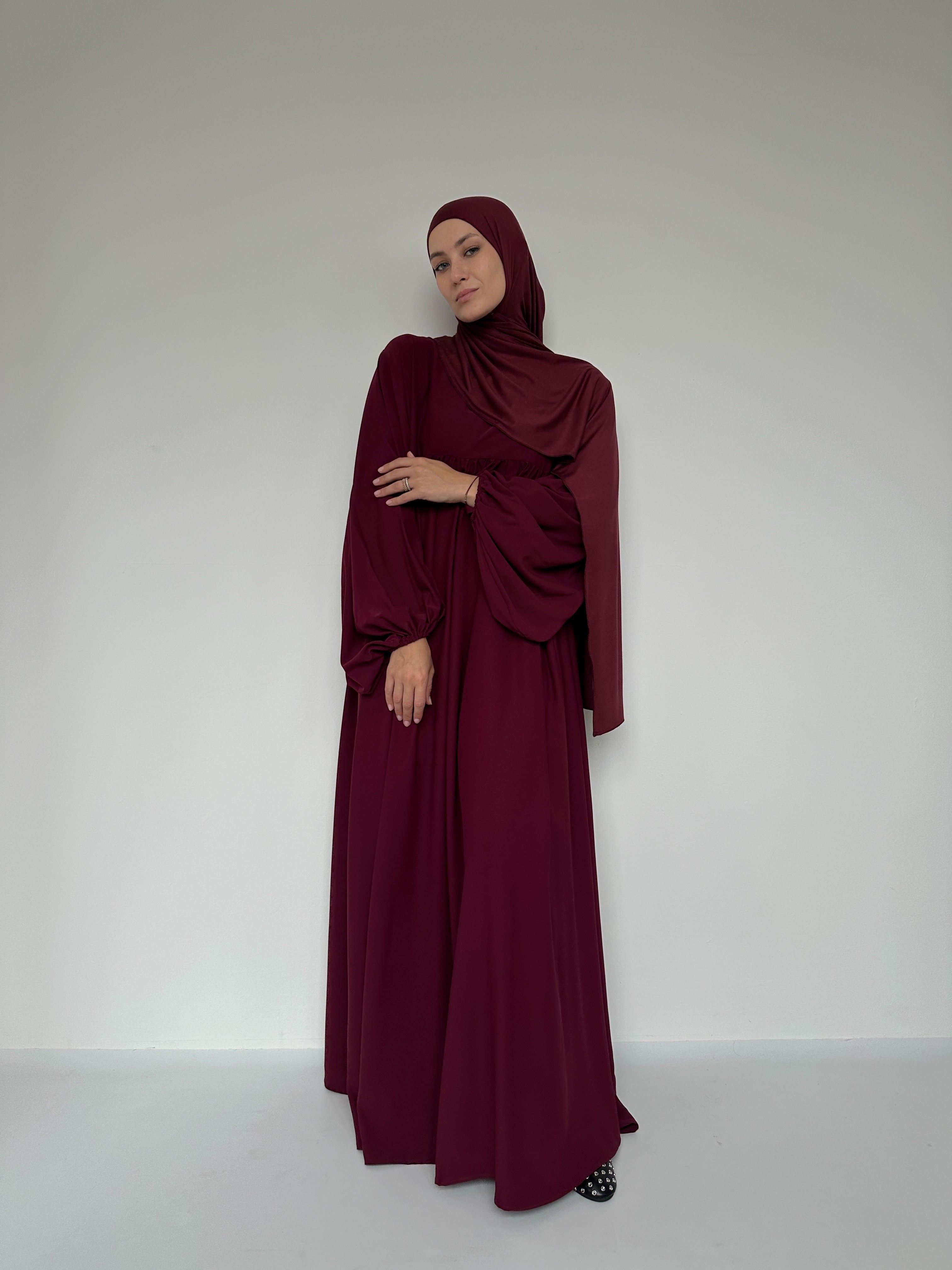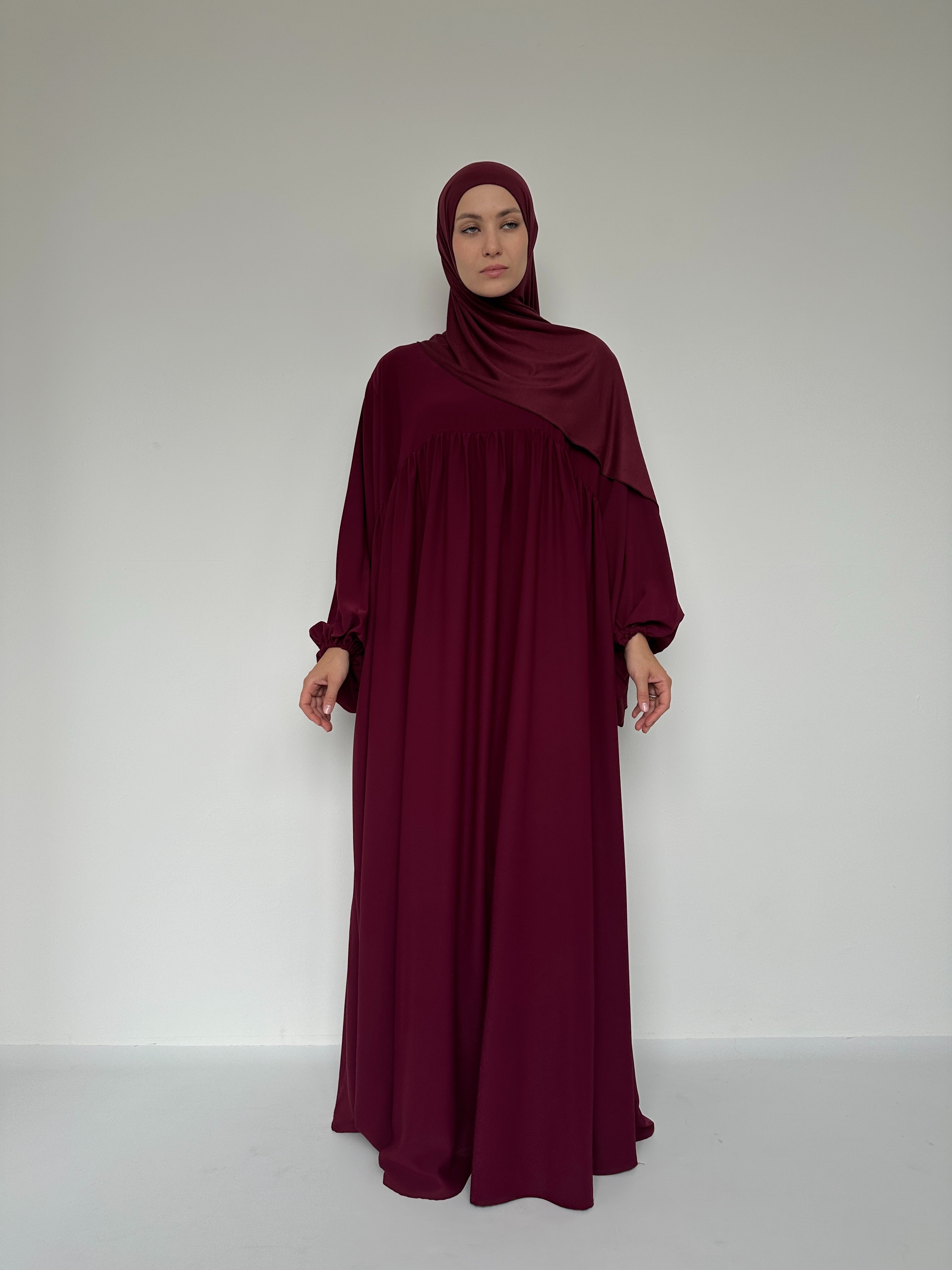 Die Assia-Abaya vereint Minimalismus und Eleganz. Fließender, weicher Stoff, geraffte Brustpartie und luftige Ärmel sorgen für einen raffinierten, komfortablen und femininen Stil.