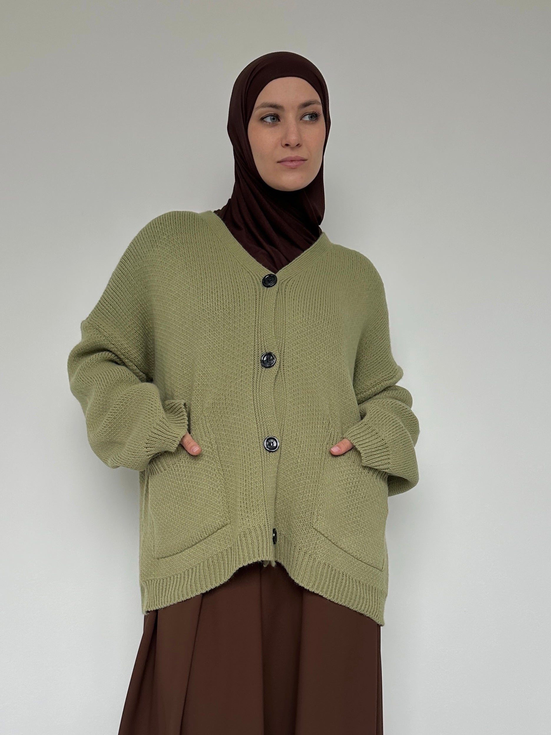 Ein weicher und bequemer Cardigan im minimalistischen Stil. Der Oversized-Schnitt und die überschnittenen Ärmel sorgen für einen modernen und lässigen Look. Ideal für die Übergangszeit: Tragen Sie ihn über einem Kleid, Top oder einer Abaya für einen eleganten und behaglichen Stil.