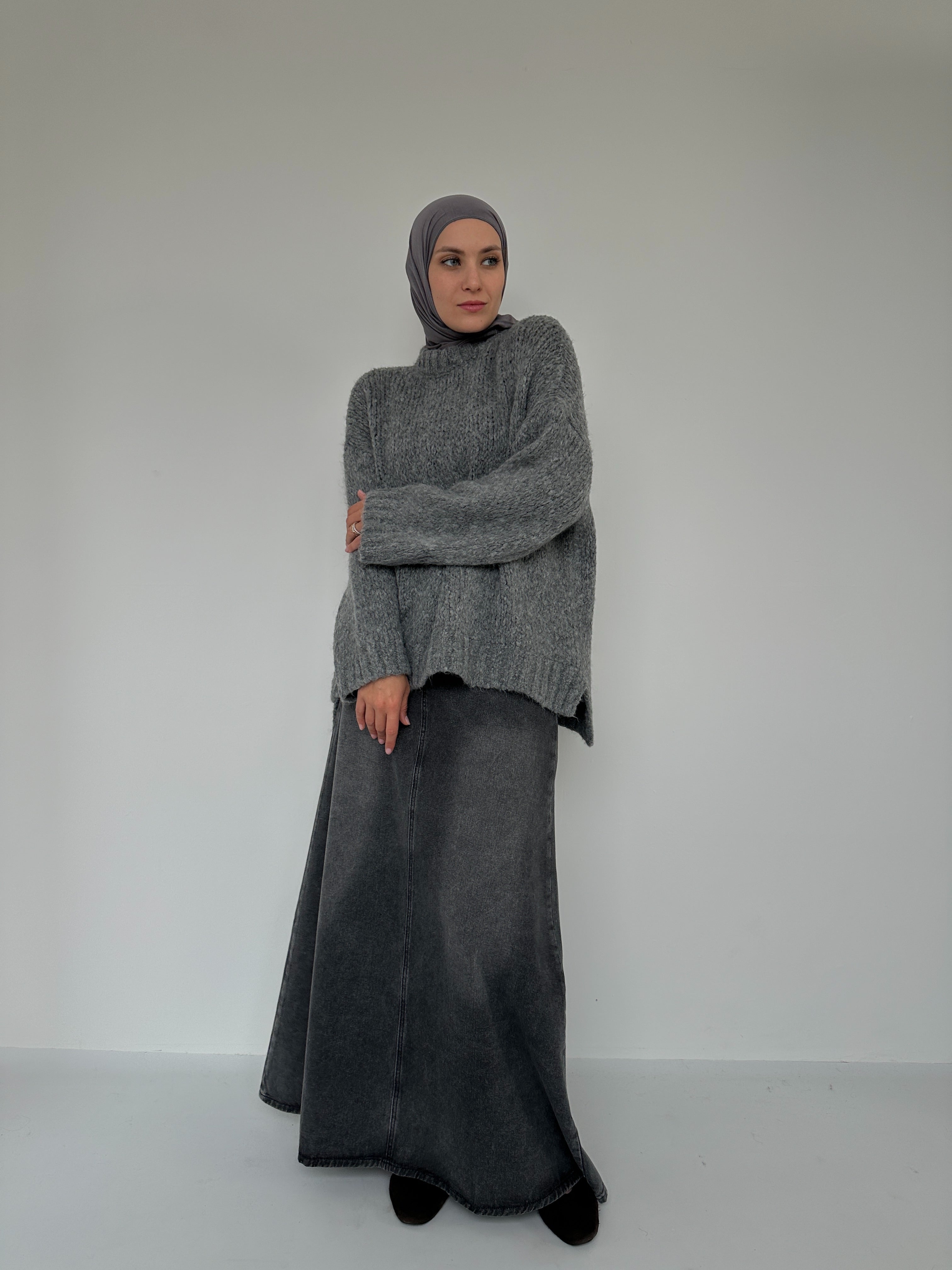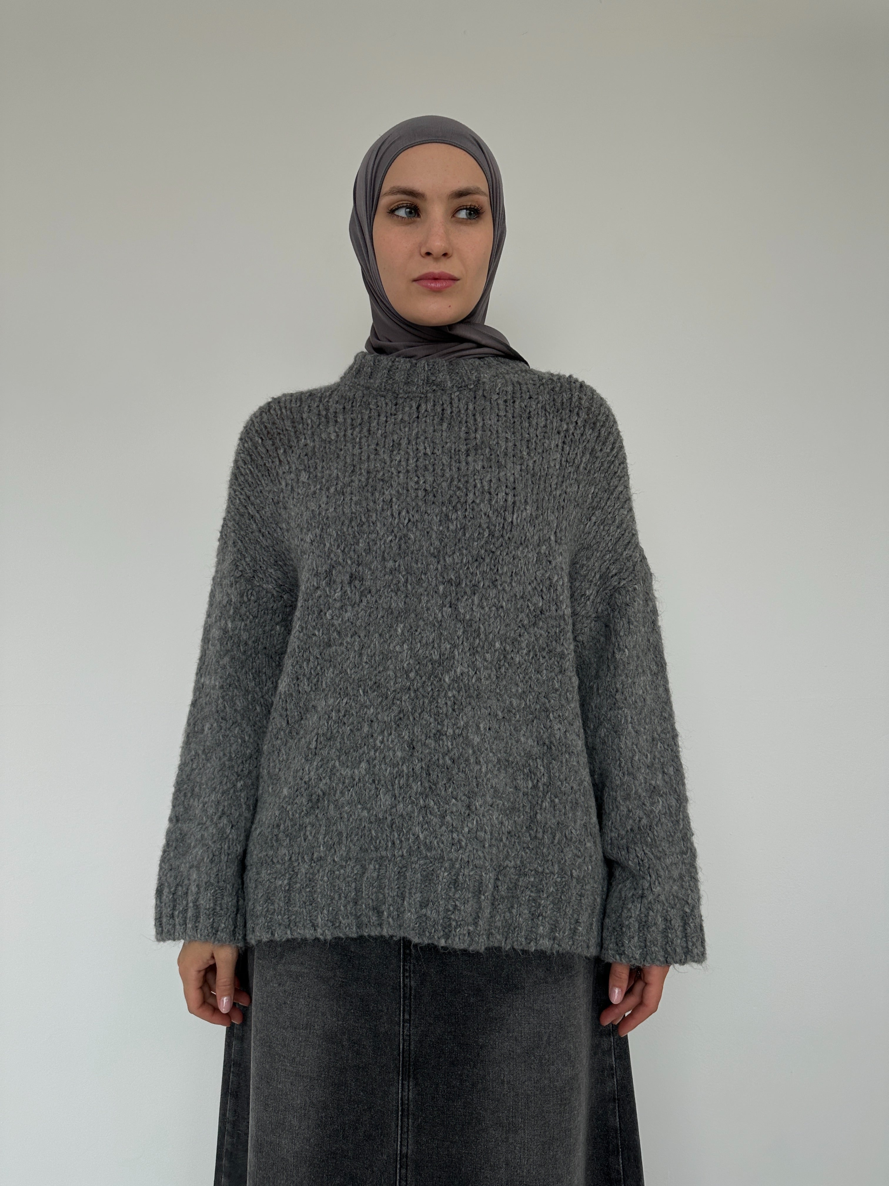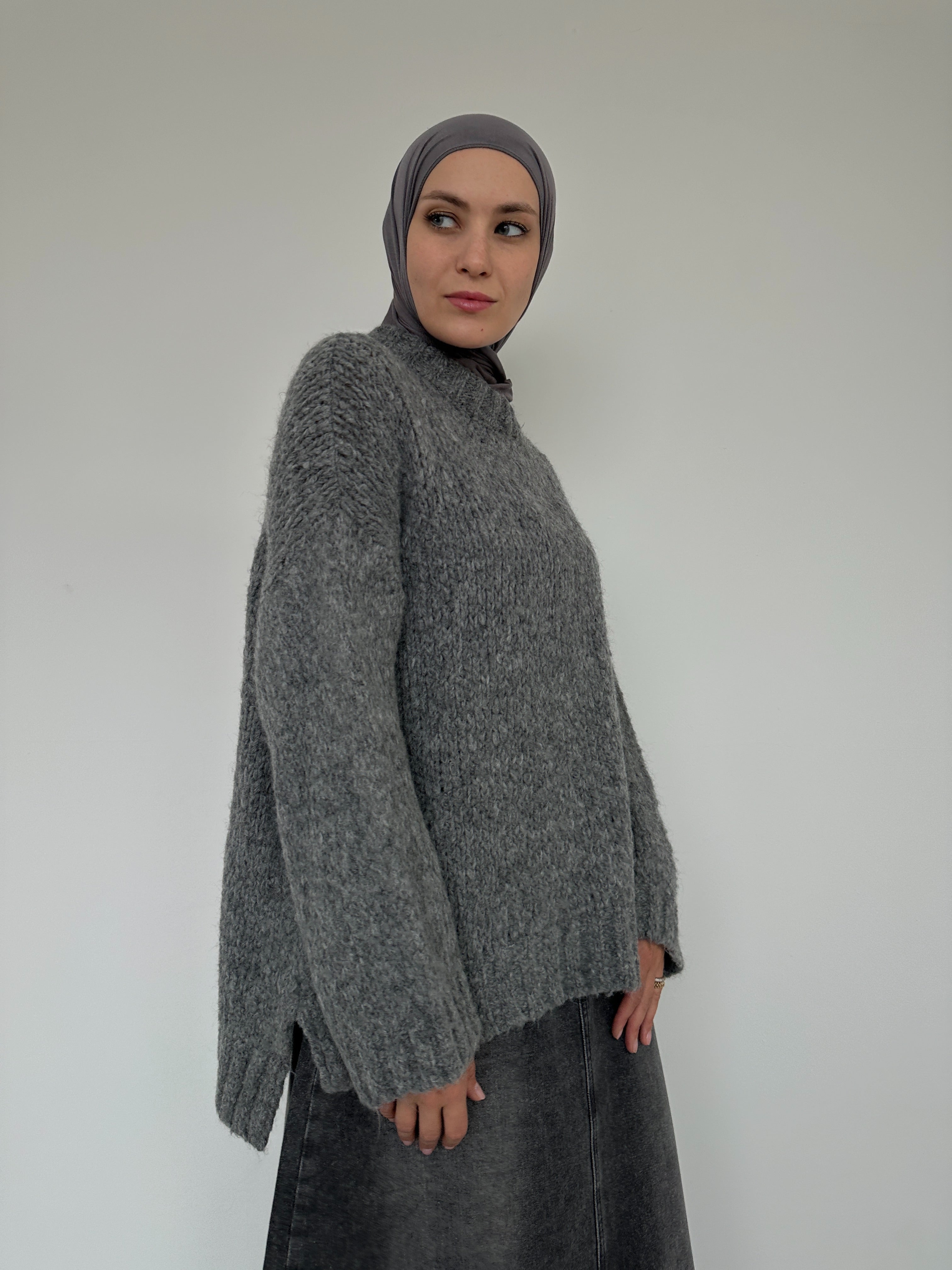 Ein stylischer und bequemer Pullover, perfekt für kühle Tage. Sein leicht asymmetrischer Schnitt (67 cm vorne, 74 cm hinten) verleiht ihm eine moderne und lässige Note. Er lässt sich wunderbar mit einer weiten Hose, einem fließenden Rock oder einem Mantel kombinieren.