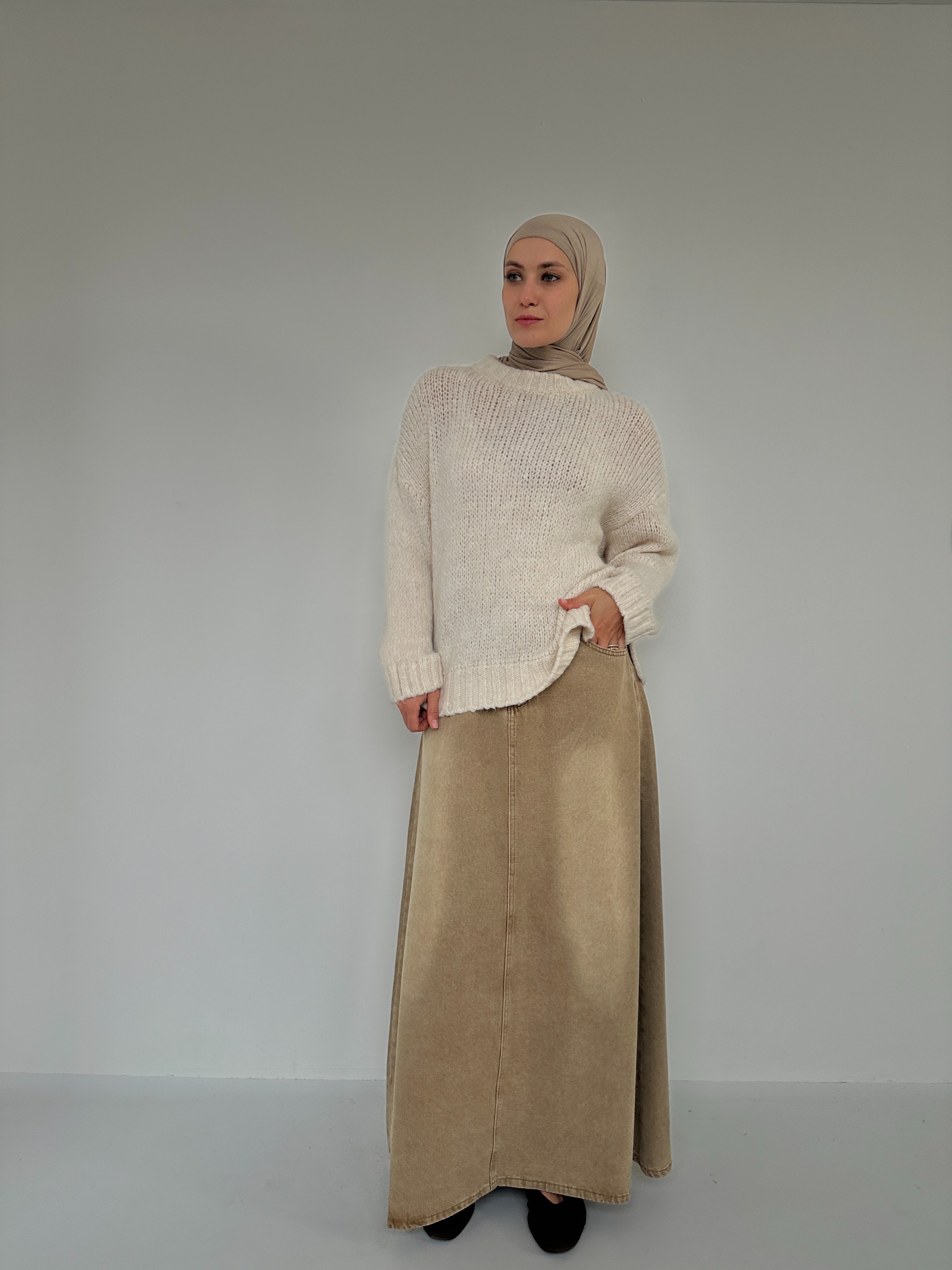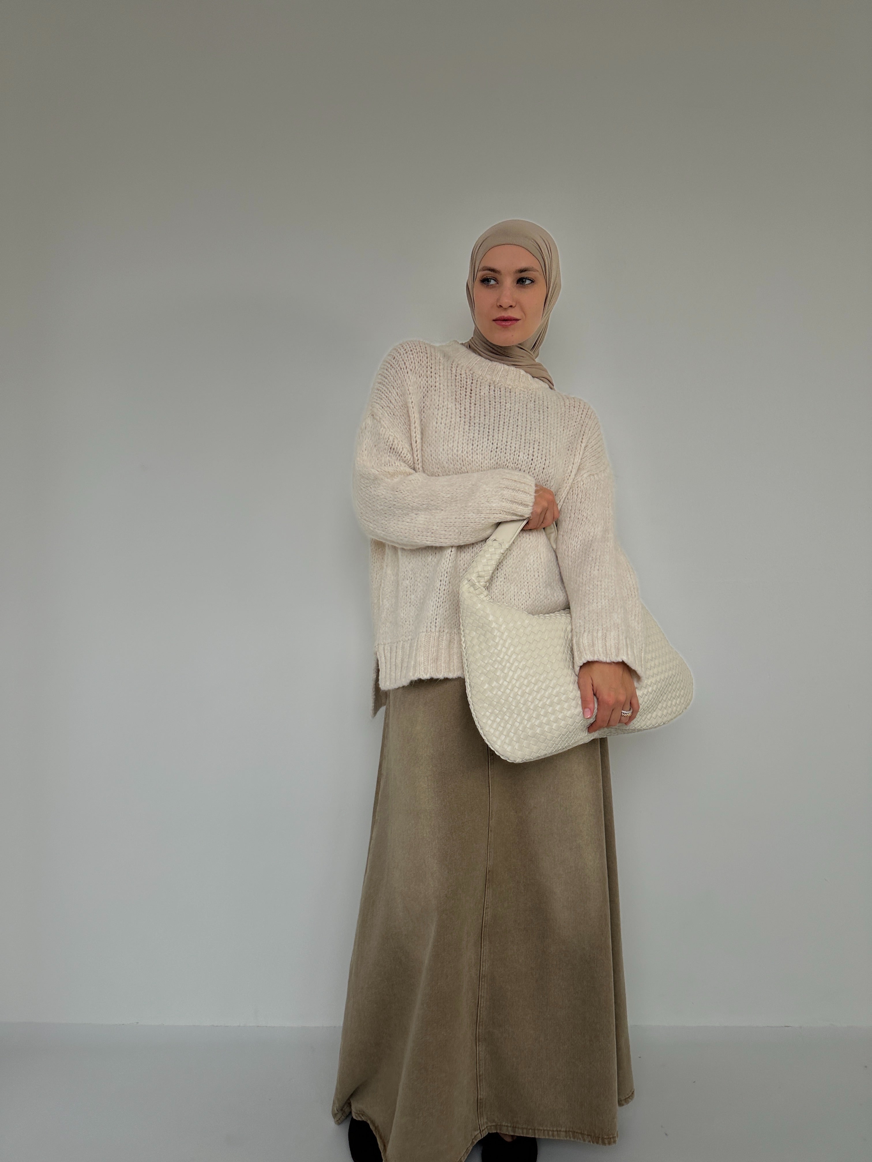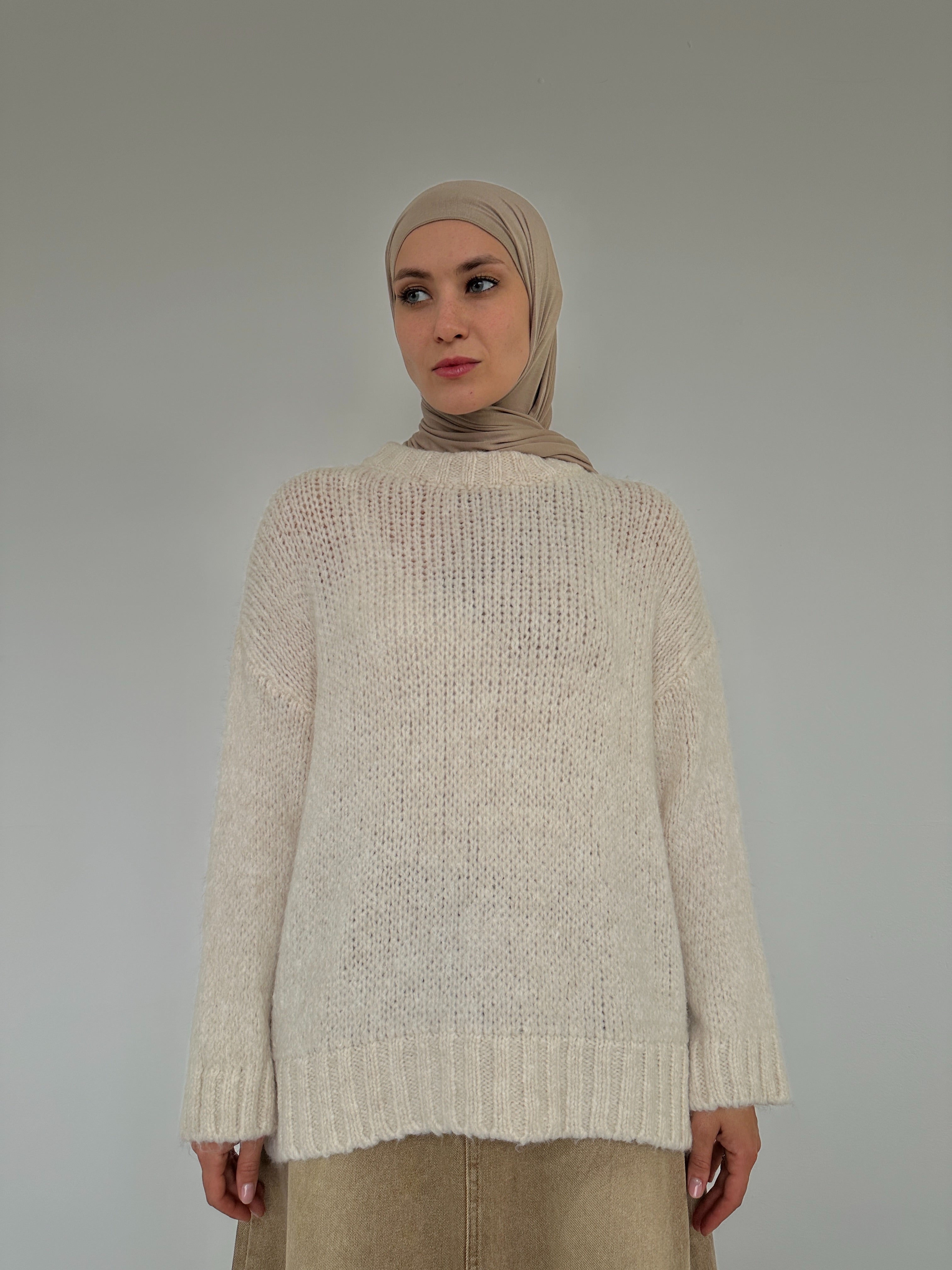 Ein stylischer und bequemer Pullover, perfekt für kühle Tage. Sein leicht asymmetrischer Schnitt (67 cm vorne, 74 cm hinten) verleiht ihm eine moderne und lässige Note. Er lässt sich wunderbar mit einer weiten Hose, einem fließenden Rock oder einem Mantel kombinieren.