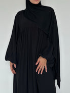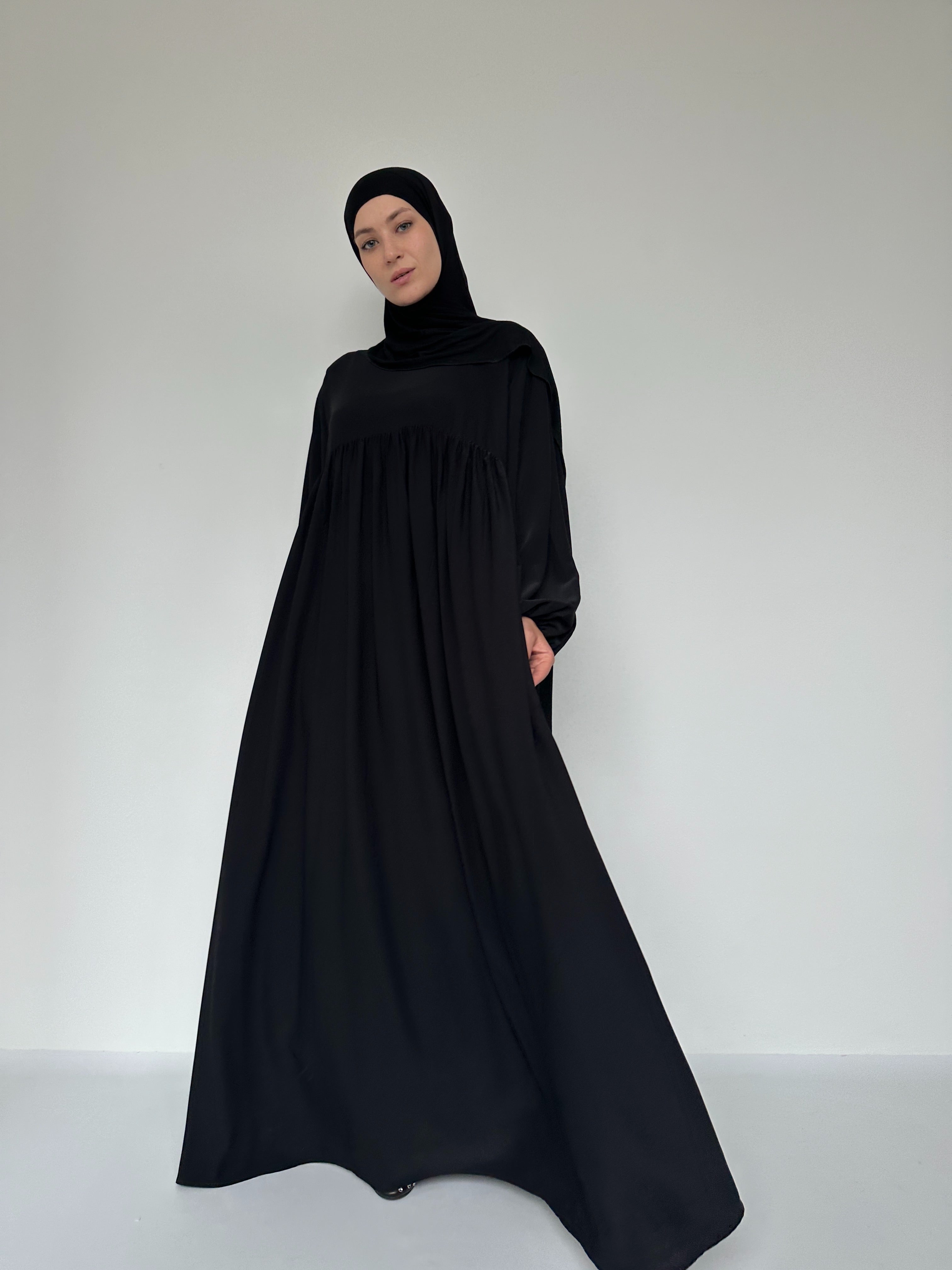 Die Assia-Abaya vereint Minimalismus und Eleganz. Fließender, weicher Stoff, geraffte Brustpartie und luftige Ärmel sorgen für einen raffinierten, komfortablen und femininen Stil.