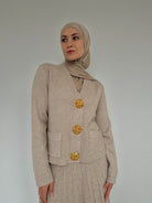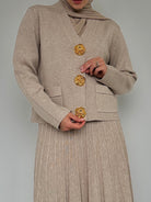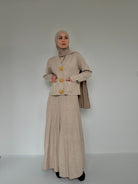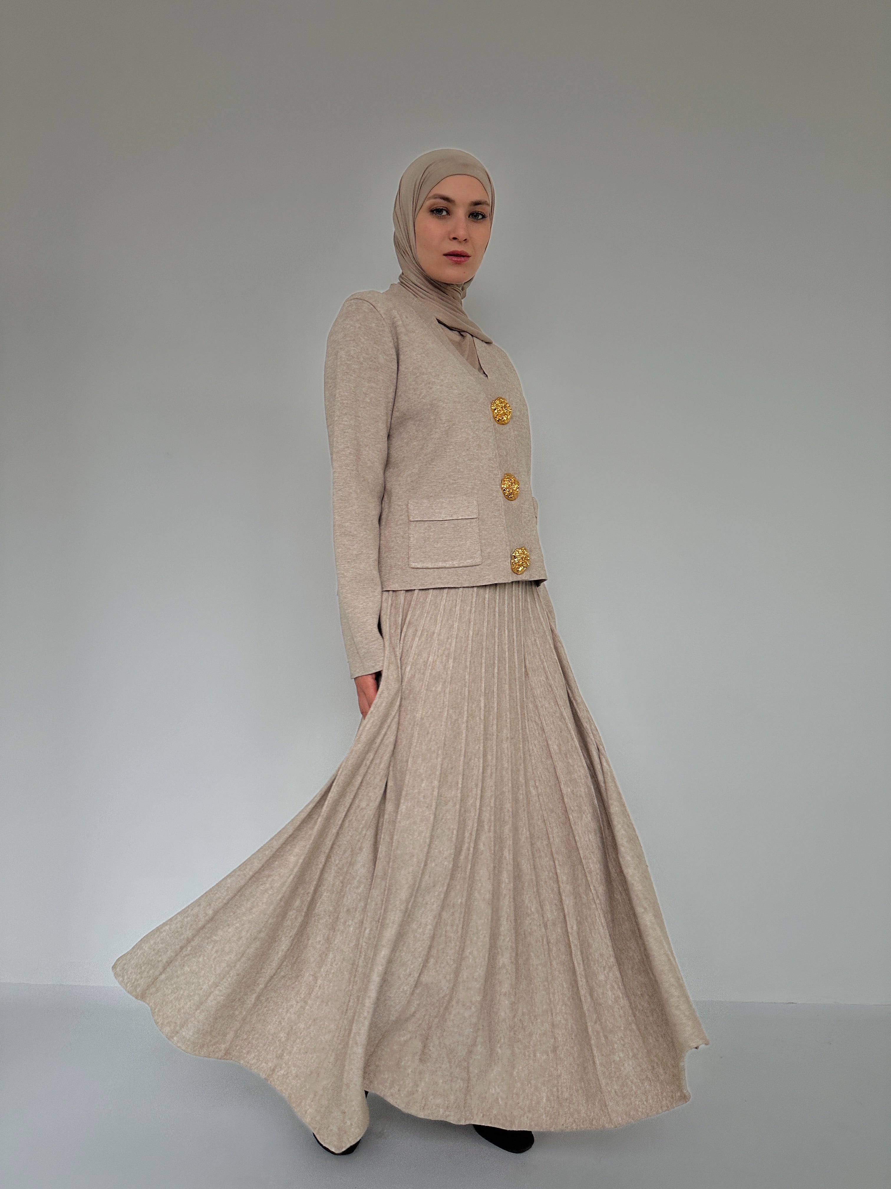 Das Outfit ist ein aufeinander abgestimmtes Strickensemble, bestehend aus einem langen Faltenrock und einer kurzen Weste oder Strickjacke in einem hellen, neutralen Farbton. Die Strickjacke ist mit großen goldenen Knöpfen verziert.