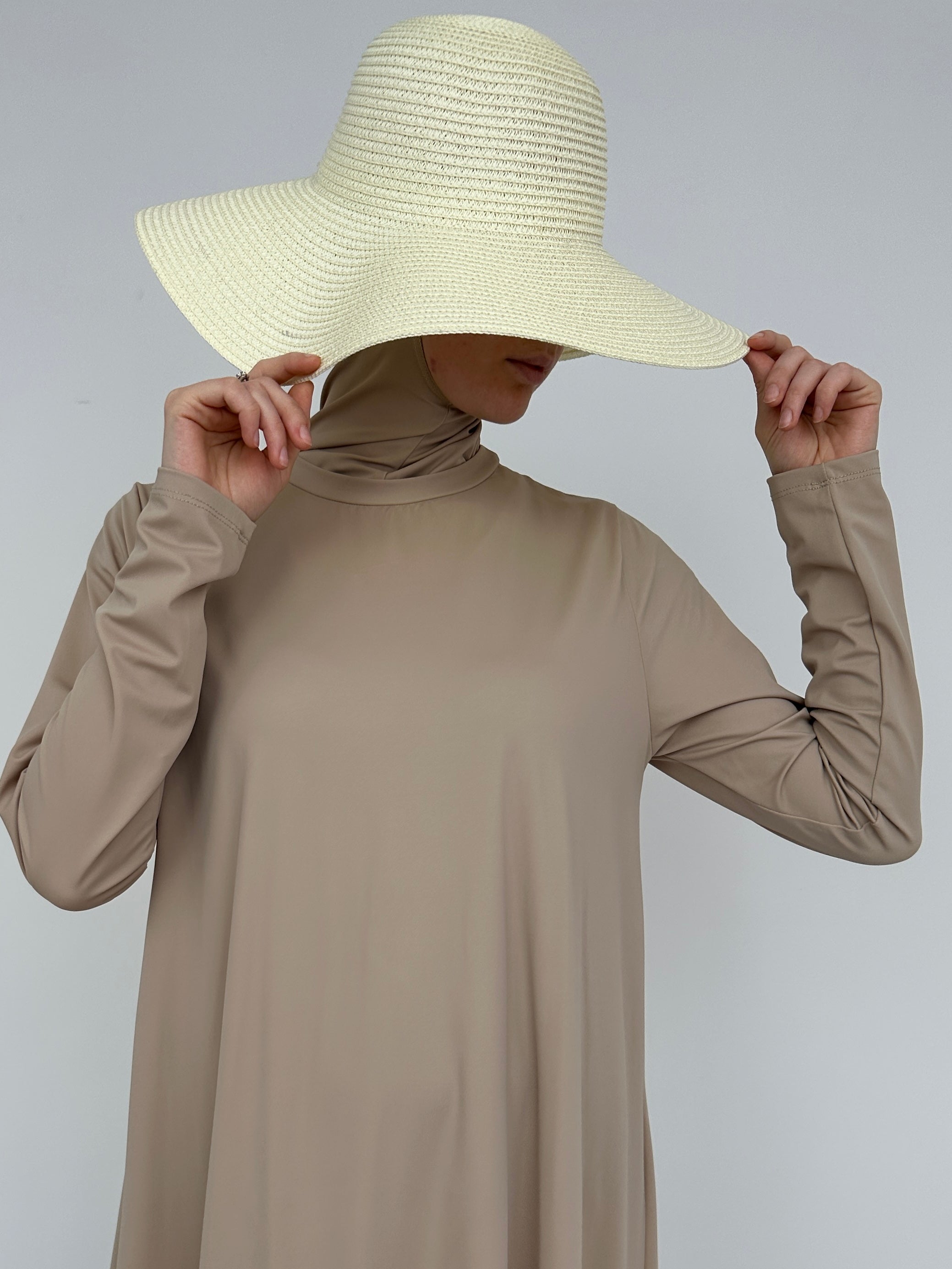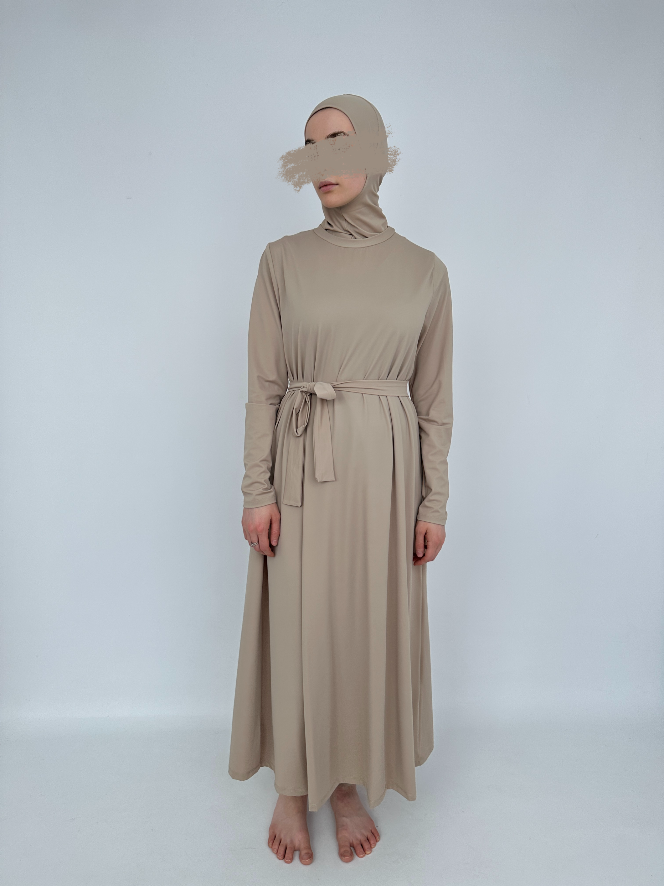 Dieser Burkini ist ein komplettes und schlichtes Outfit. Es besteht aus einem langen Kleid mit Bändern zur Befestigung an den Leggings, wodurch ein Hochrutschen des Kleides verhindert wird. Ich füge noch eine Sturmhaube, einen Hijab mit Stirnband und einen Gürtel hinzu, um das Outfit anzupassen. Mit diesem Burkini kann ich bequem schwimmen und gleichzeitig meine Werte respektieren. Es ist praktisch, elegant und perfekt auf meine Bedürfnisse abgestimmt!