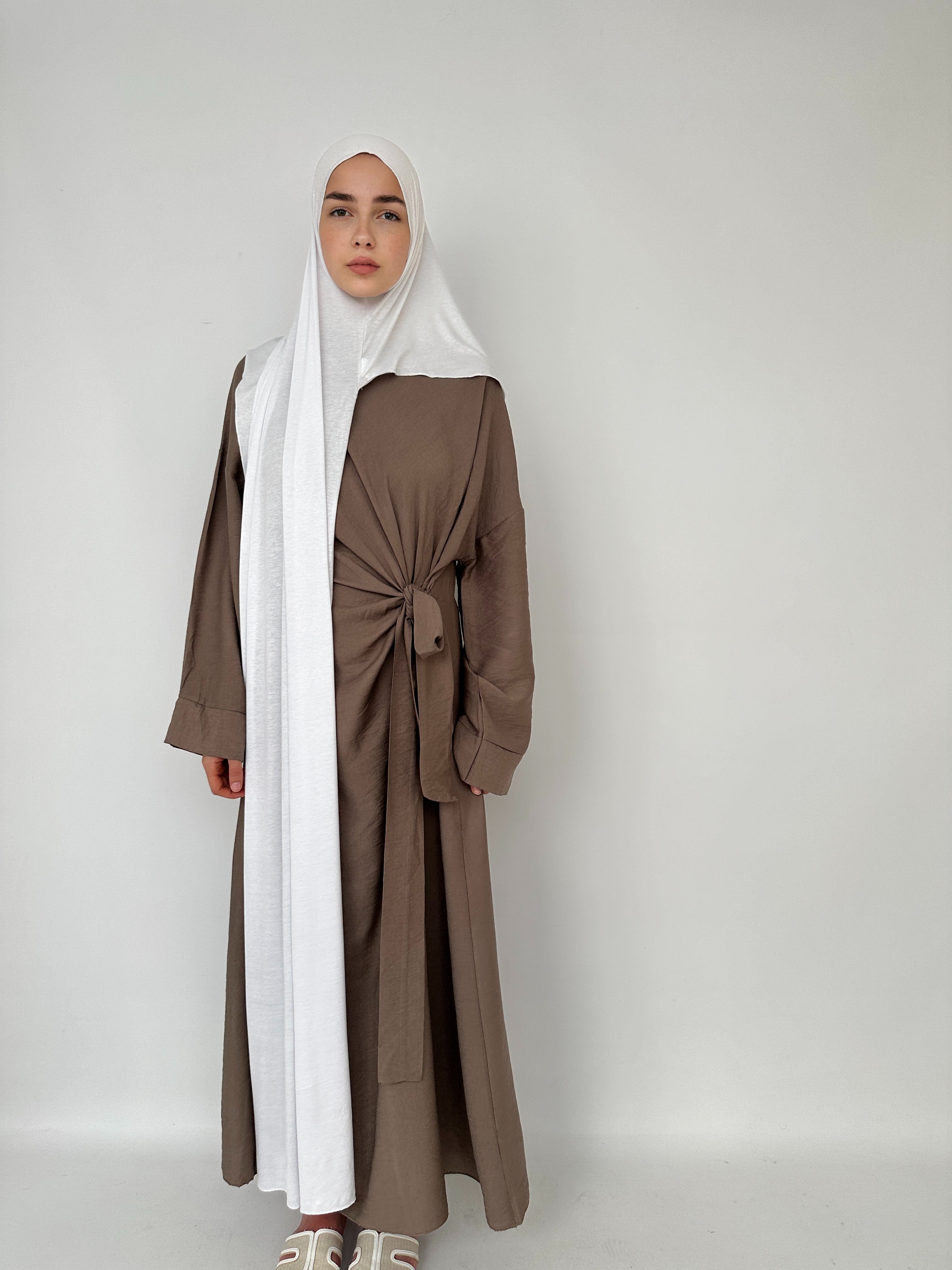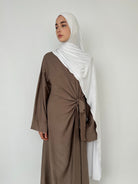 - Falten Sie den Hijab der Länge nach in zwei Hälften, um die Breite zu verringern, wickeln Sie ihn um den Kopf und binden Sie die Enden hinten oder an der Seite zusammen, um einen modernen und schicken Look zu erzielen.