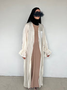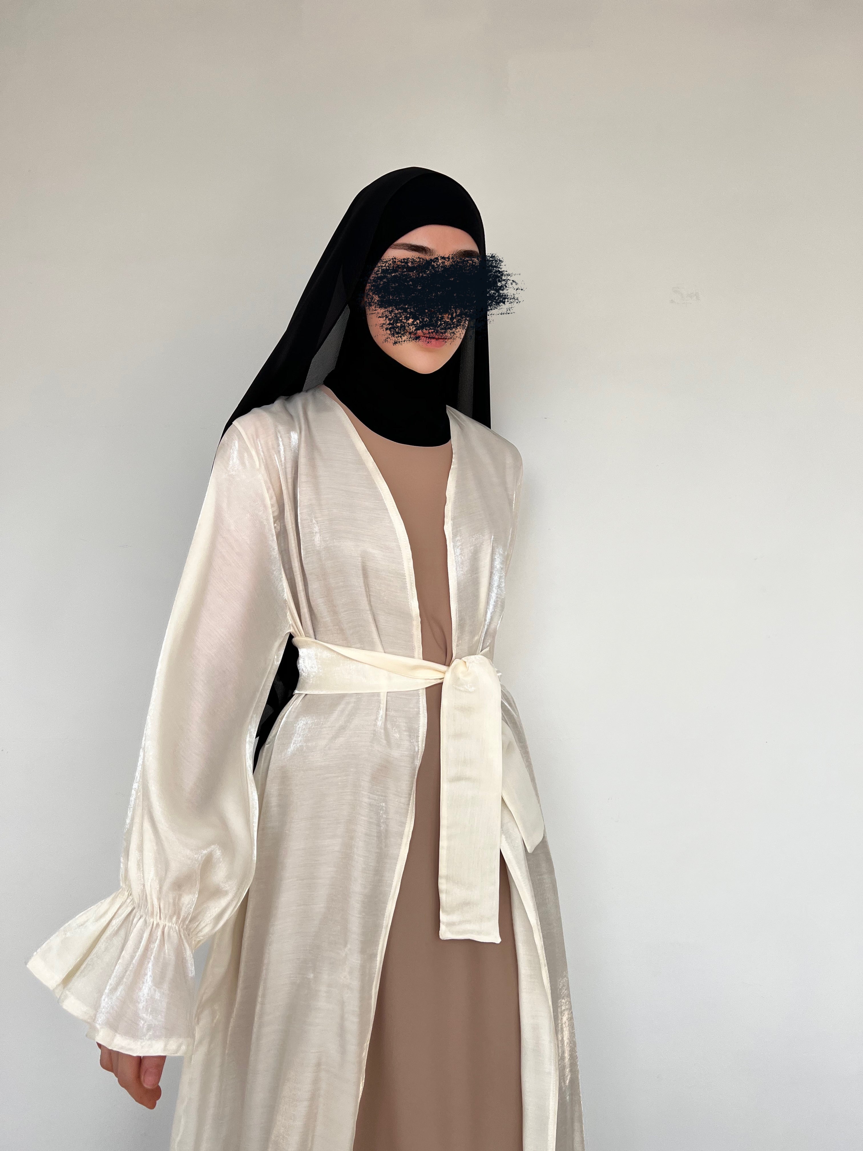 Leichter und eleganter Organza-Kimono, ideal für besondere Anlässe oder Abende. Hergestellt aus einer Stoffart aus transparenten und zarten Stoffen mit Satineffekt und Ballonärmeln, die dem Set einen Hauch von Volumen und Bewegung verleihen.