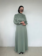 Evening dress in satin material with raised collar adorned with rhinestones. Wrap effect at chest level, the dress is completely covering. Its long sleeves are also finished with rhinestones. The belt is included.