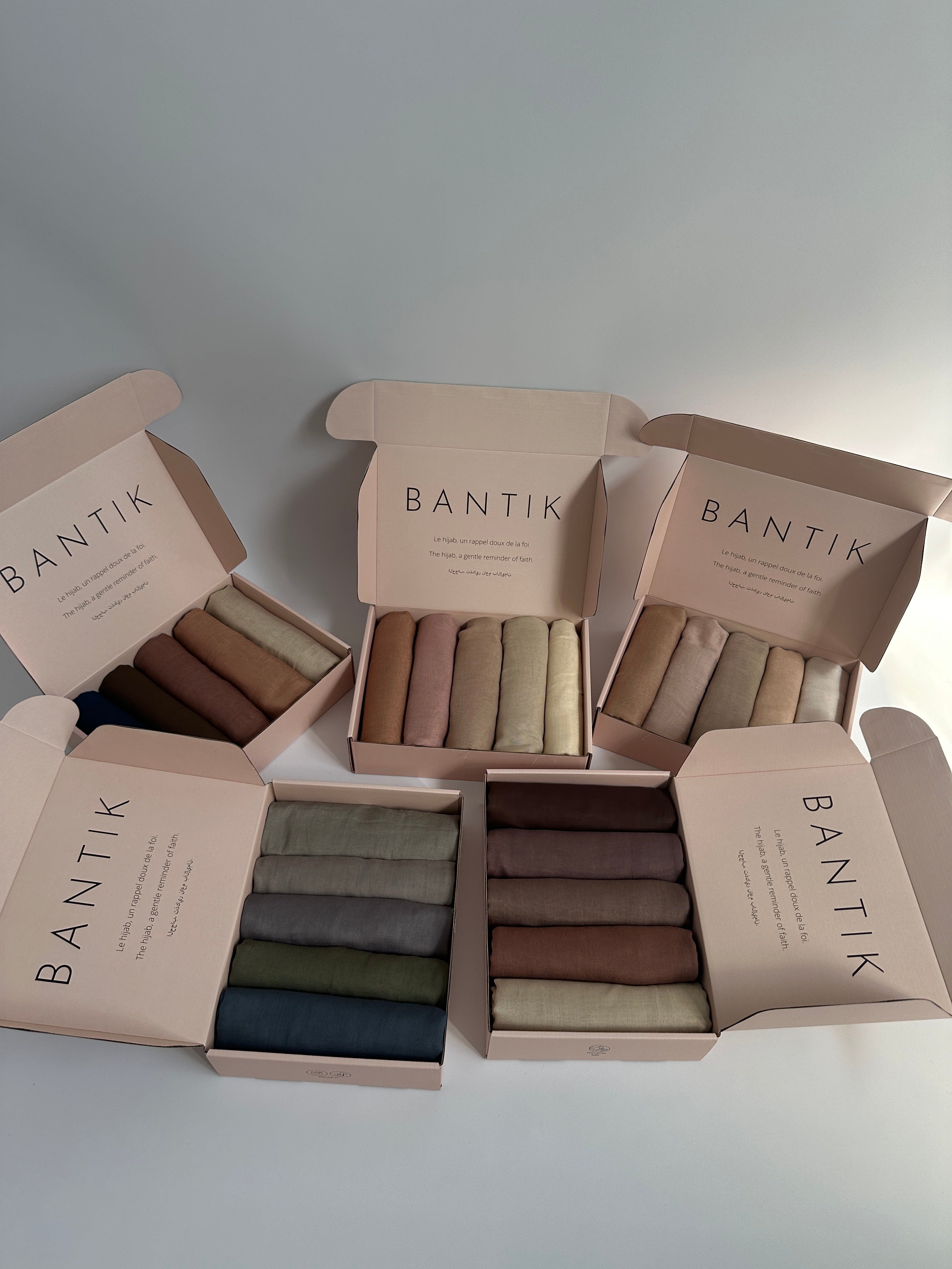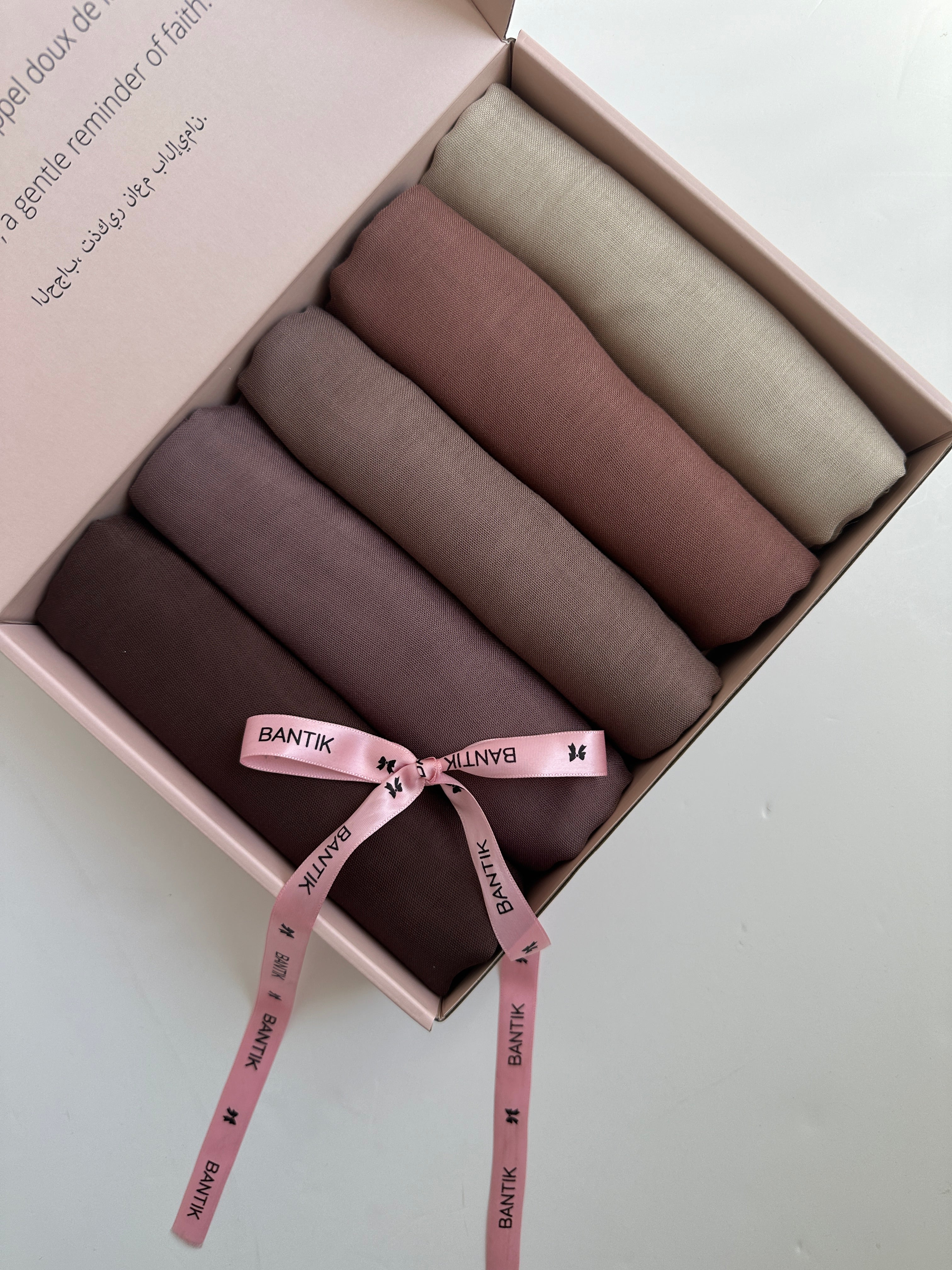 Bring softness, elegance and simplicity to your wardrobe with this exclusive box composed of 5 hijabs in warm and natural shades.