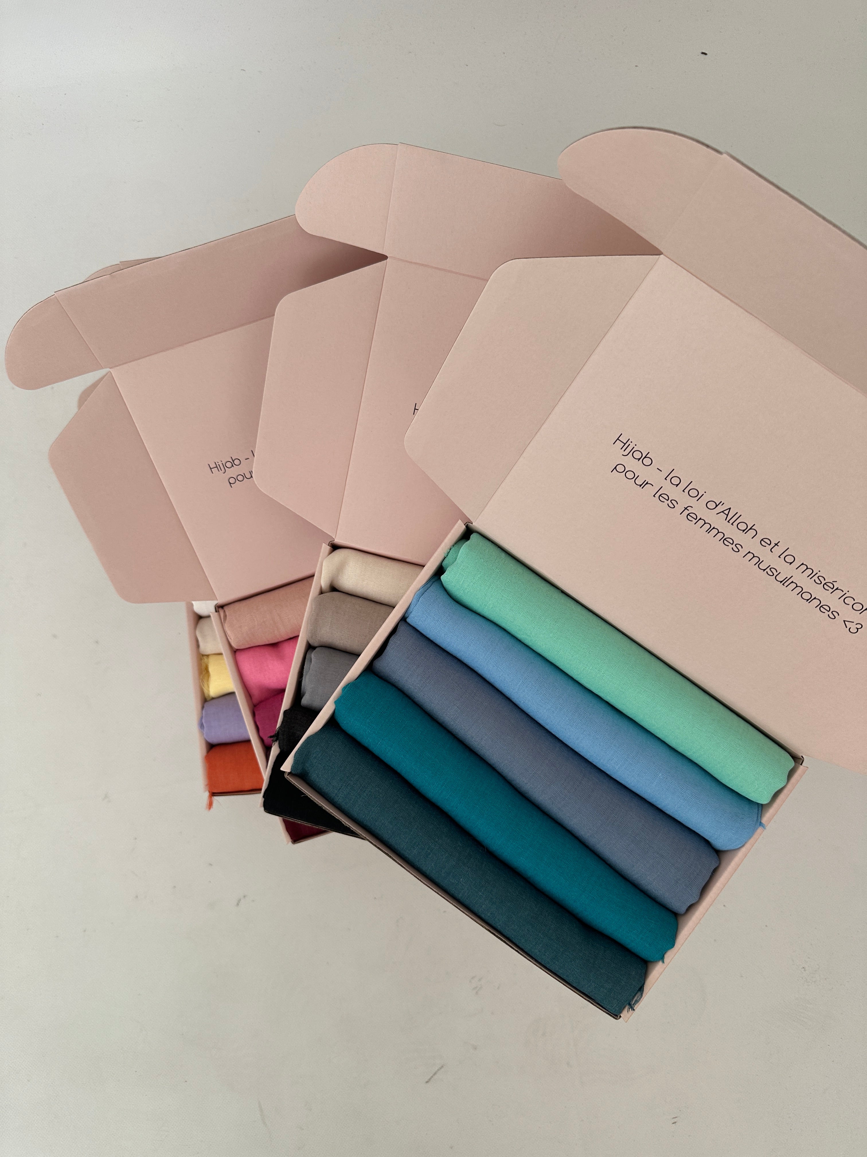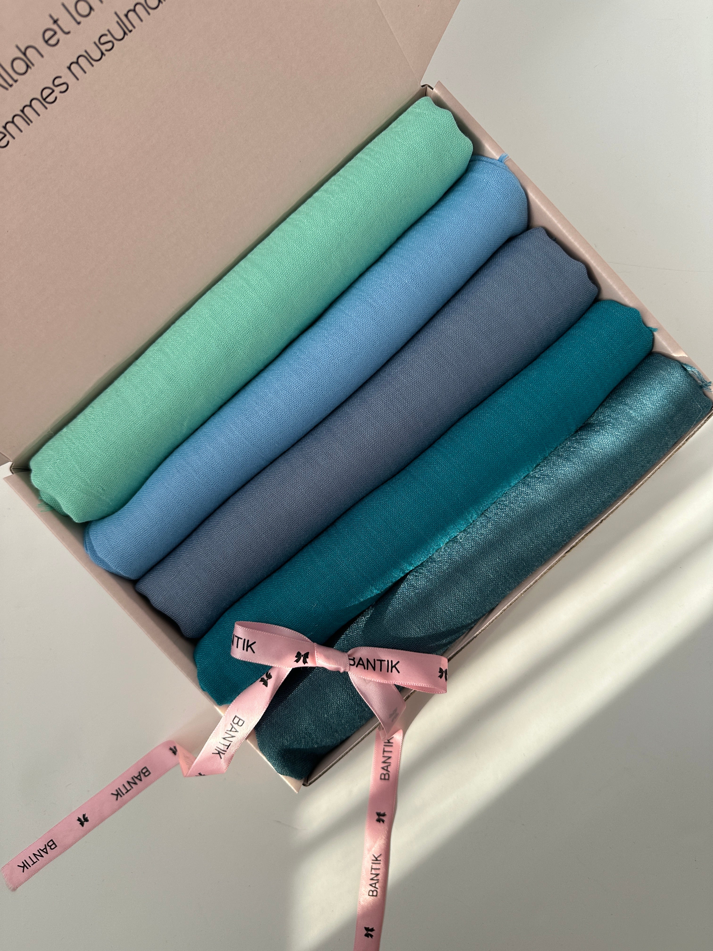 Be inspired by the freshness and depth of this aquatic-hued box. Featuring five soft, flowing modal hijabs, this selection evokes the sea, sky, and serenity.