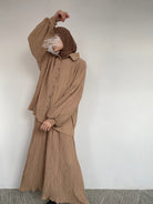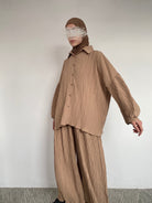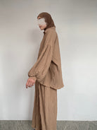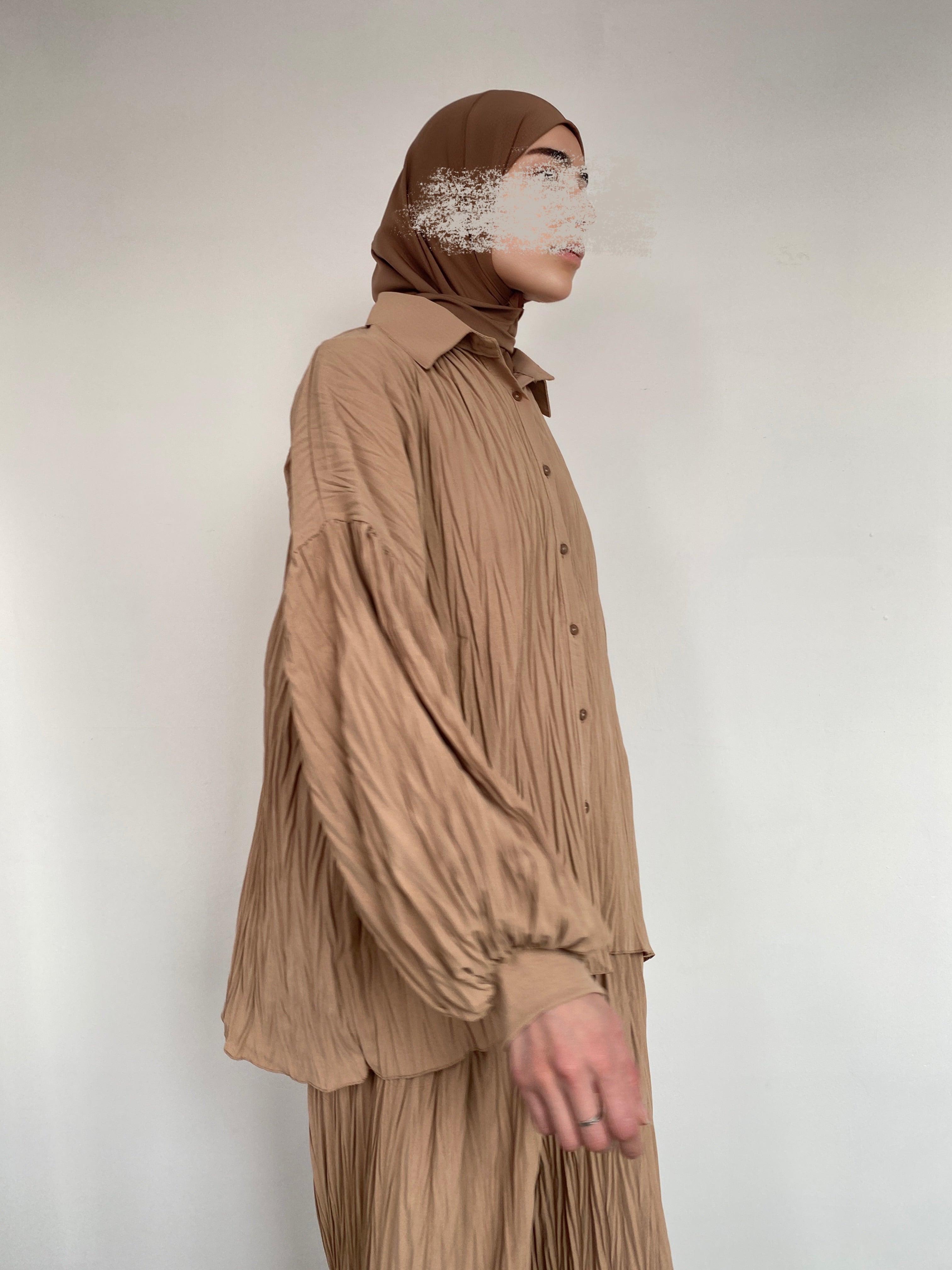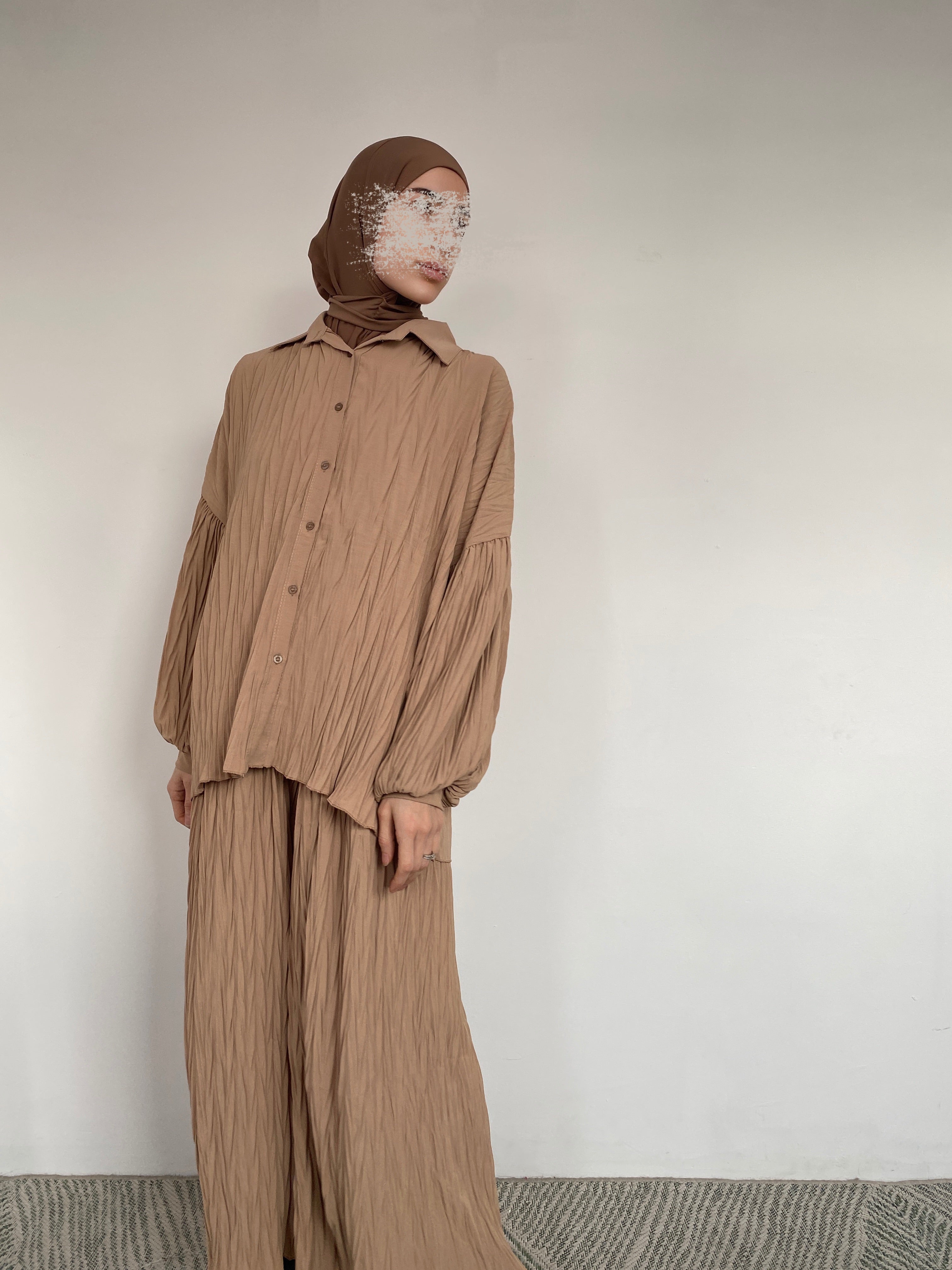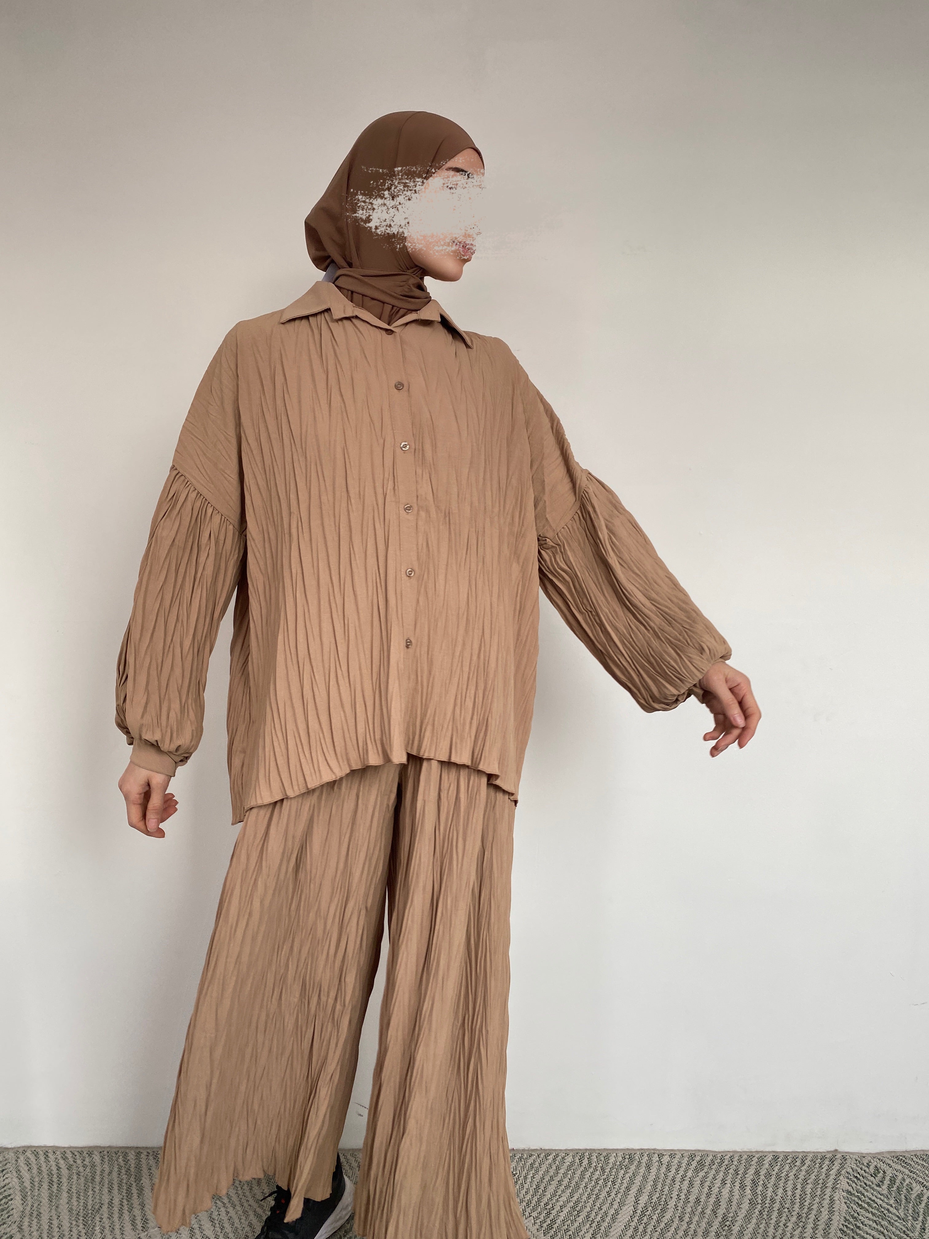 Set consisting of a shirt and wide trousers. Pleated effect. Shirt with puff sleeves and buttoned hem.