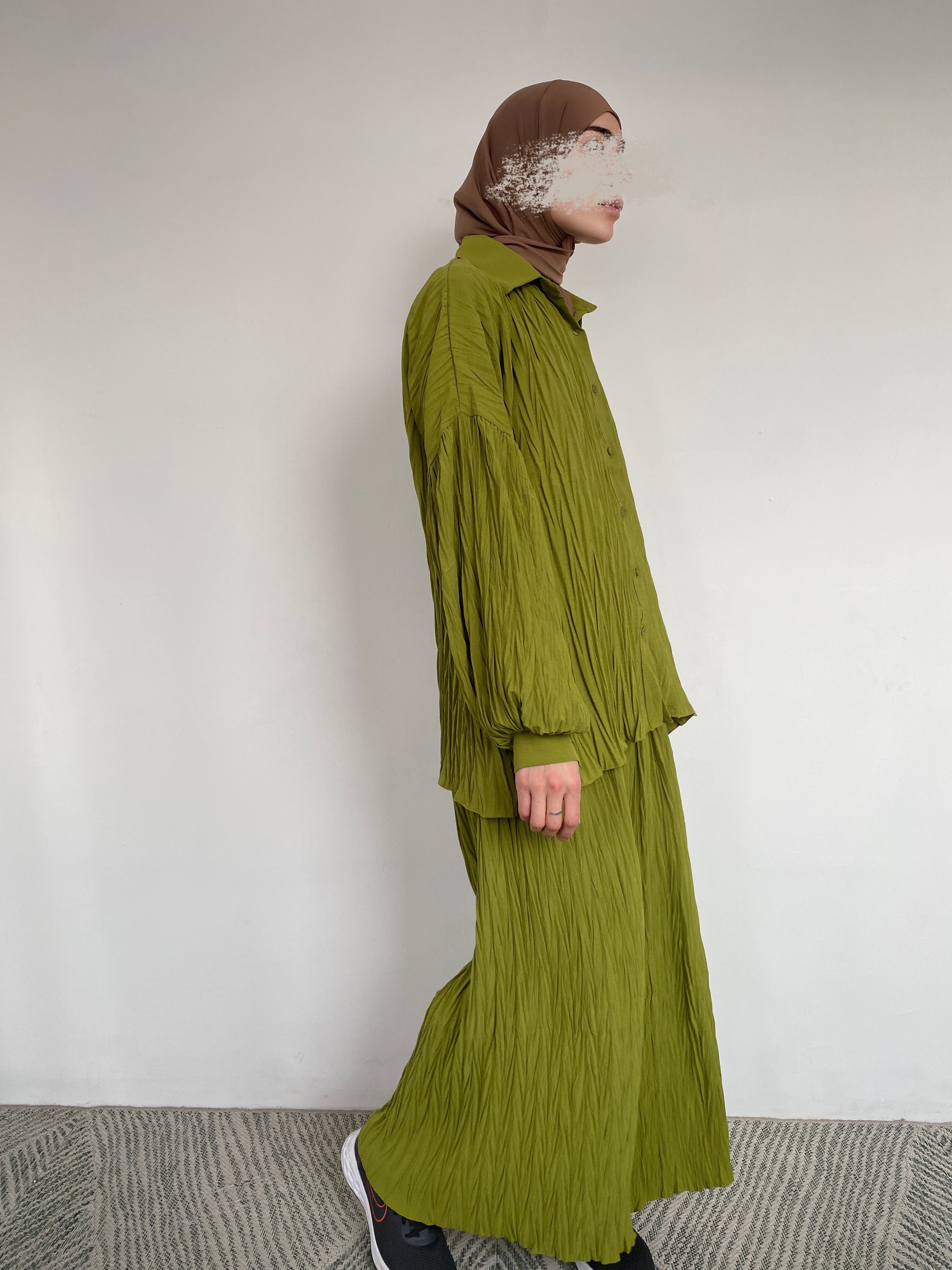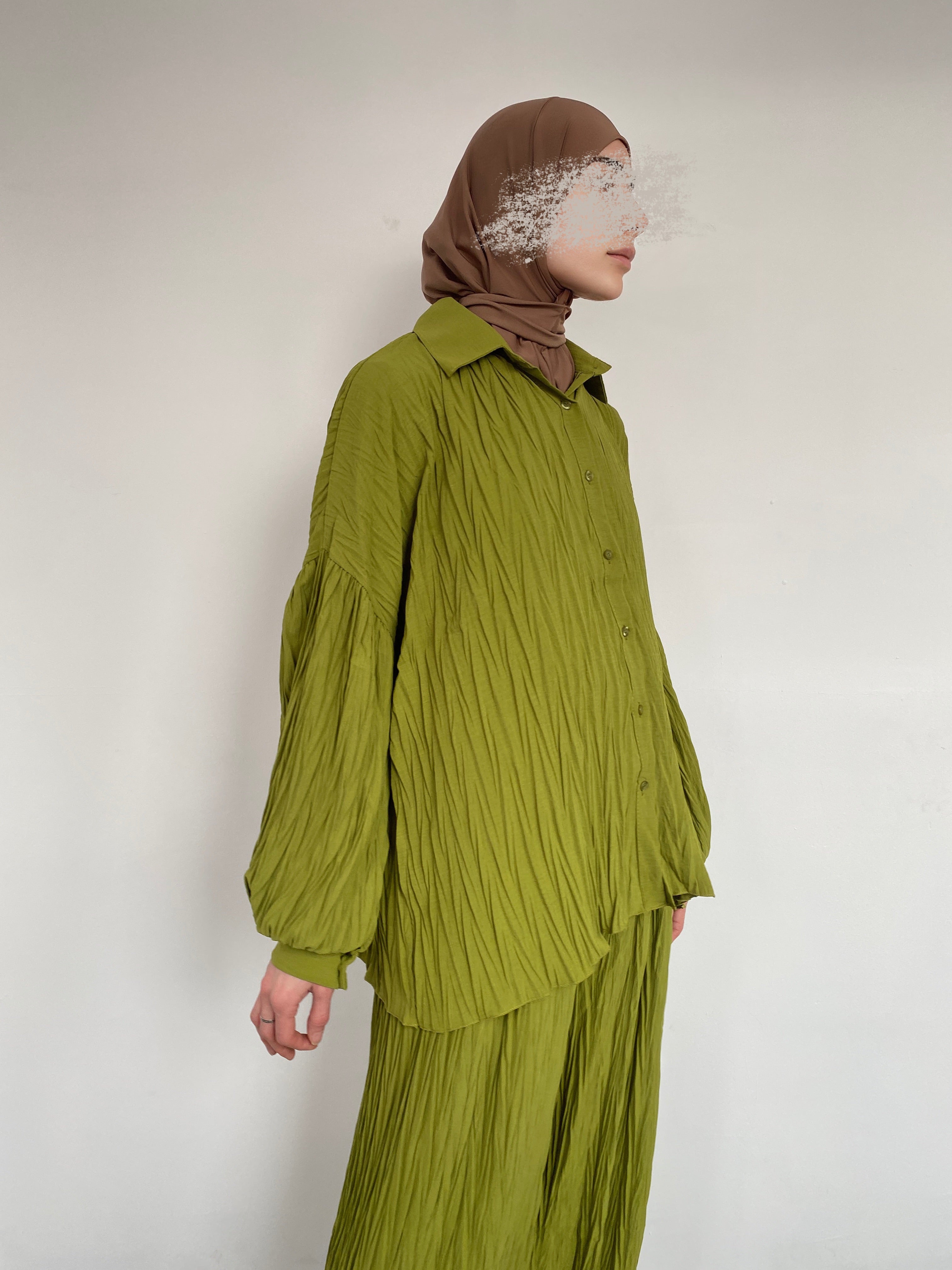 Set consisting of a shirt and wide trousers. Pleated effect. Shirt with puff sleeves and buttoned hem.