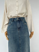 This denim skirt combines comfort and classic style with its timeless cut. Crafted from durable denim, it features a simple, sleek design that's perfect for a variety of looks. Its just-below-the-knee length makes it versatile for everyday wear or more casual occasions.