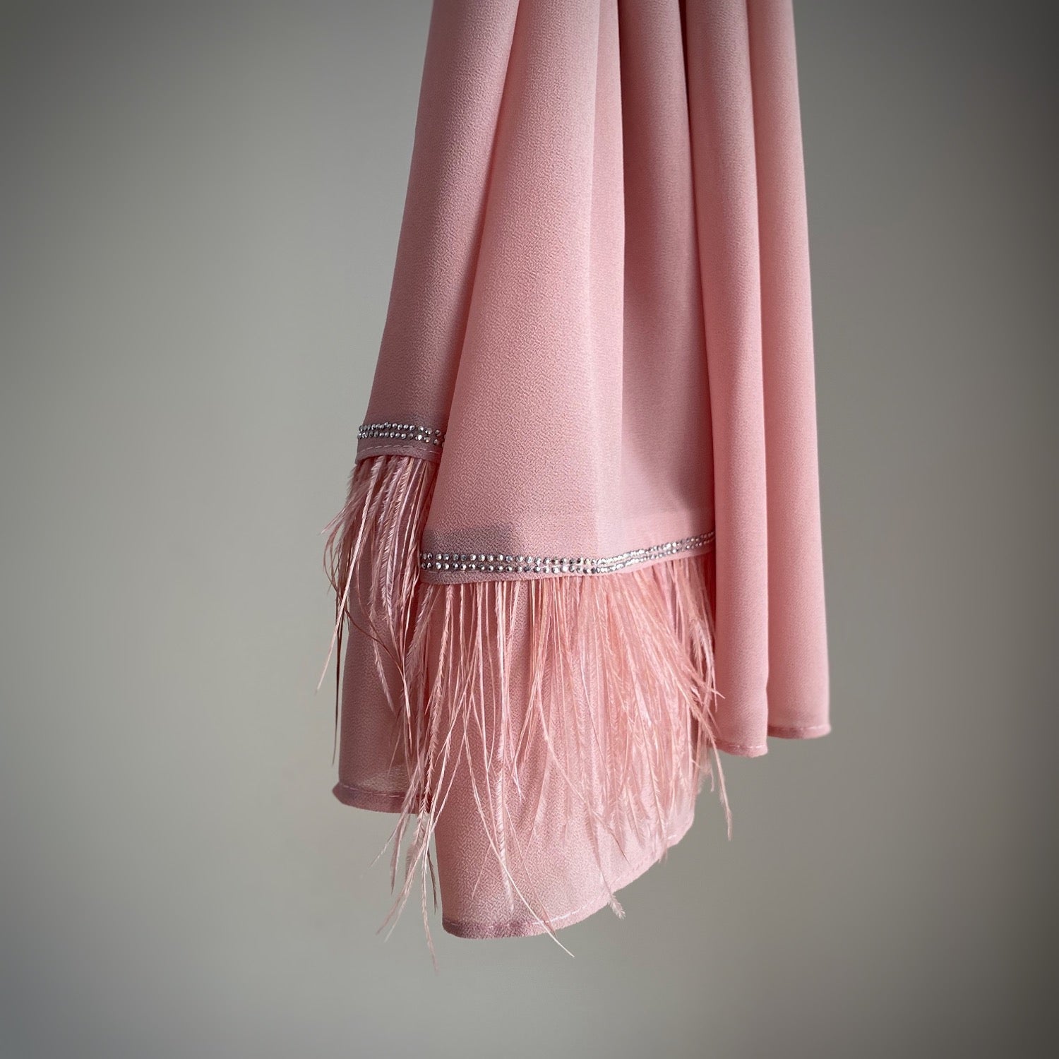 Very chic and feminine rectangular hijab, plain color with at its end a rhinestone border with small delicately attached feathers.