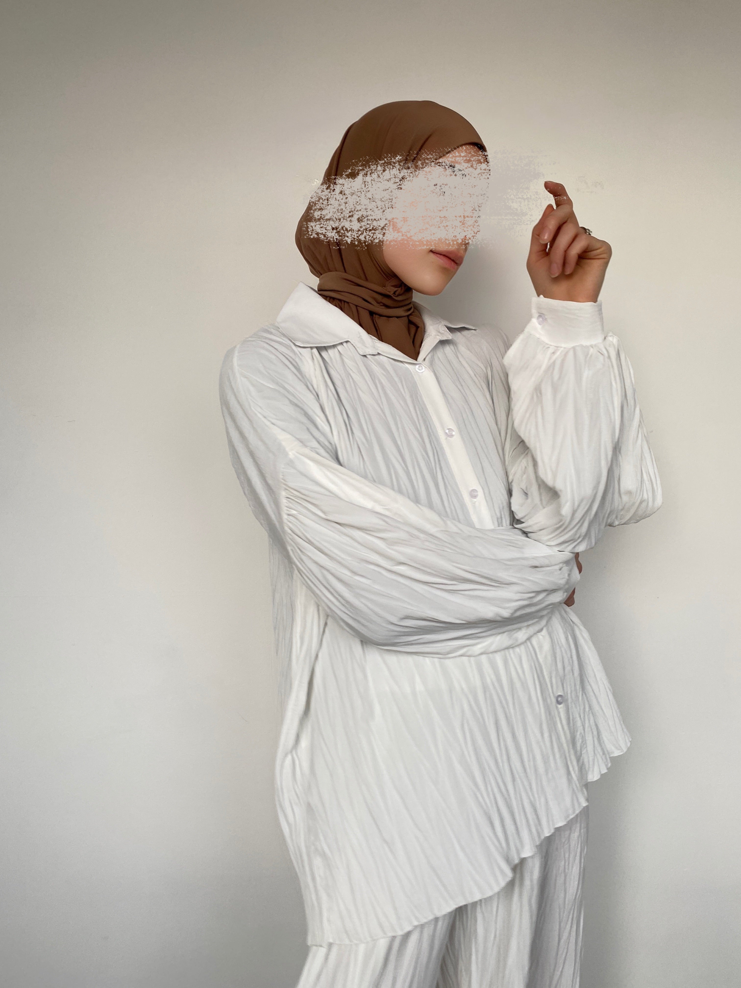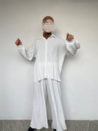 Set consisting of a shirt and wide trousers. Pleated effect. Shirt with puff sleeves and buttoned hem.