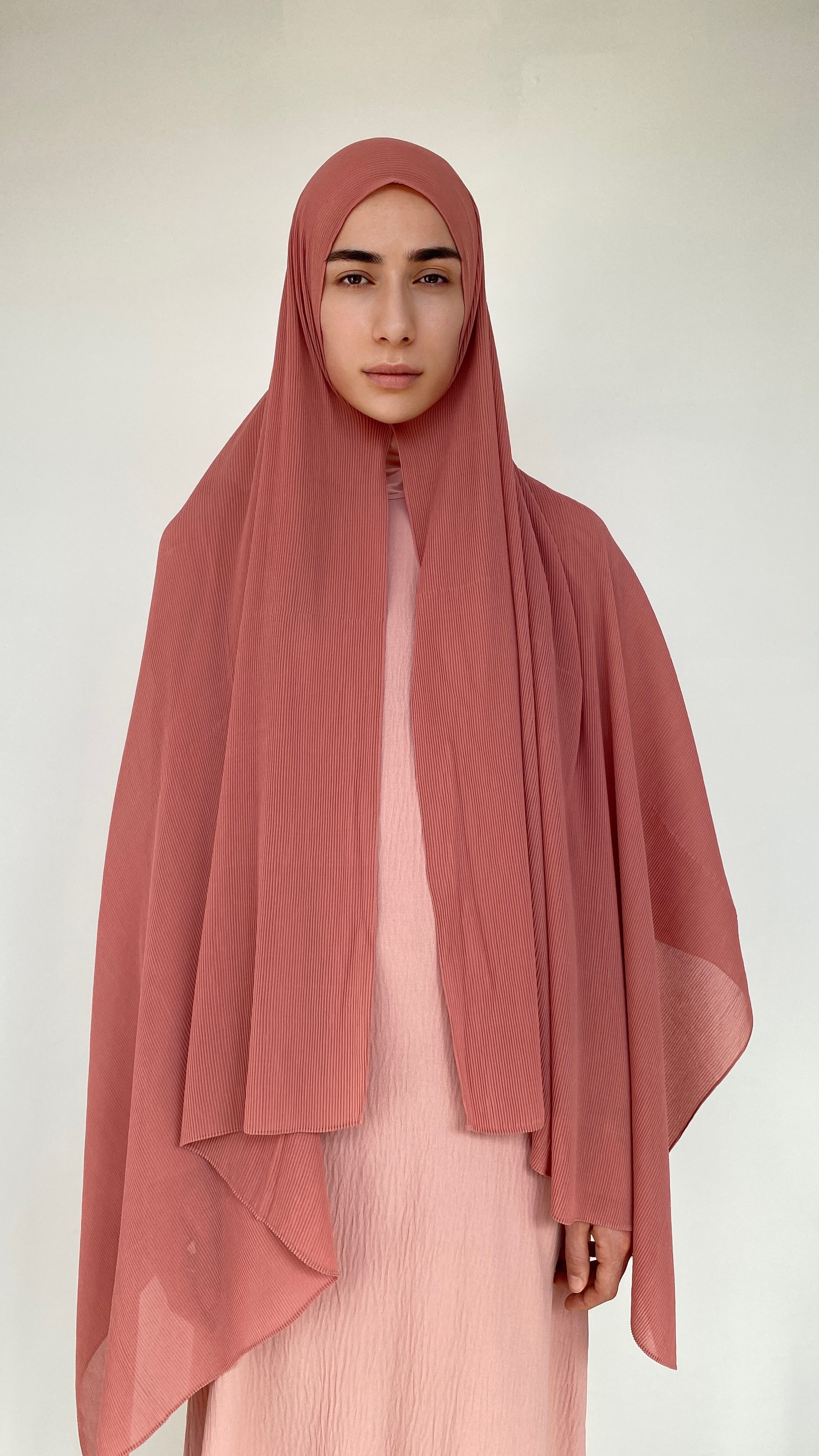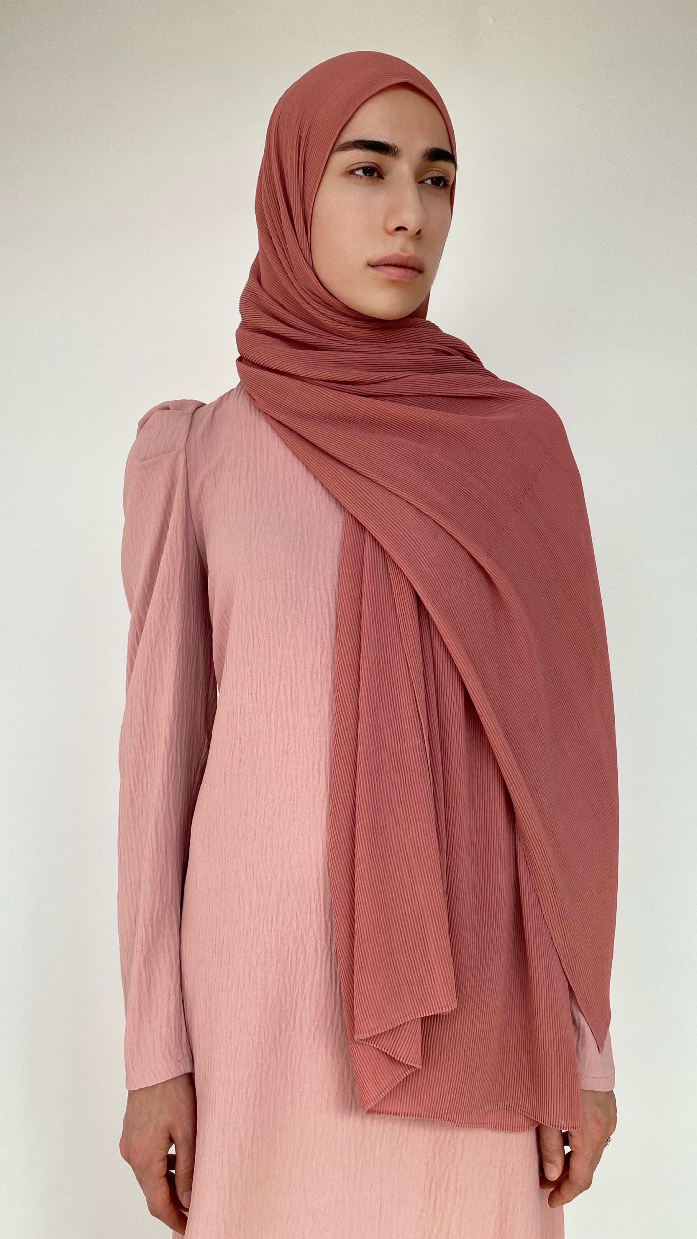 This hijab is in Chiffon but in a unique style: it is finely ribbed/pleated.