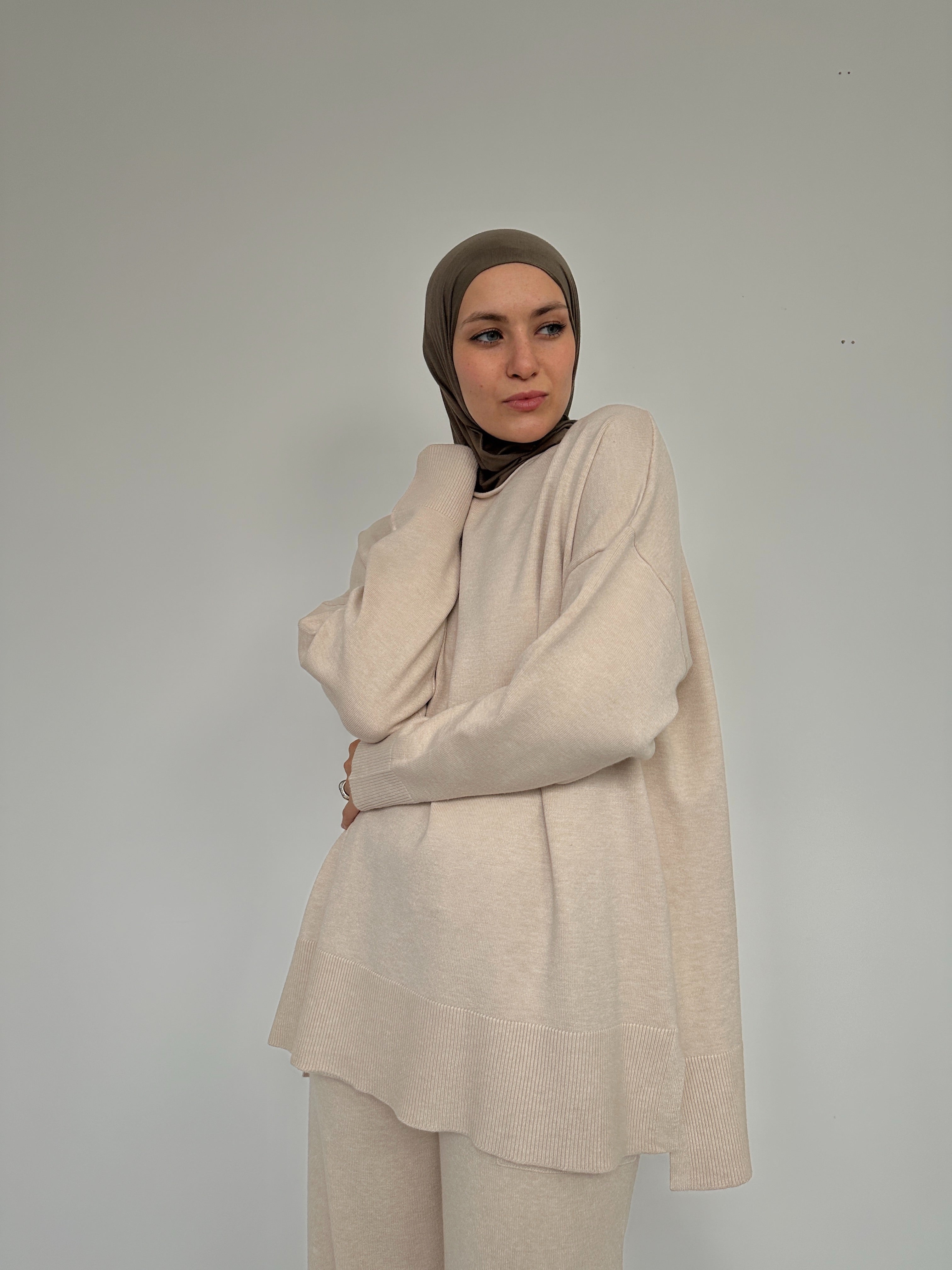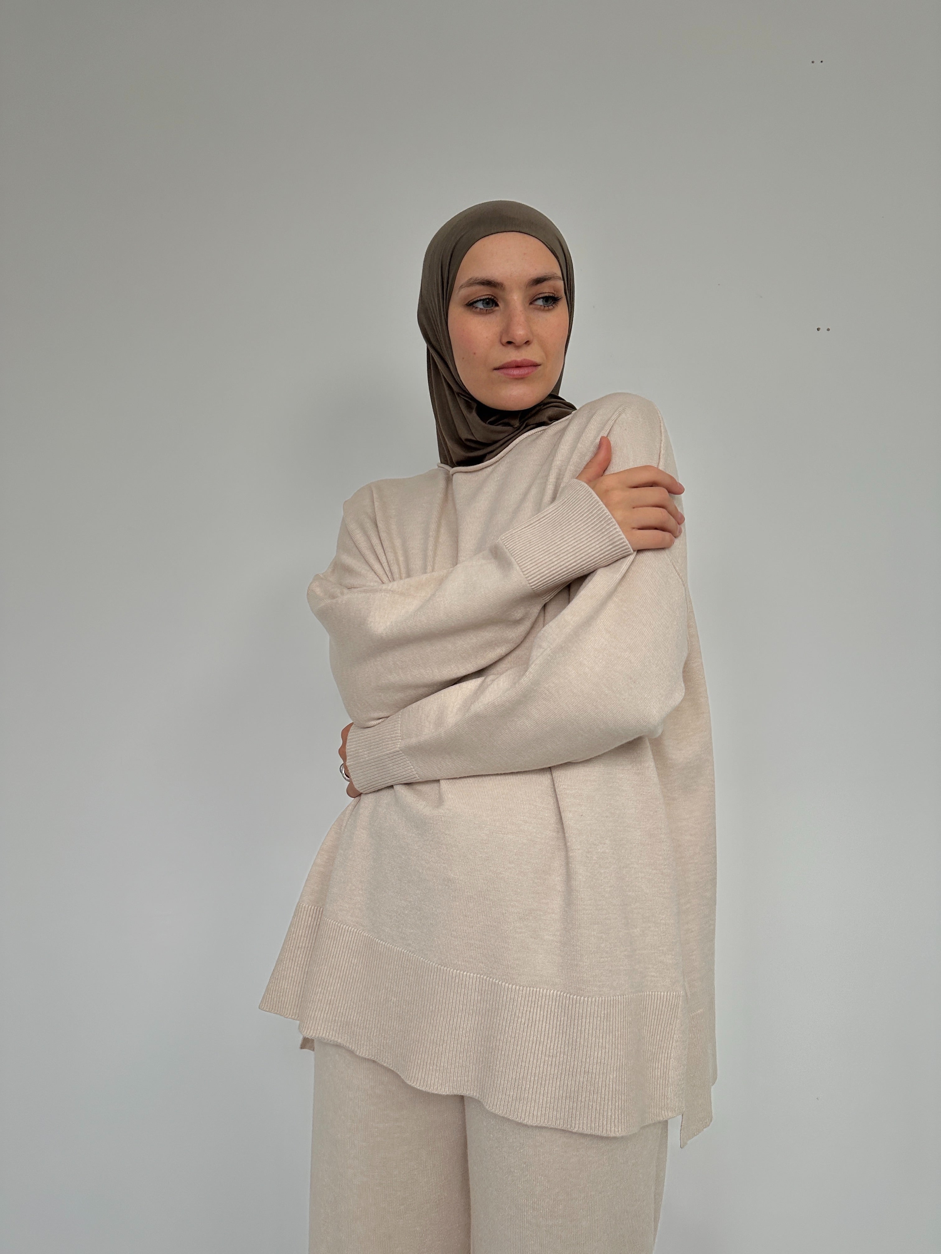 This two-piece knit set is the perfect blend of relaxed style and ultimate comfort. Comprising a loose-fitting sweater and matching pants, it offers a chic and minimalist monochrome look. Ideal for everyday wear, this set is a must-have for a modest yet elegant wardrobe.