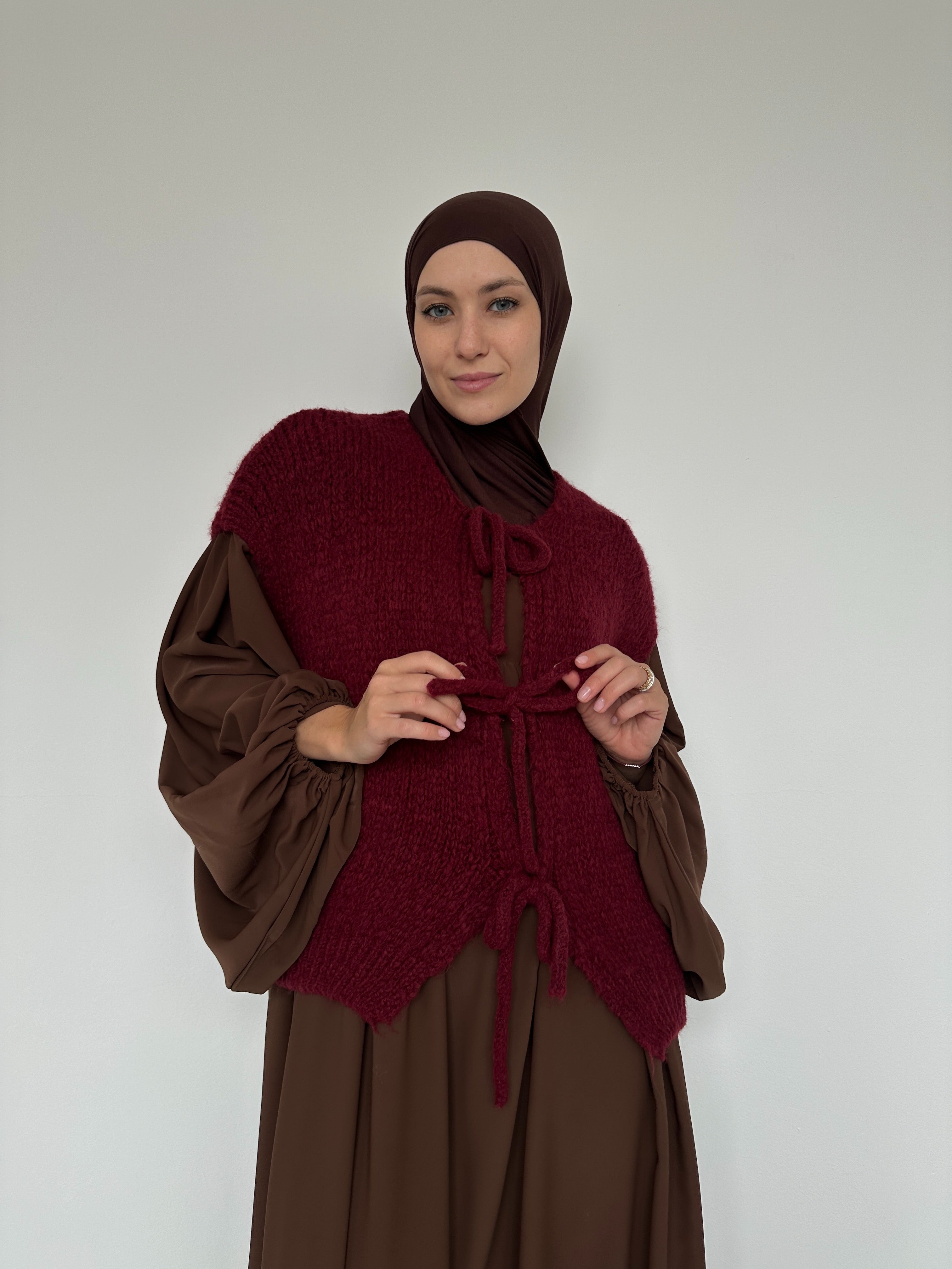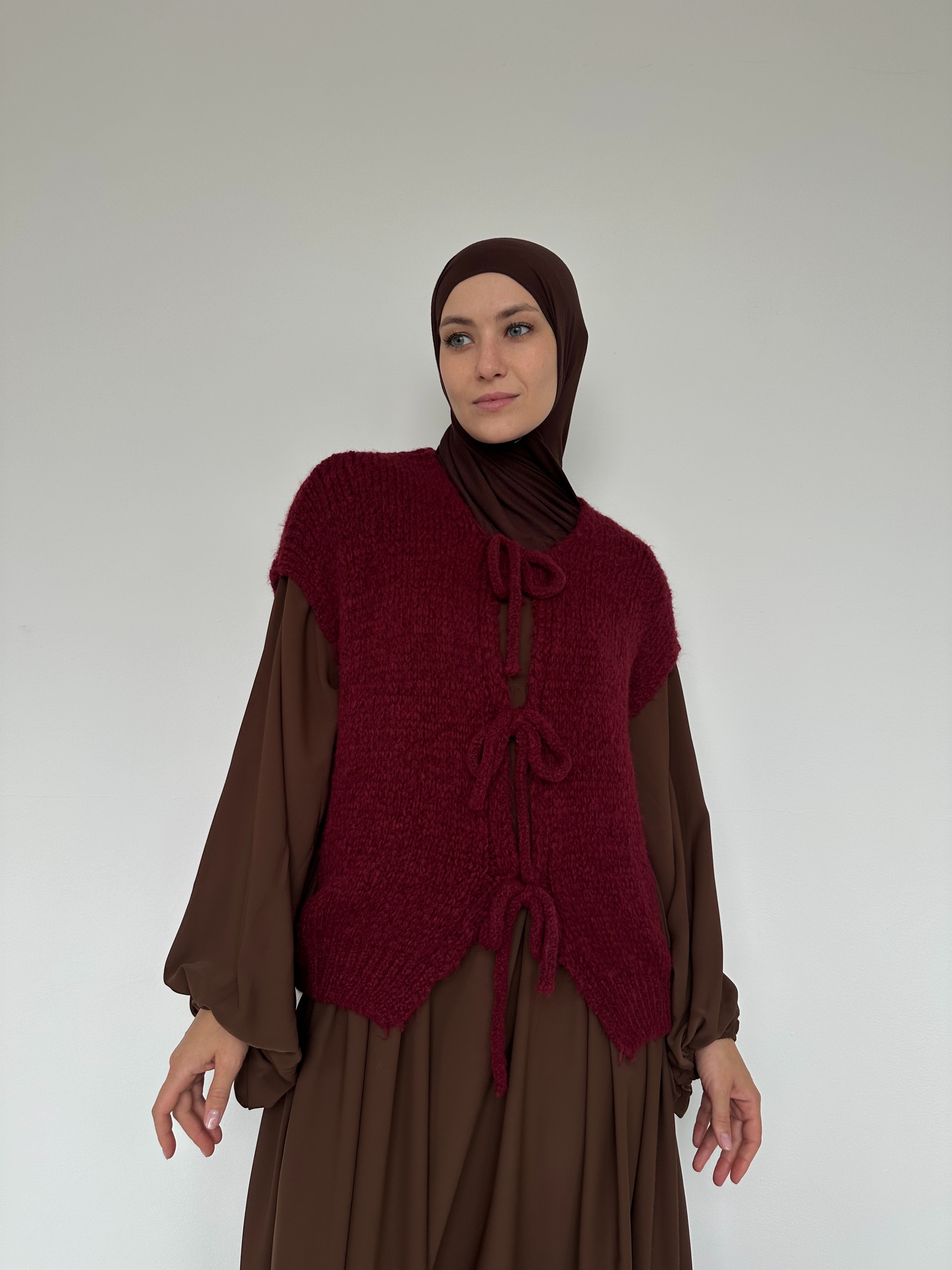 This sleeveless jacket is distinguished by its minimalist cut and comfortable texture — ideal for layering over a shirt, abaya or light sweater.