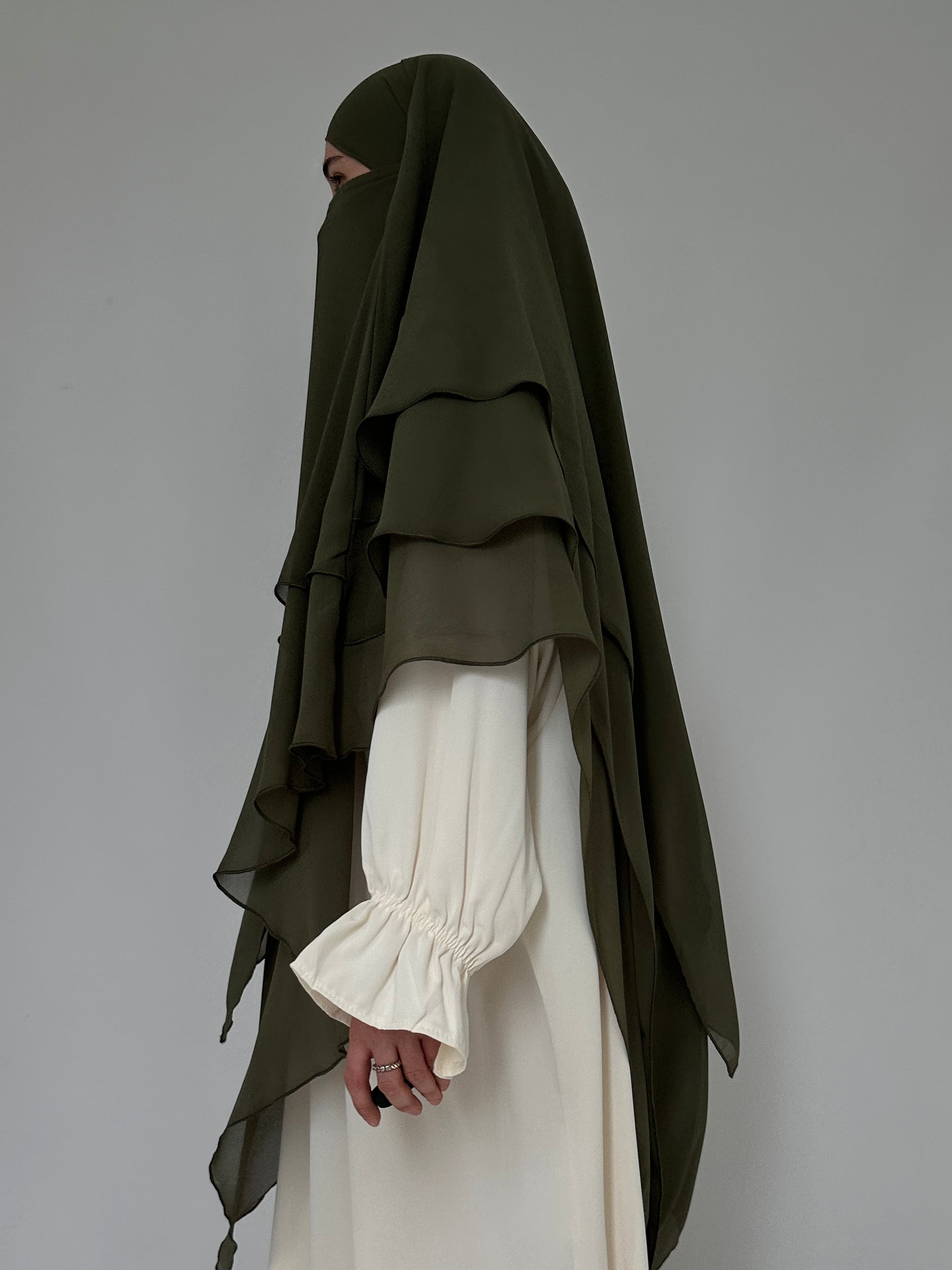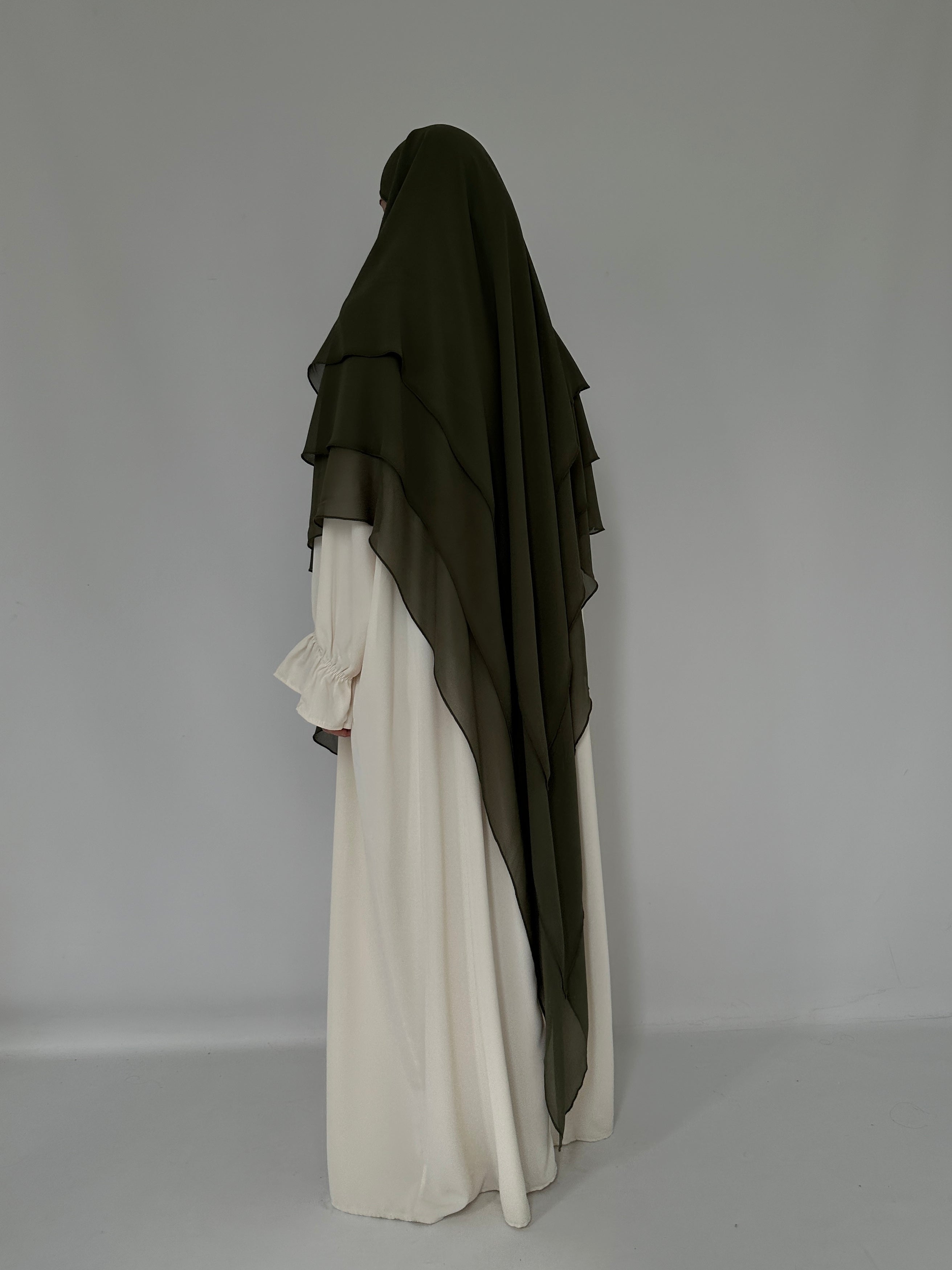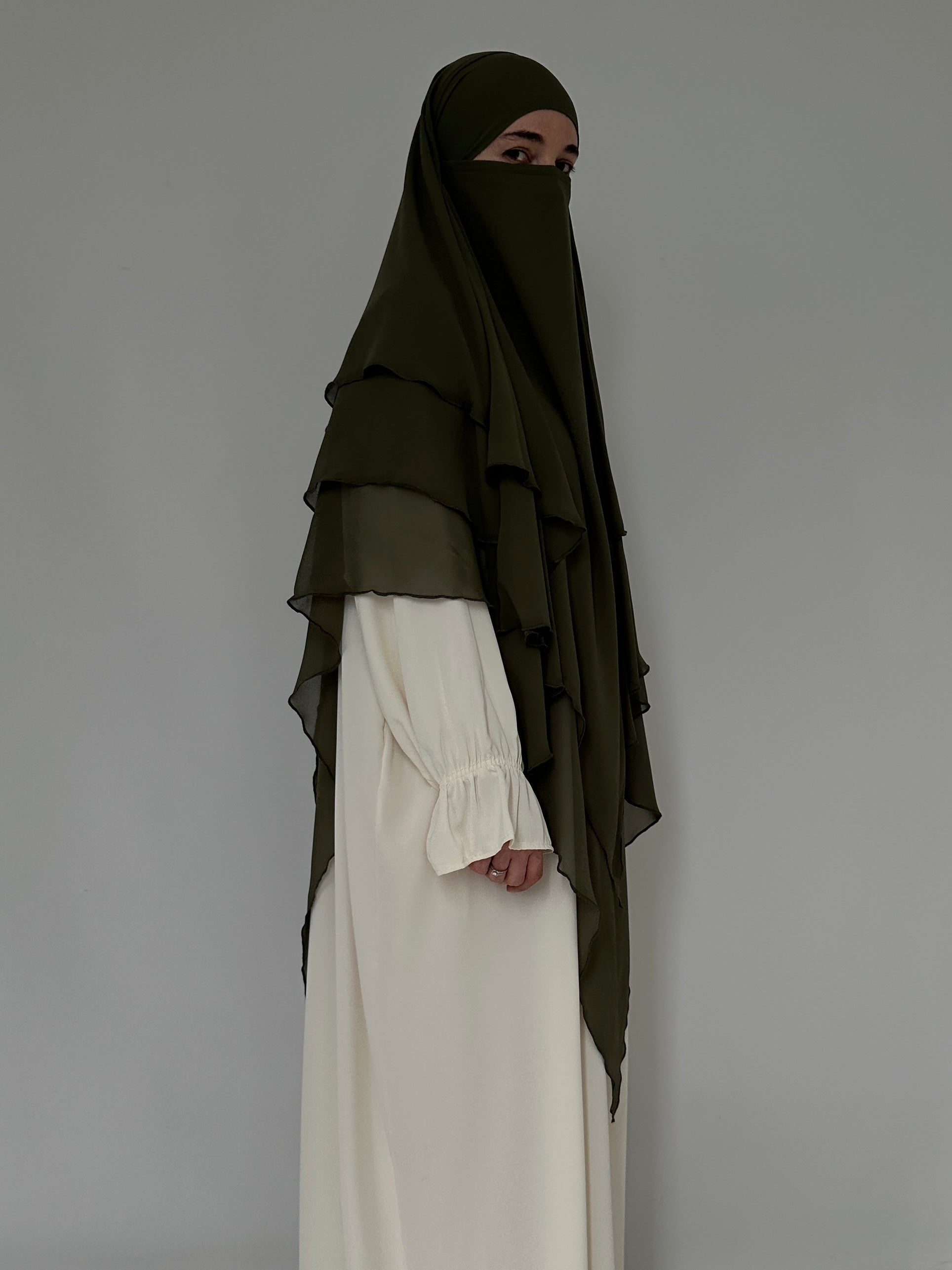 KHIMAR THREE-VILES IN OLIVE MUSLIN