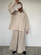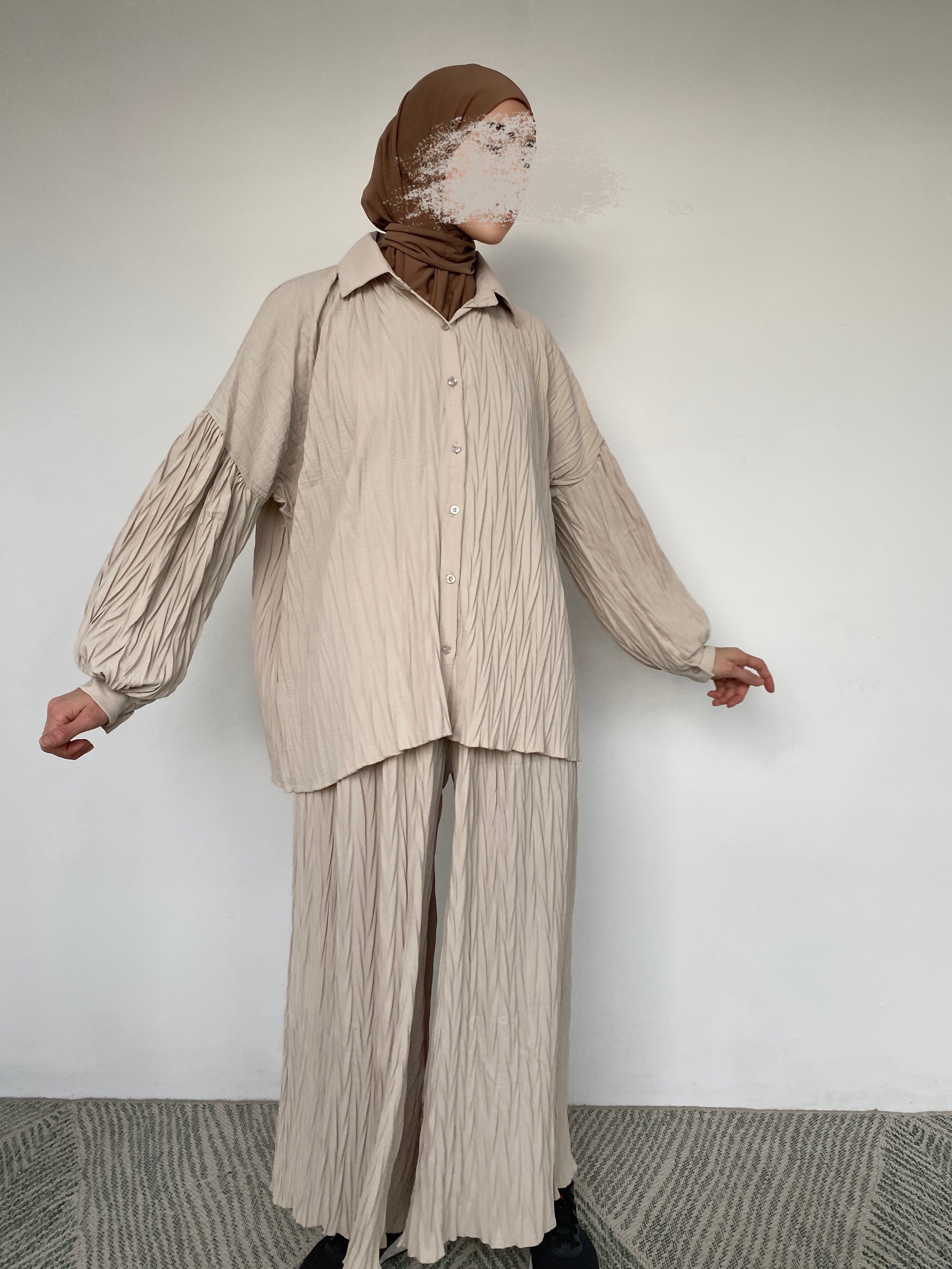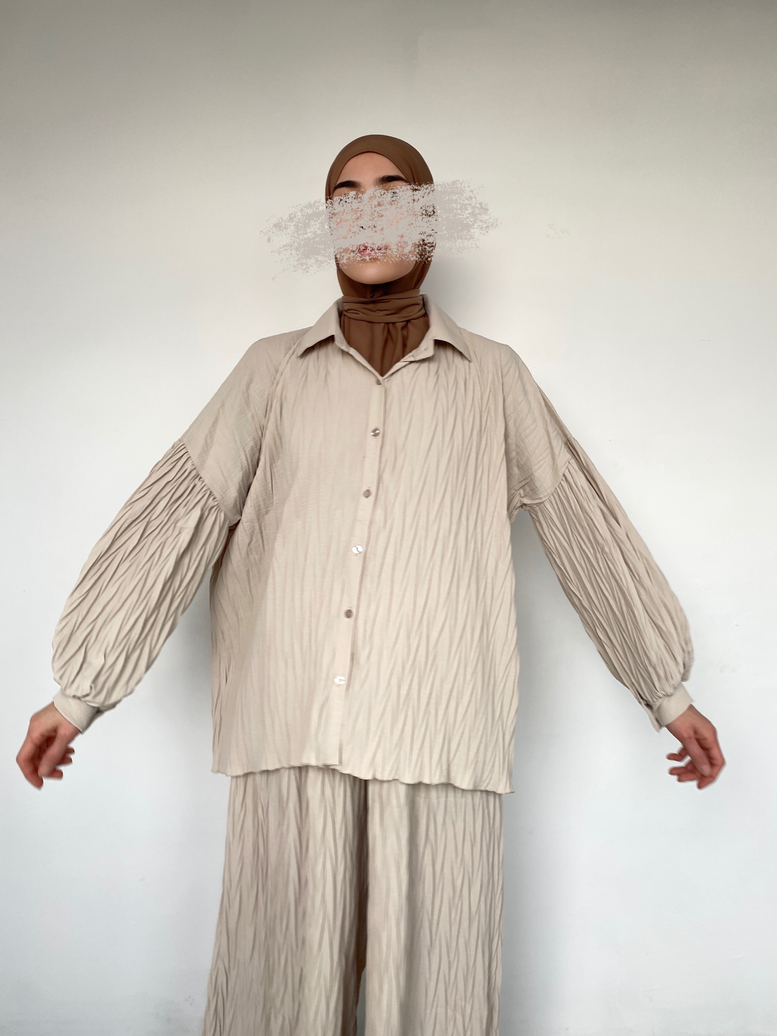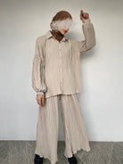 Set consisting of a shirt and wide trousers. Pleated effect. Shirt with puff sleeves and buttoned hem.