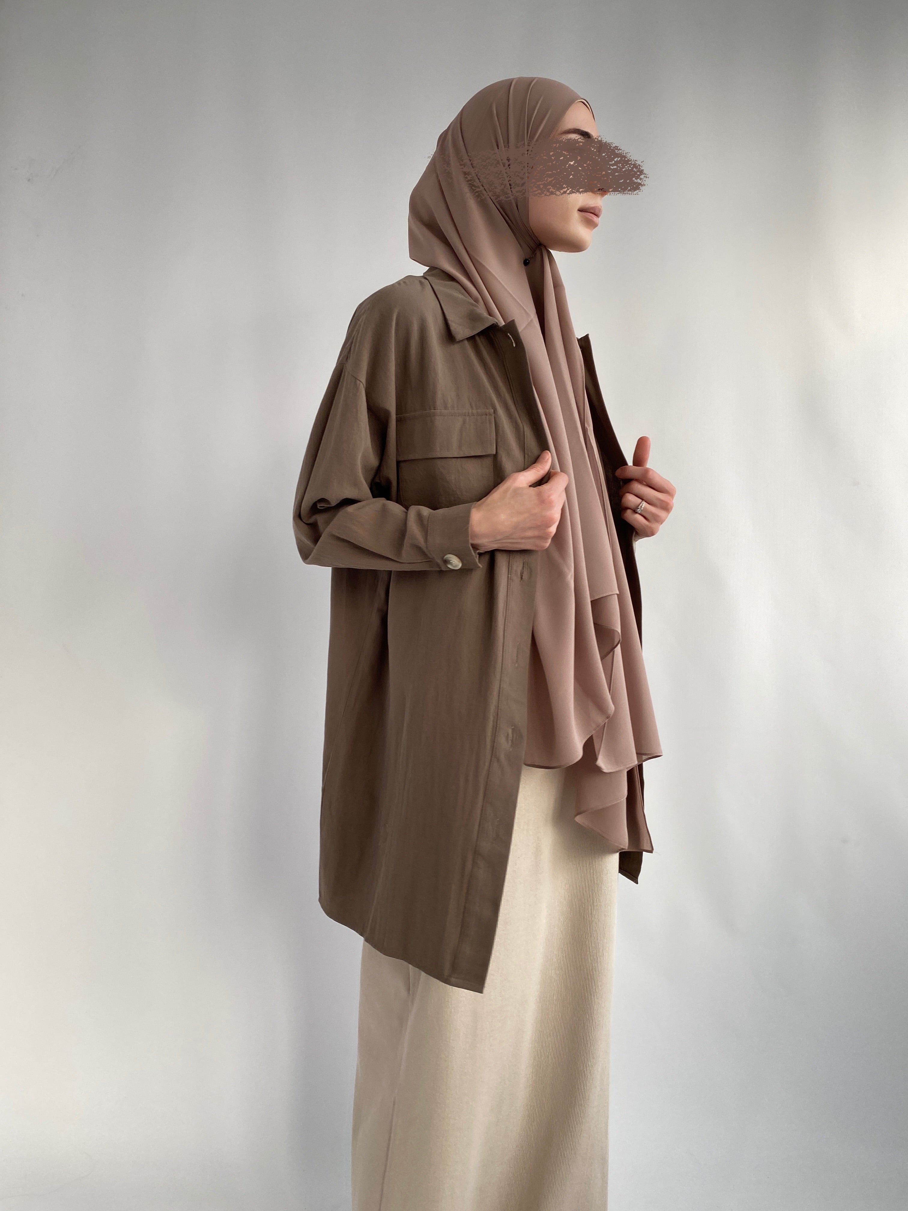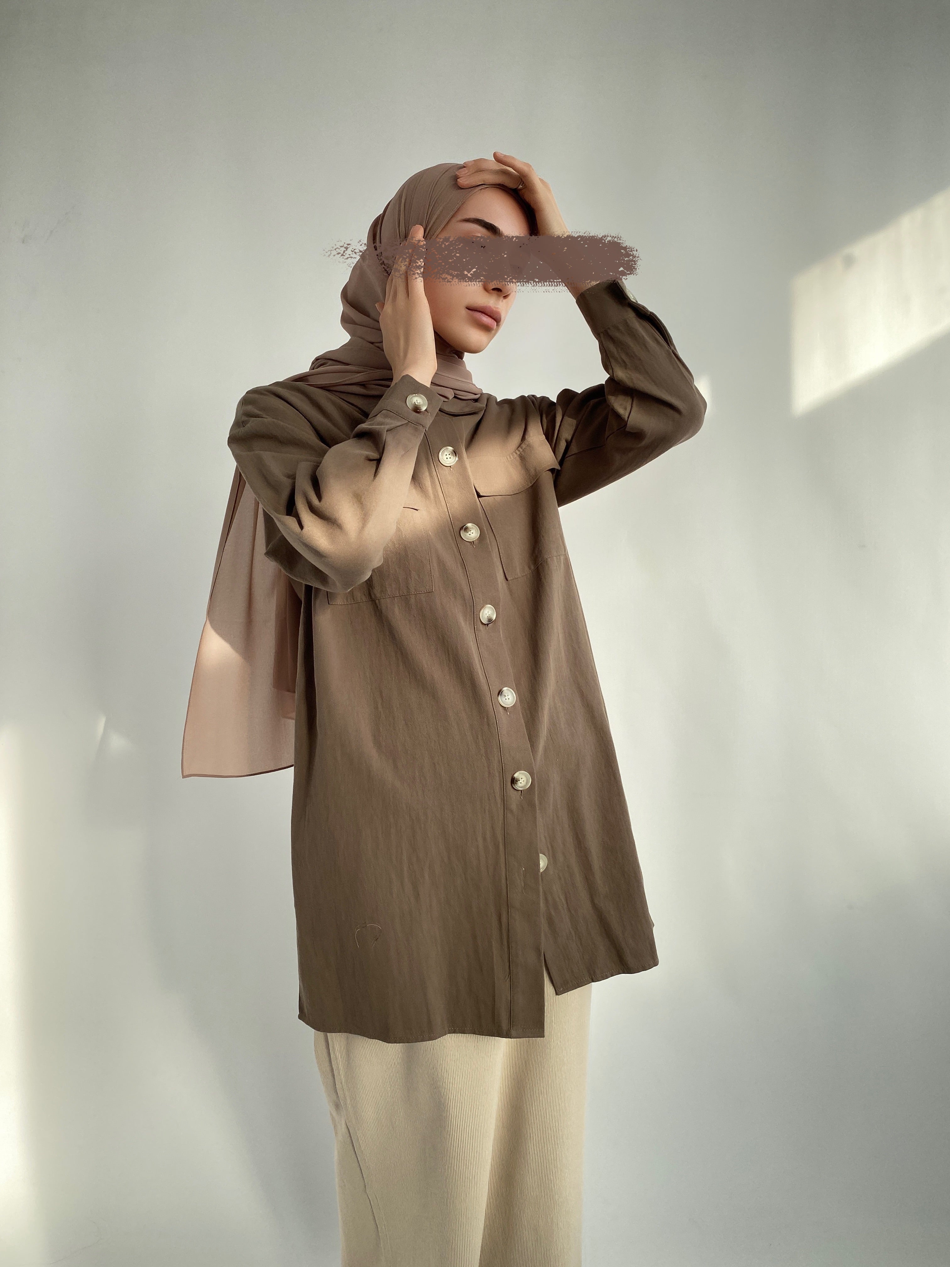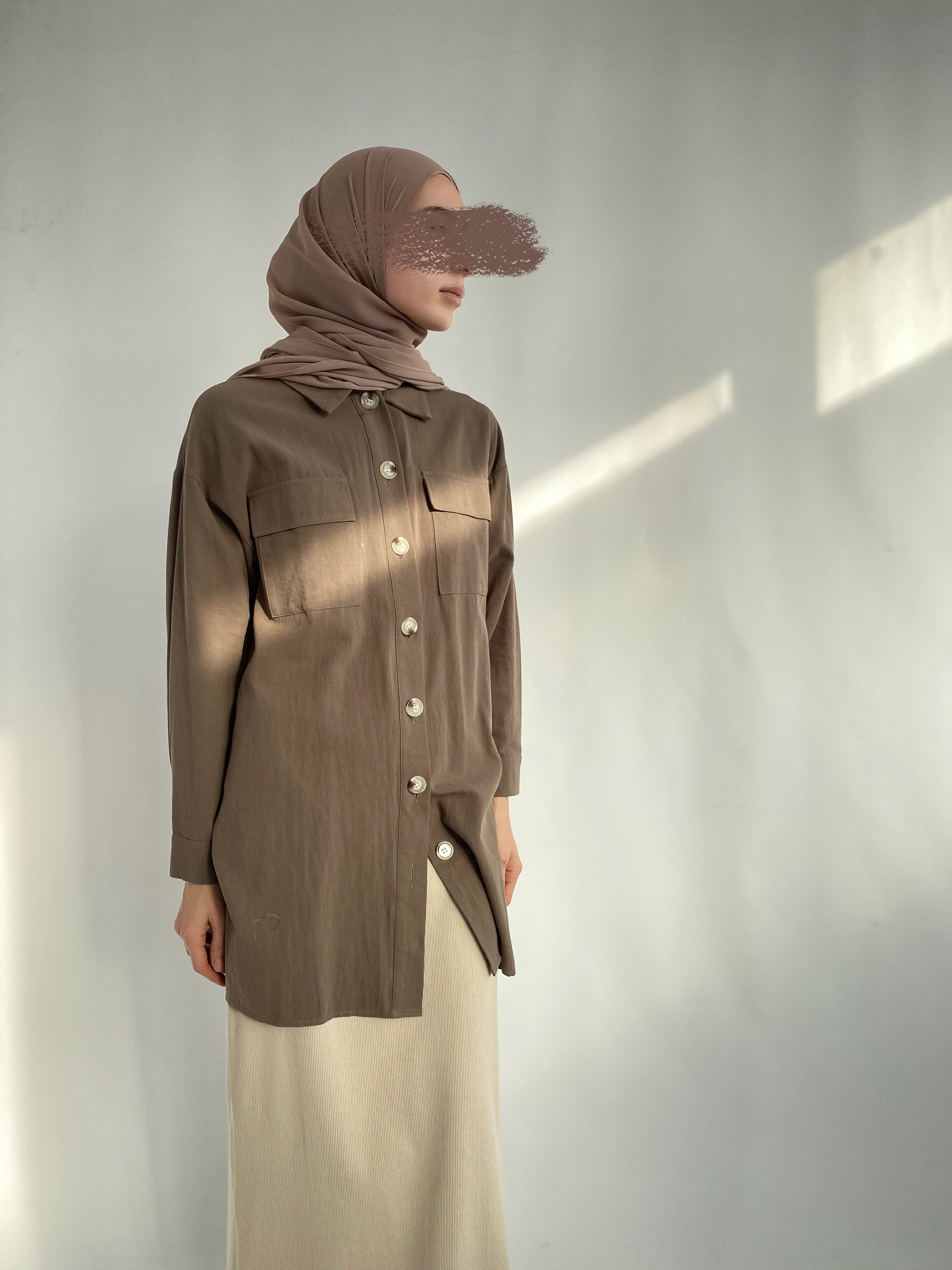 Dropped armholes and long sleeves finished with wide buttoned cuffs.