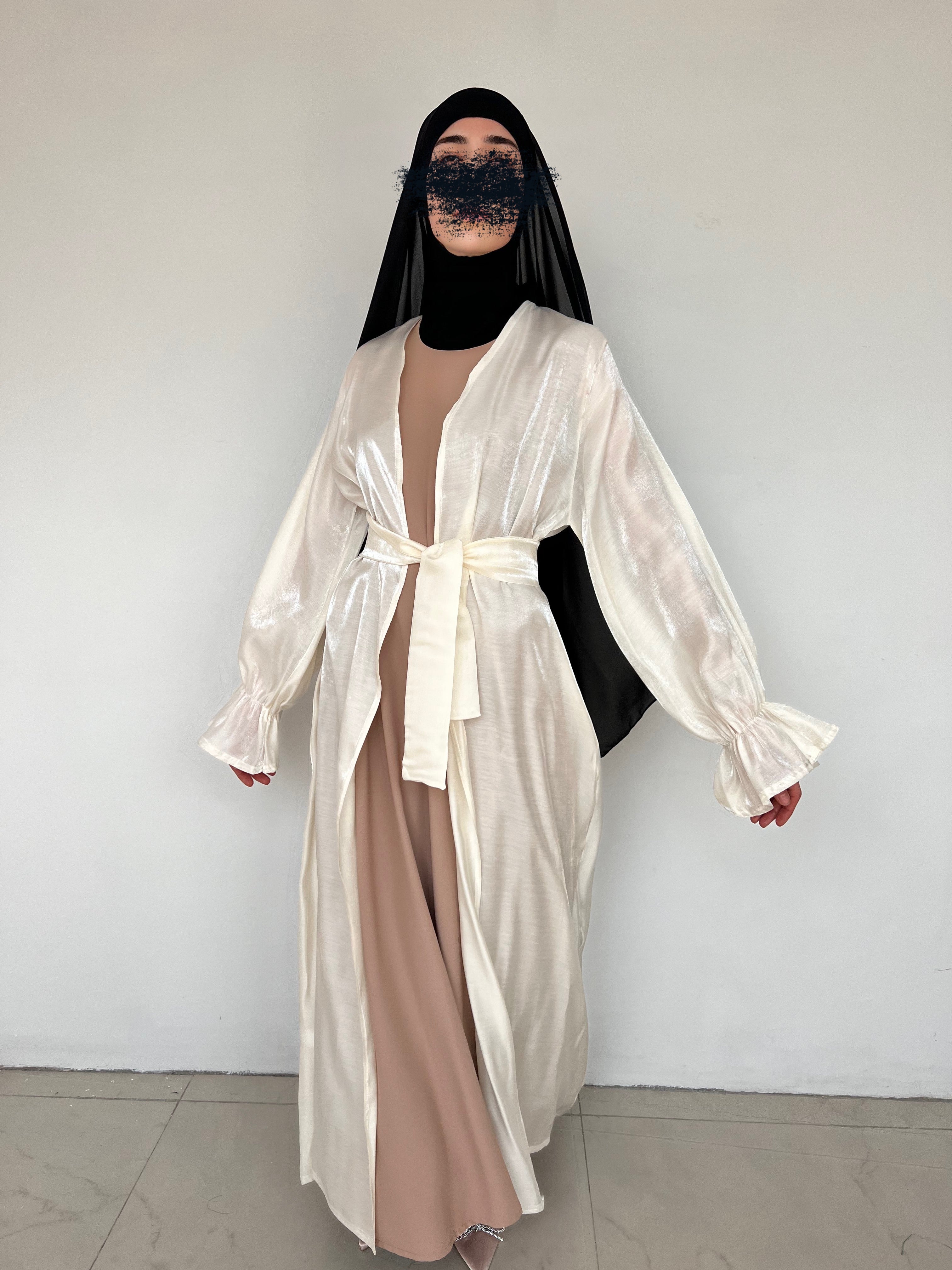 Light and elegant organza kimono, ideal for special occasions or evenings. Made from a fabric type of transparent and delicate fabrics, satin effect, balloon sleeves that add a touch of volume and movement to the set.