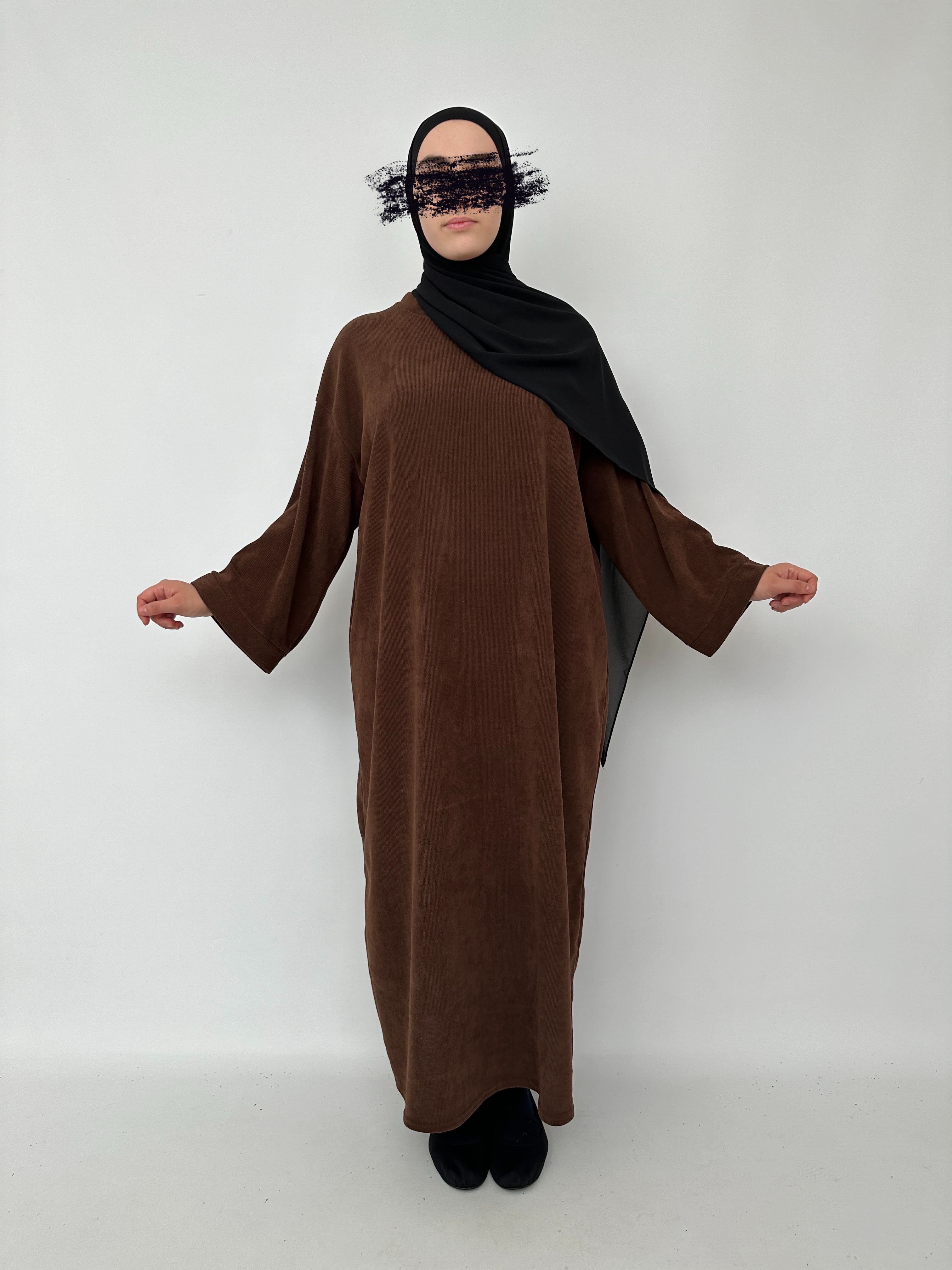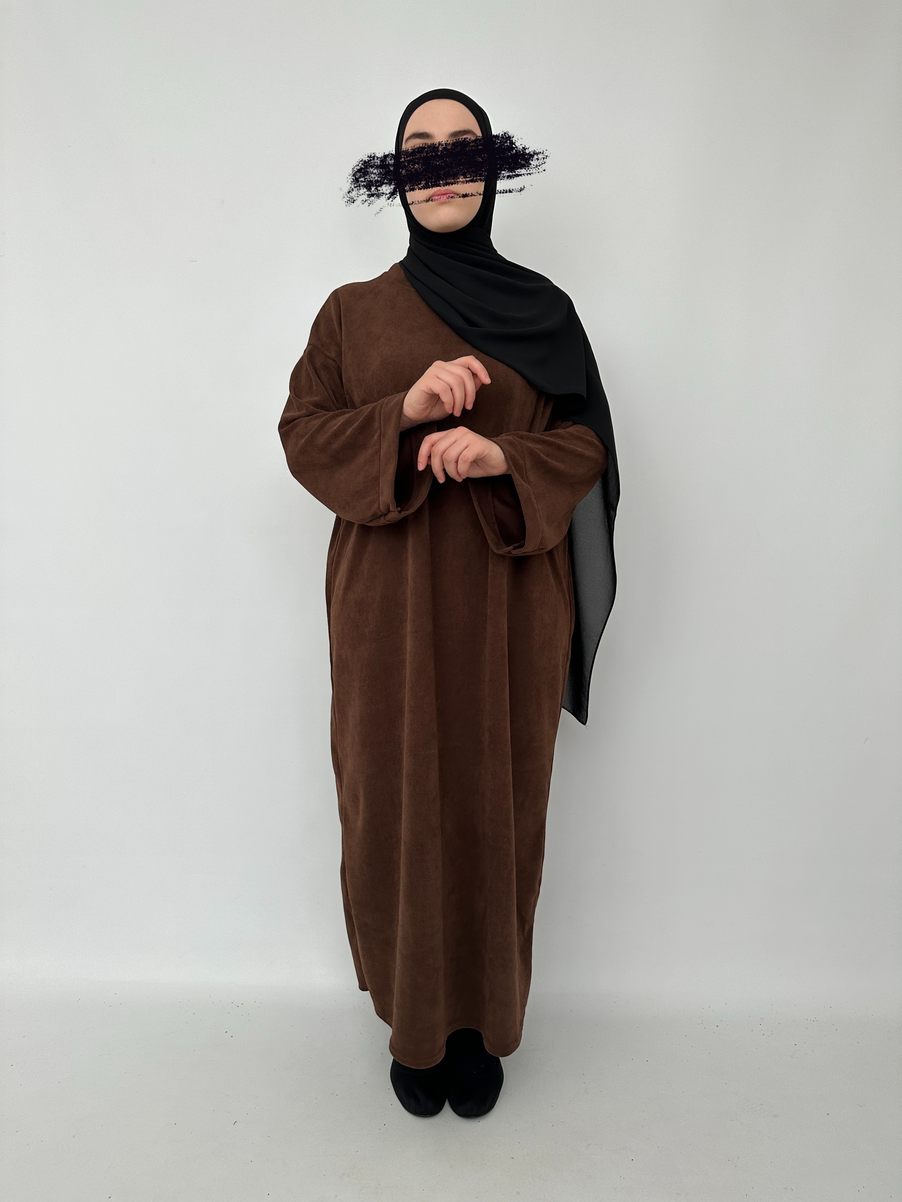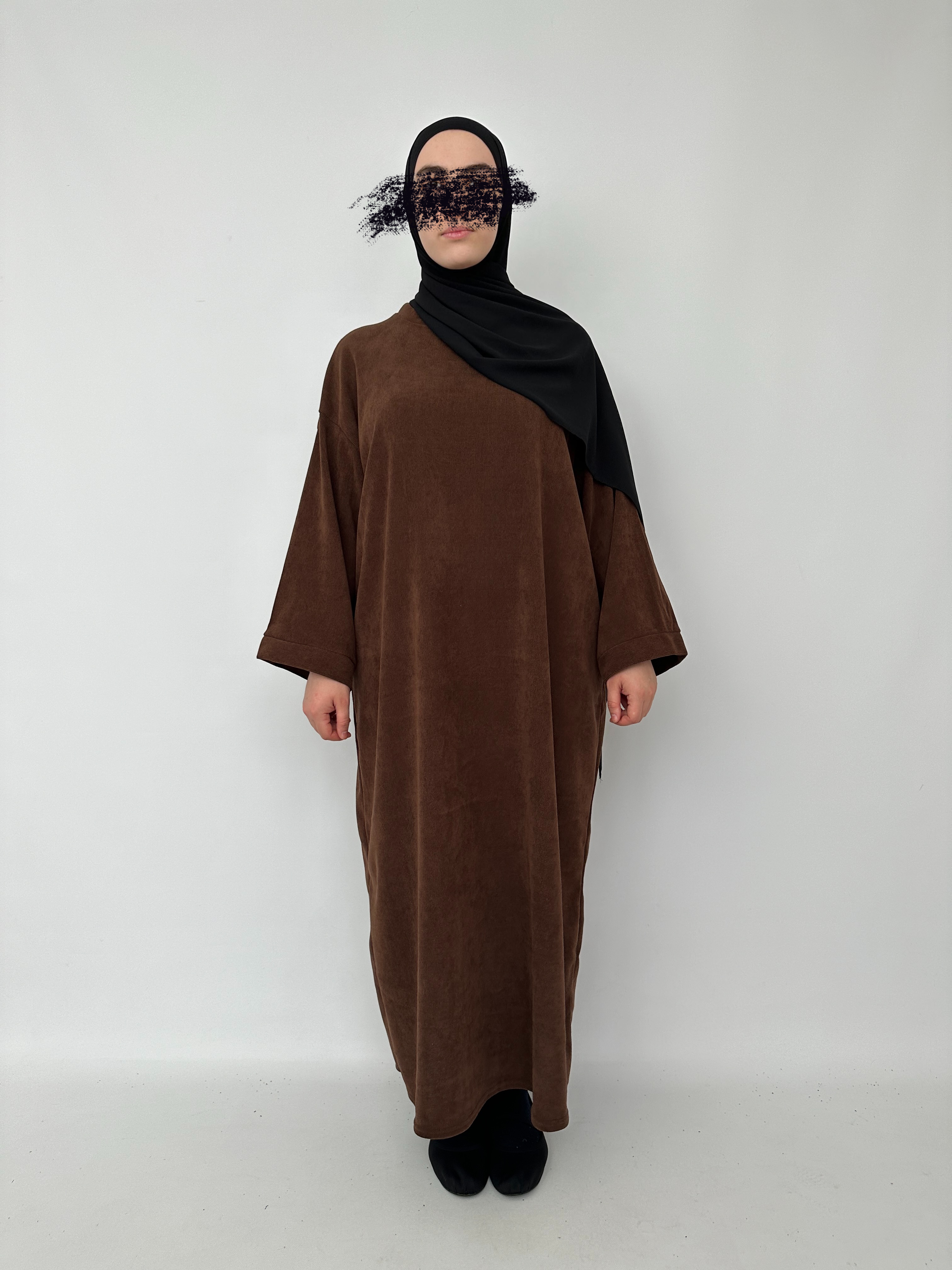 This corduroy dress with dropped sleeves is the perfect choice for fall and winter. Its soft and thick fabric ensures comfort and warmth while offering an elegant and fluid look. The loose and modest cut allows for great freedom of movement, while the velvet brings a touch of sophistication to your outfit, ideal for the cooler seasons.