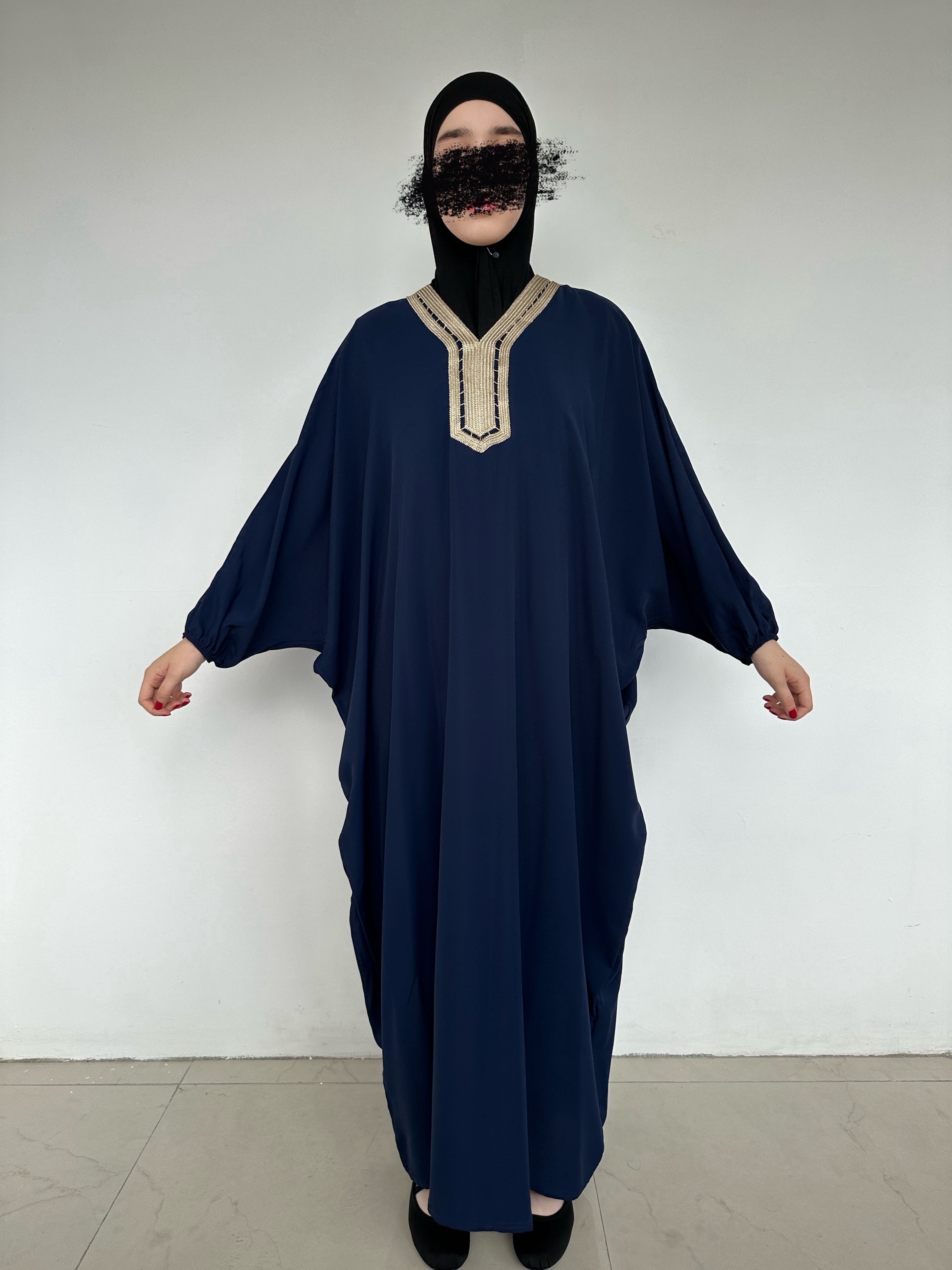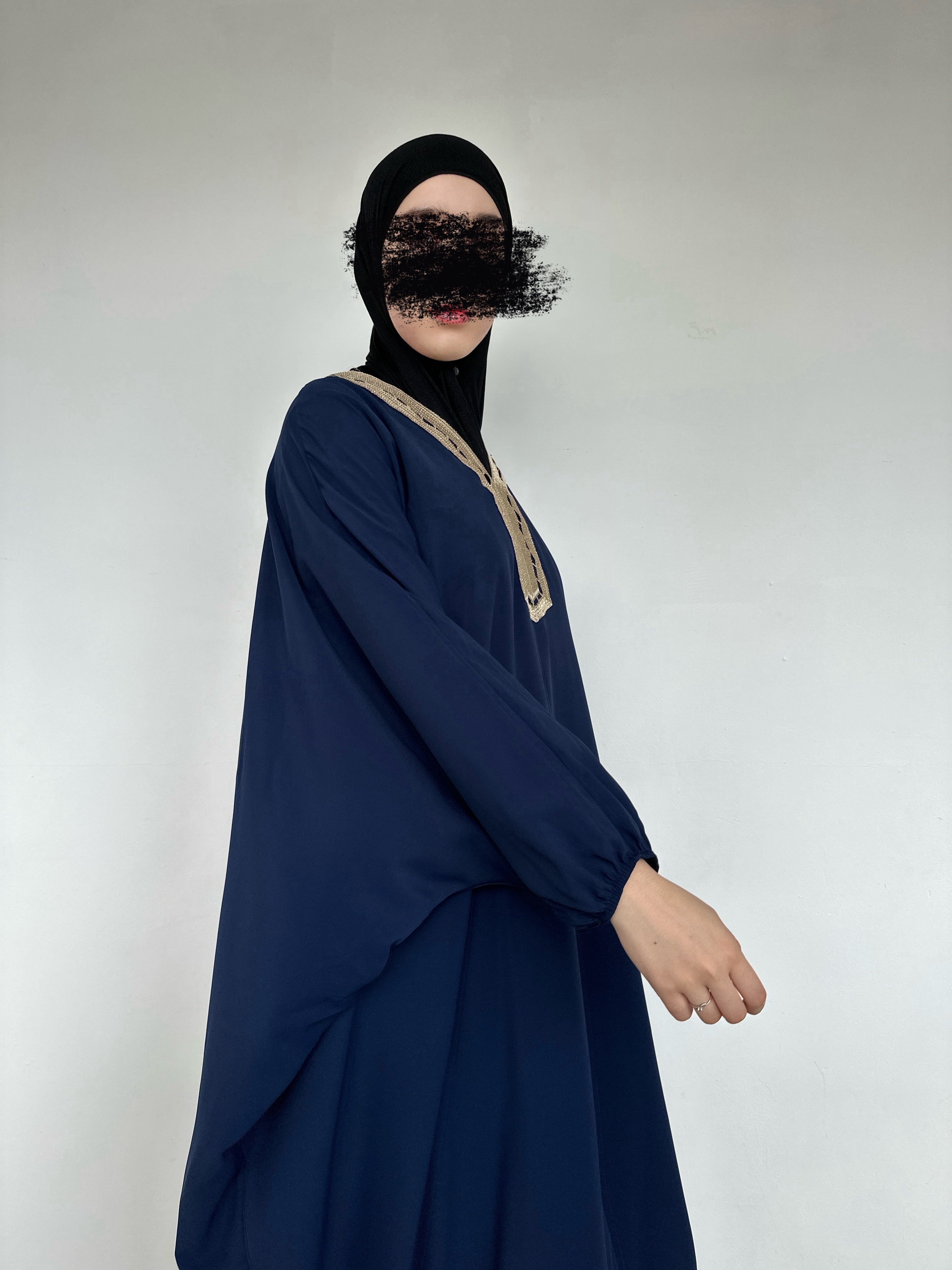 Djellaba with sophisticated details at the collar. Butterfly sleeves granting amplitude. The elastic sleeve ends prevent them from riding up.