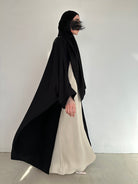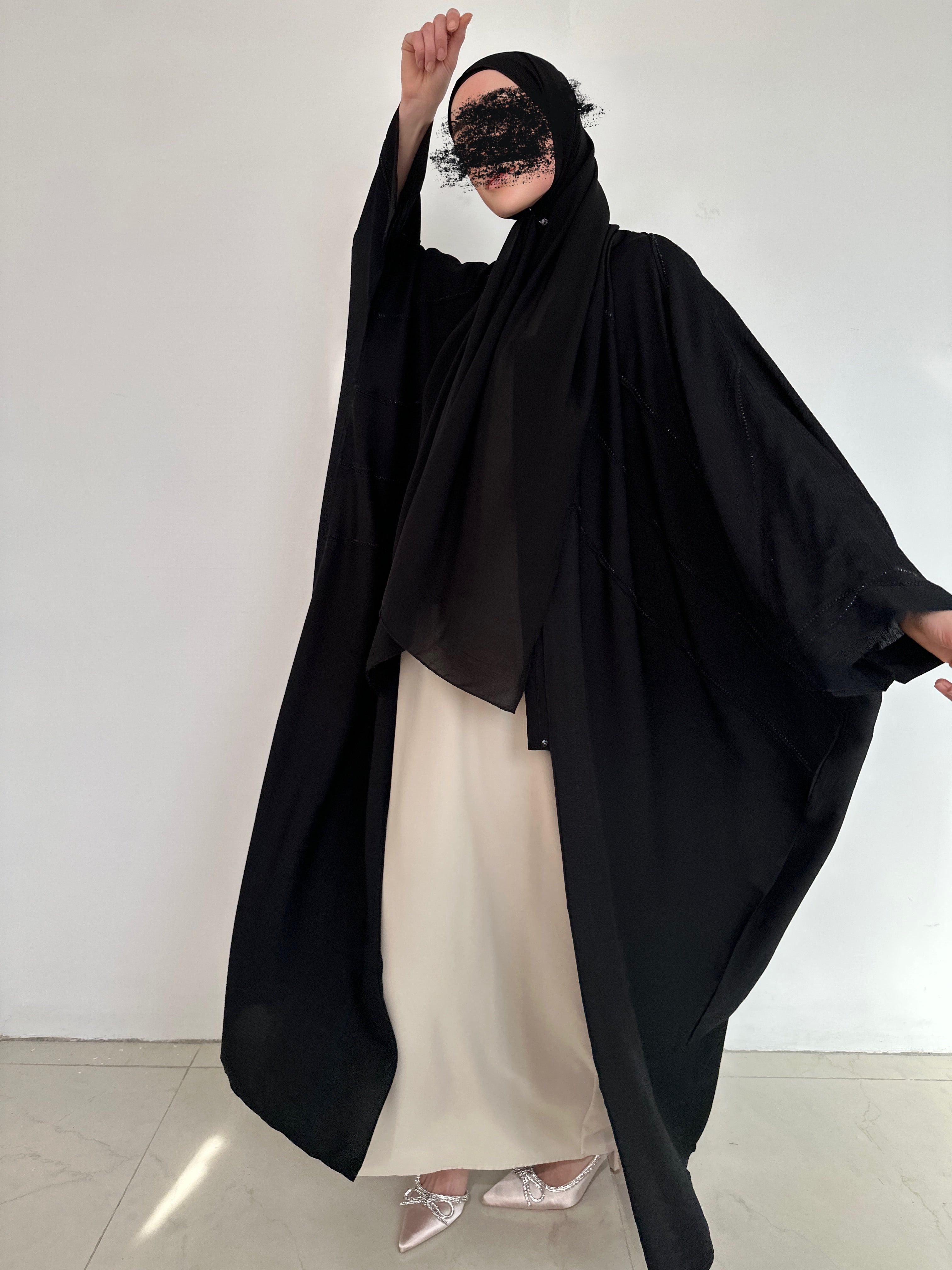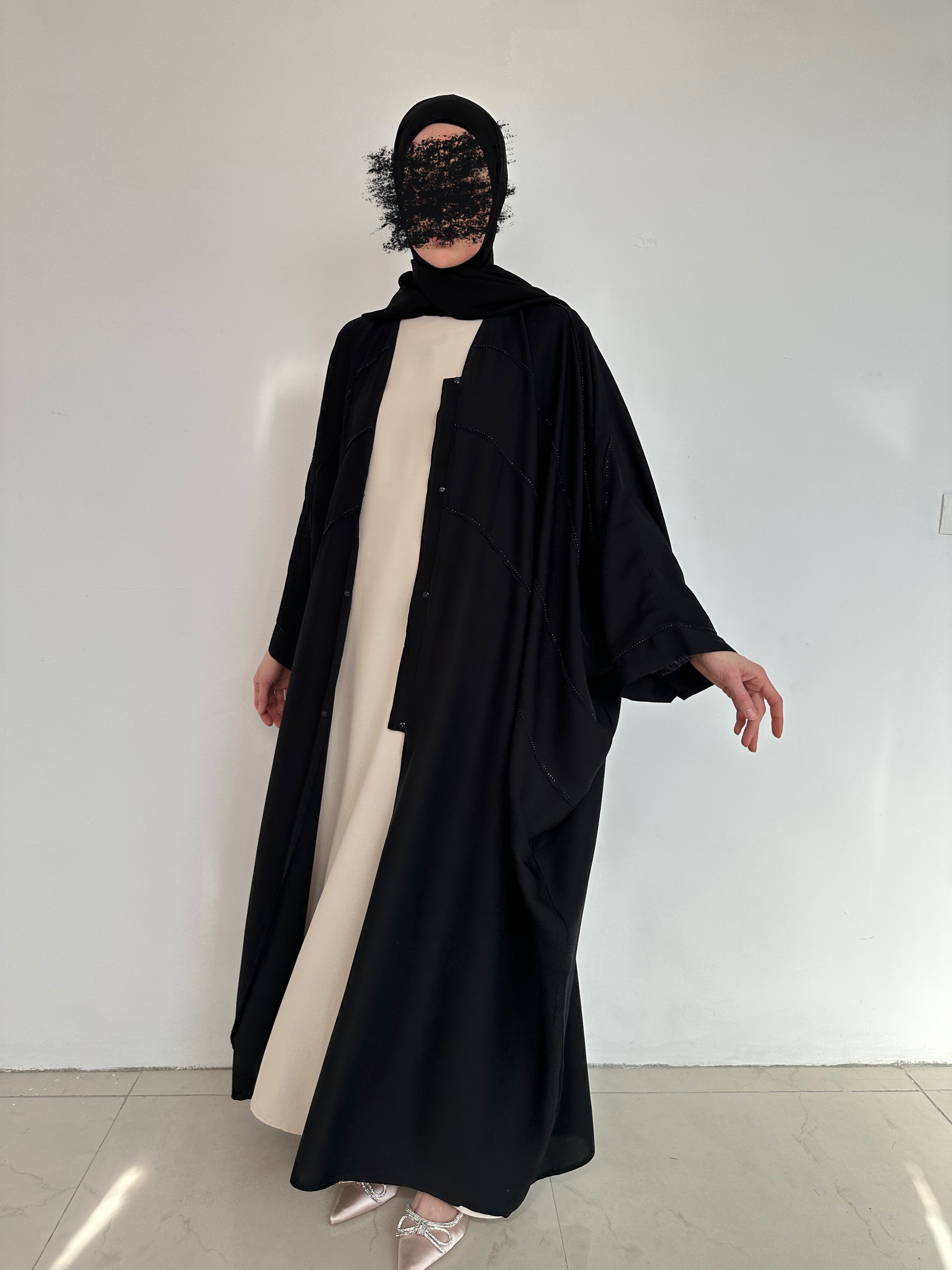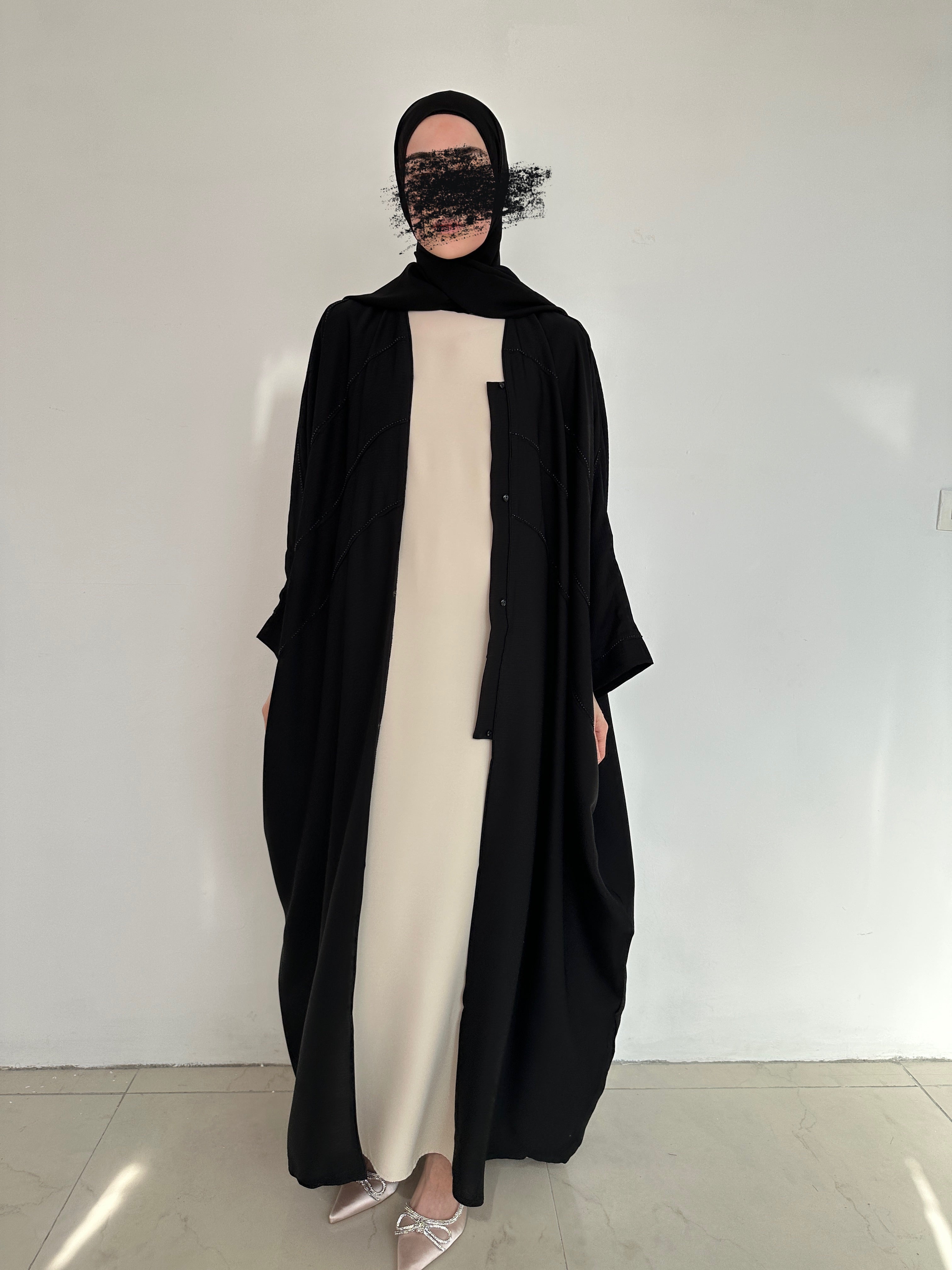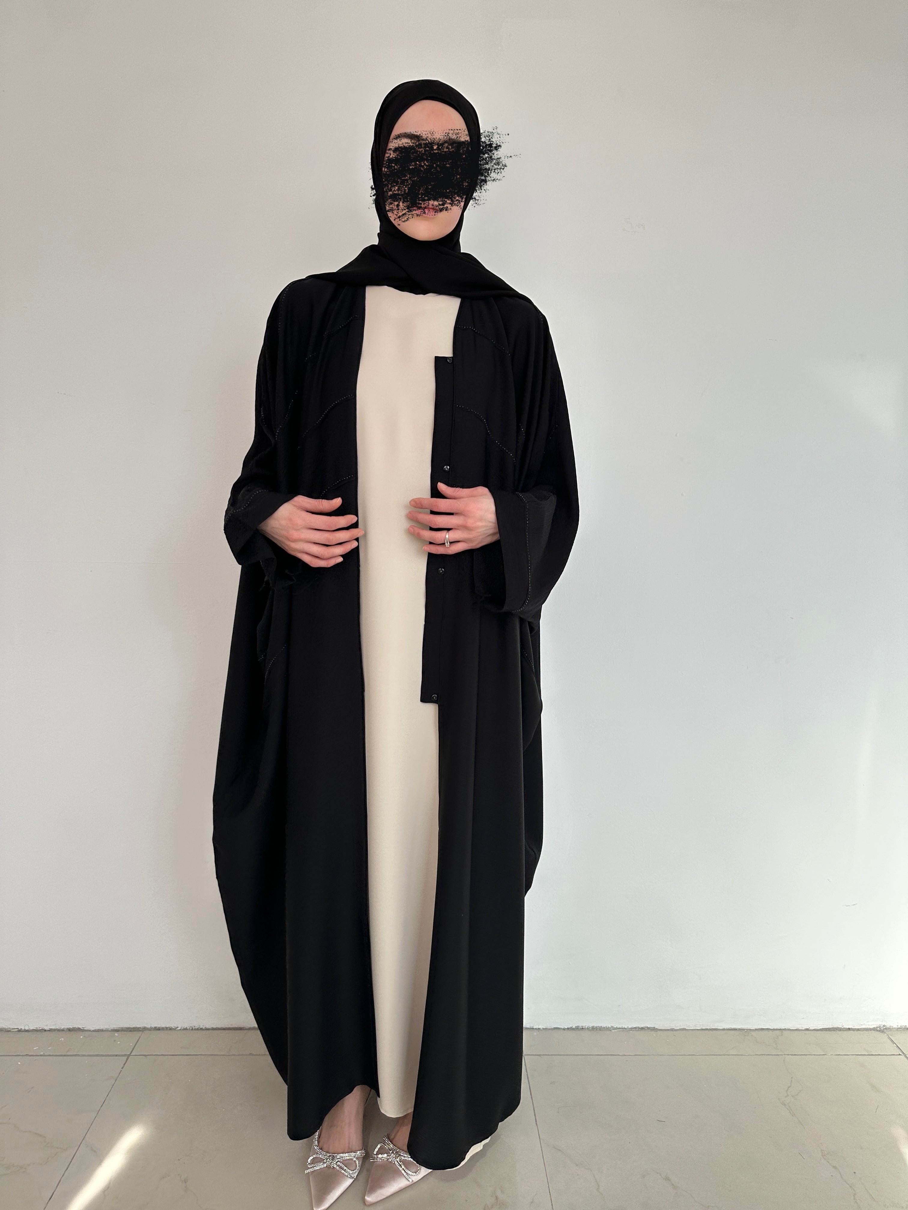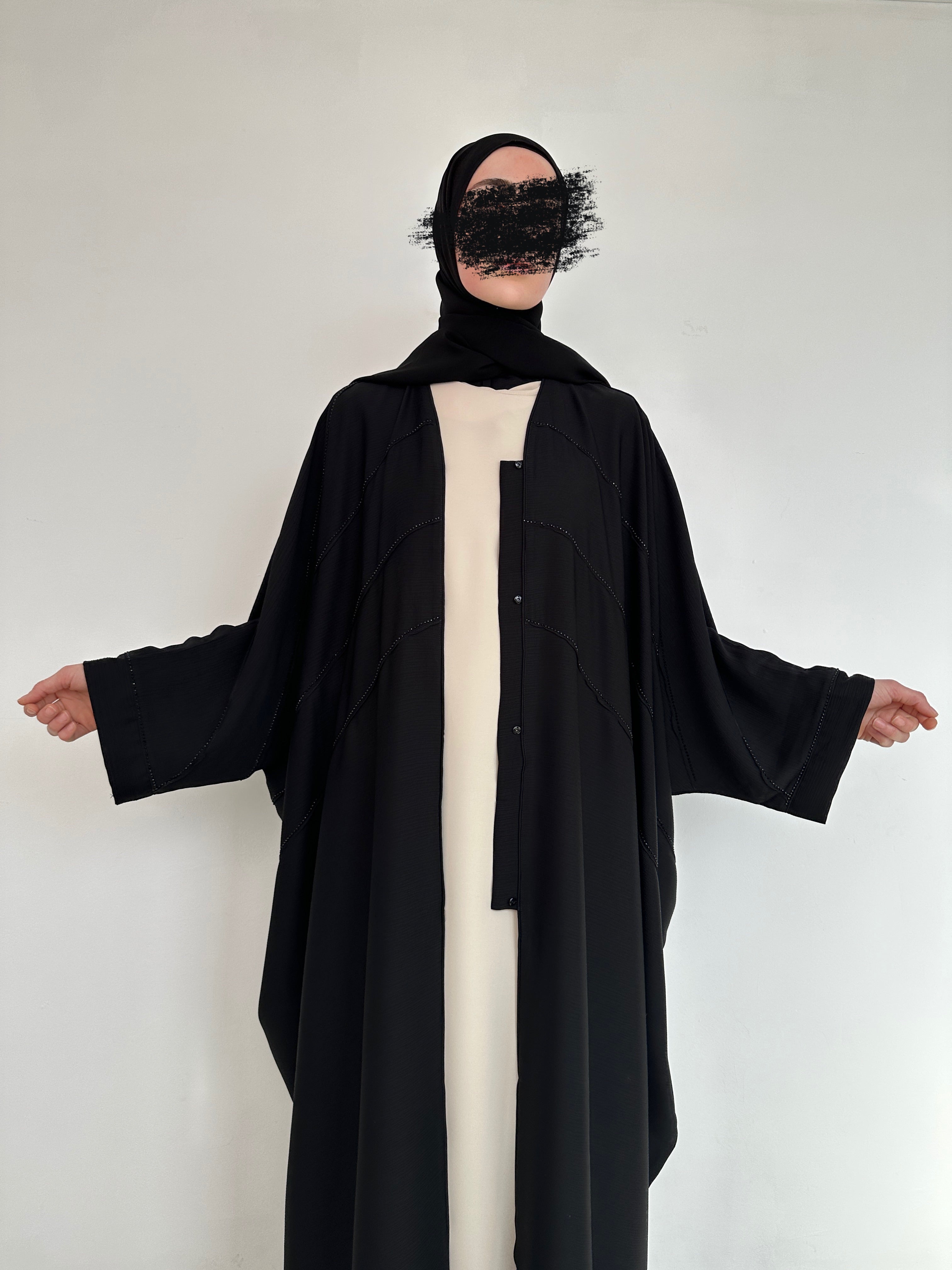 A beautiful and elegant garment that combines tradition and modernity. Crafted from soft, lightweight fabrics, it's embellished with sparkling rhinestones that draw attention to the beauty of its patterns and details. With a matching chiffon hijab.