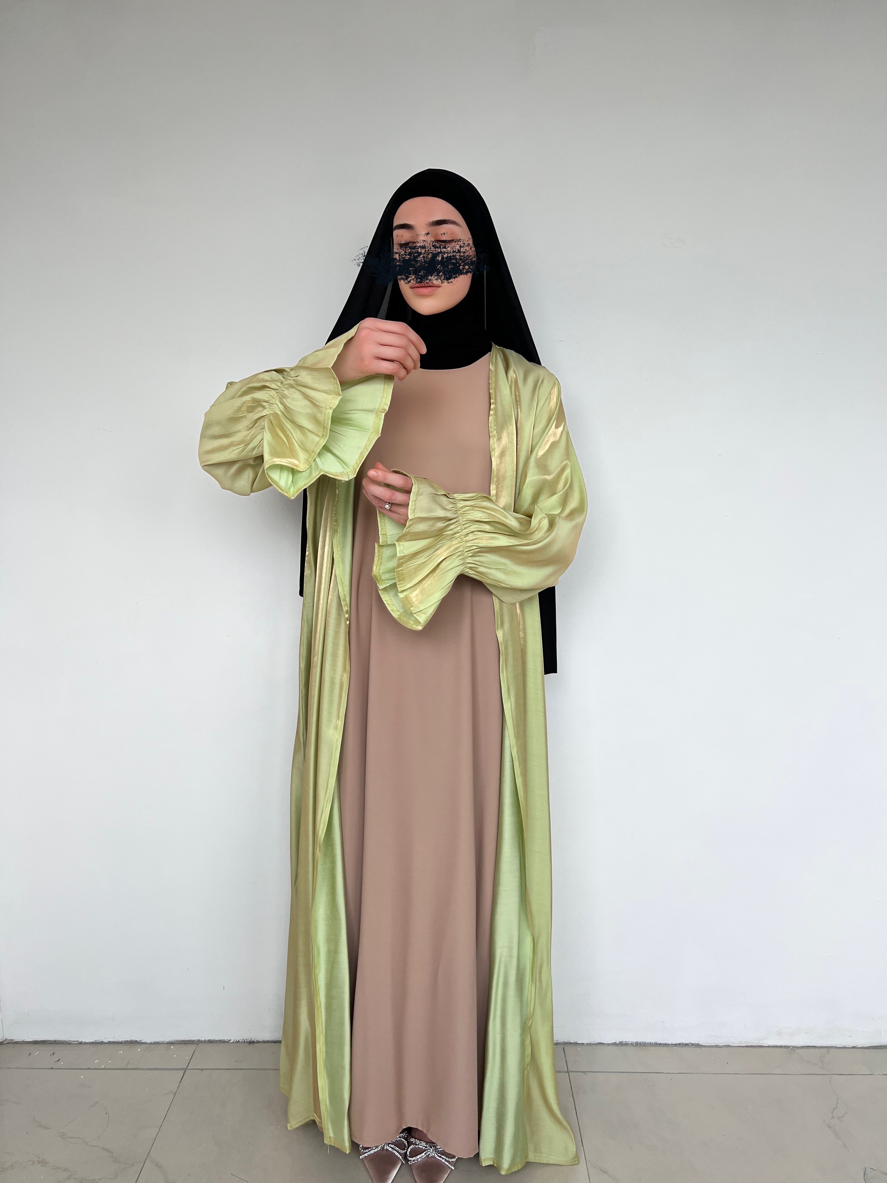 Light and elegant organza kimono, ideal for special occasions or evenings. Made from a fabric type of transparent and delicate fabrics, satin effect, balloon sleeves that add a touch of volume and movement to the set.