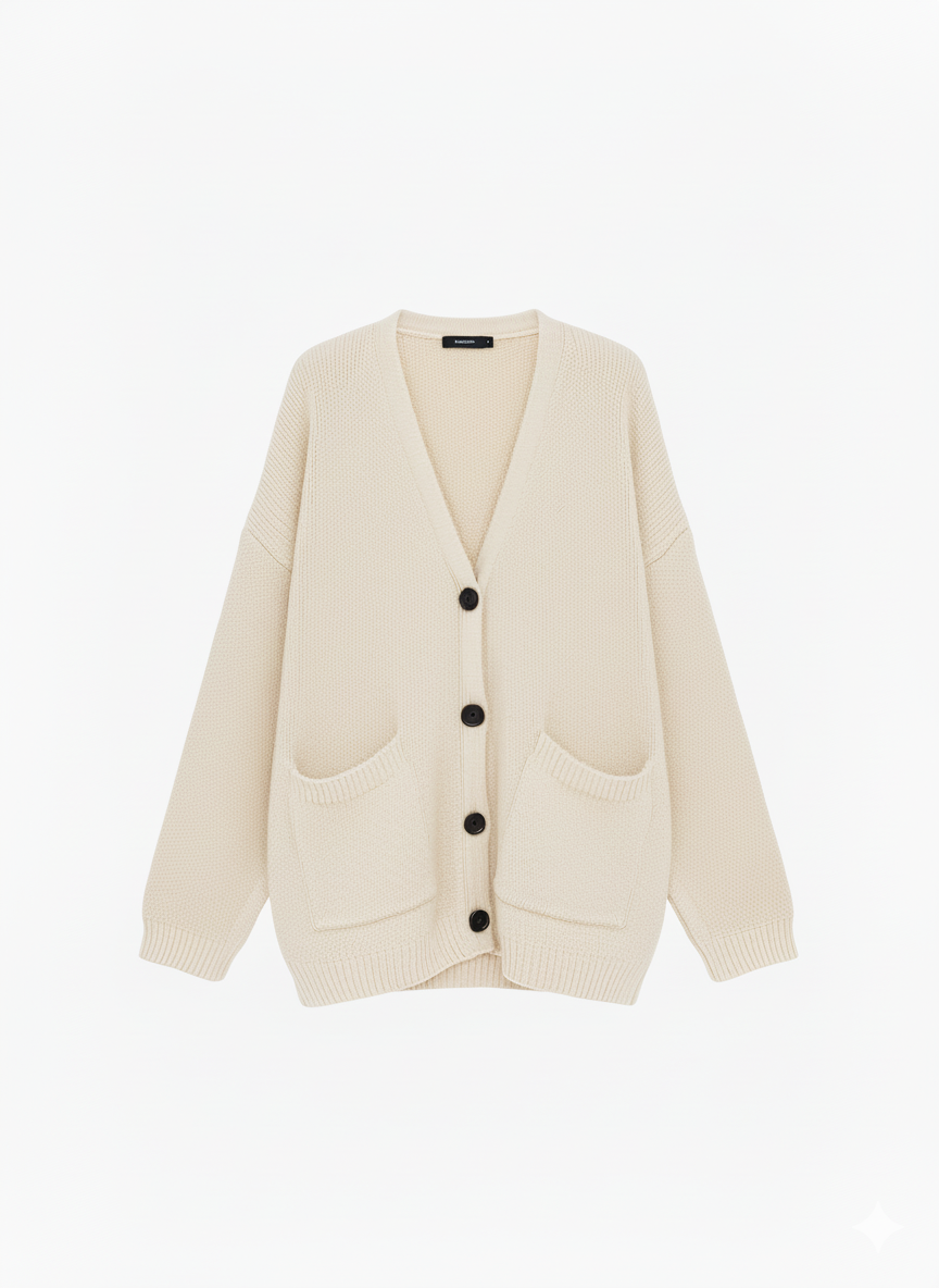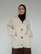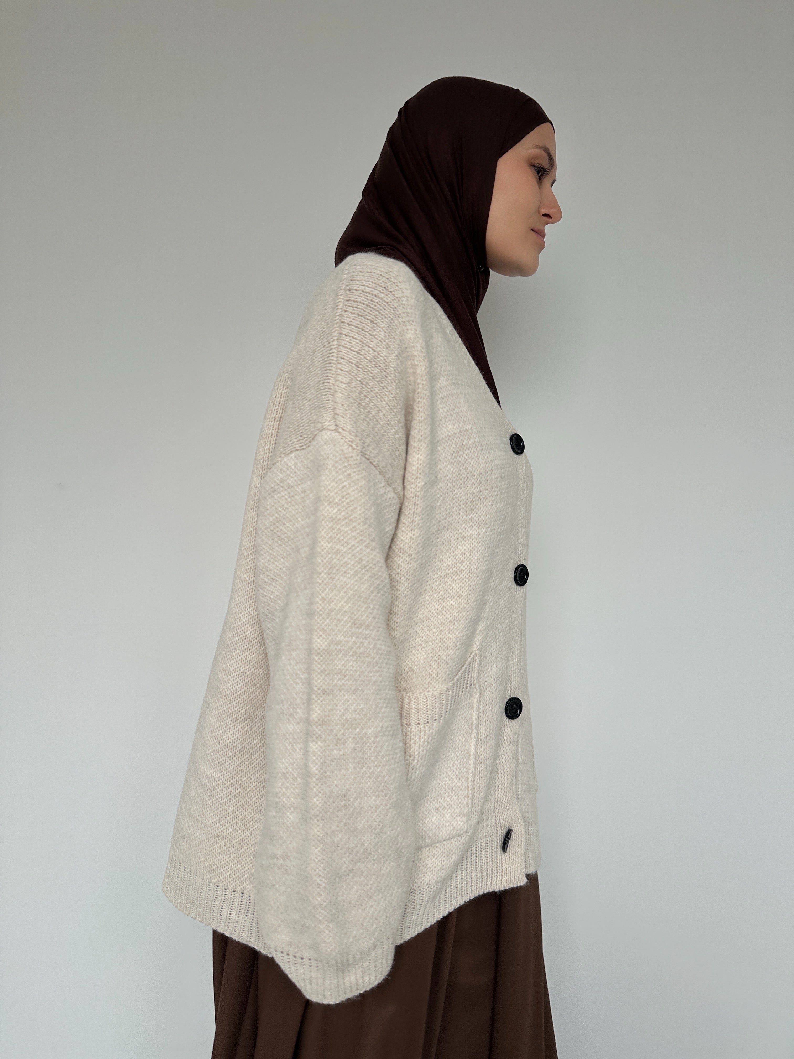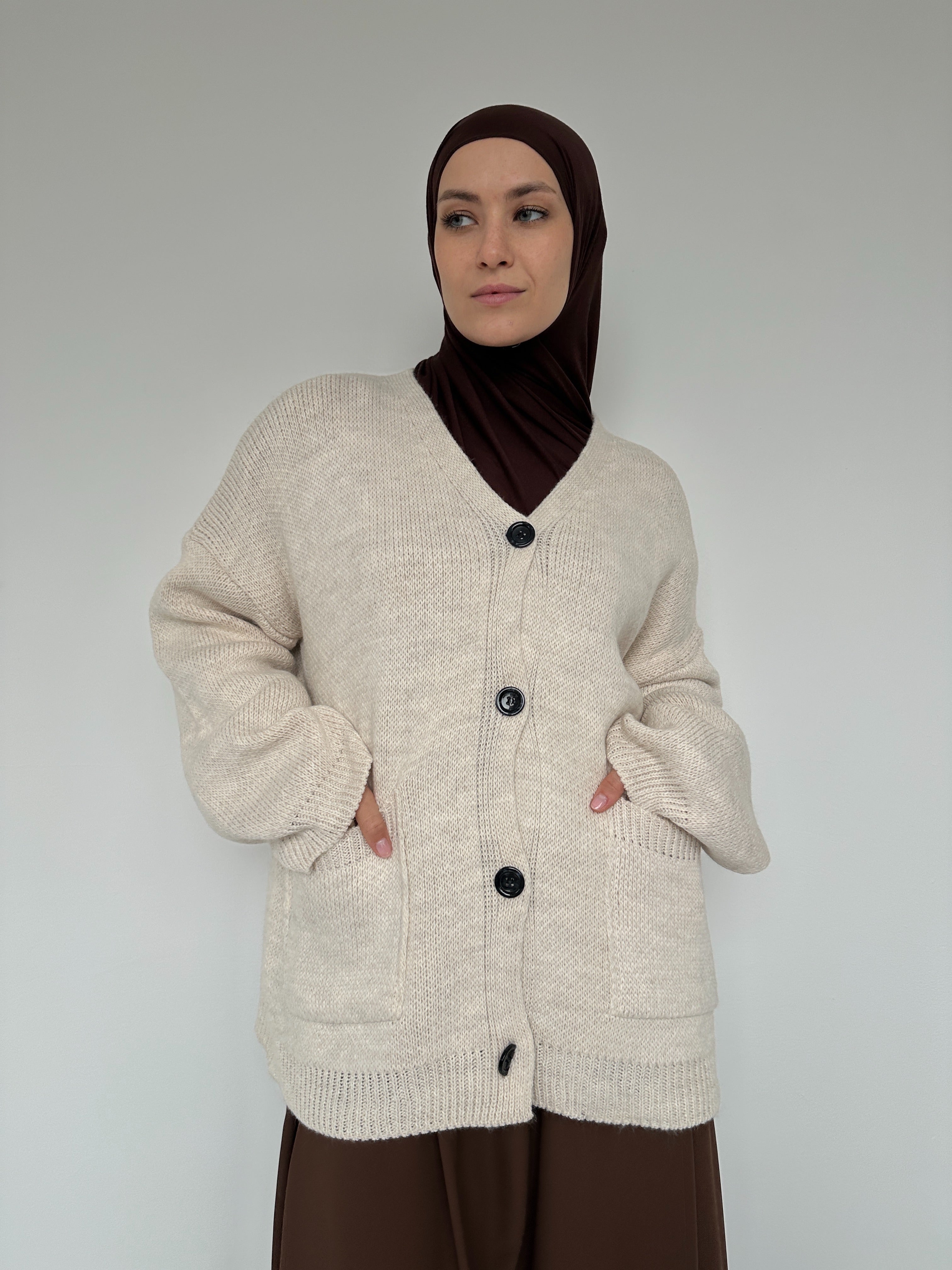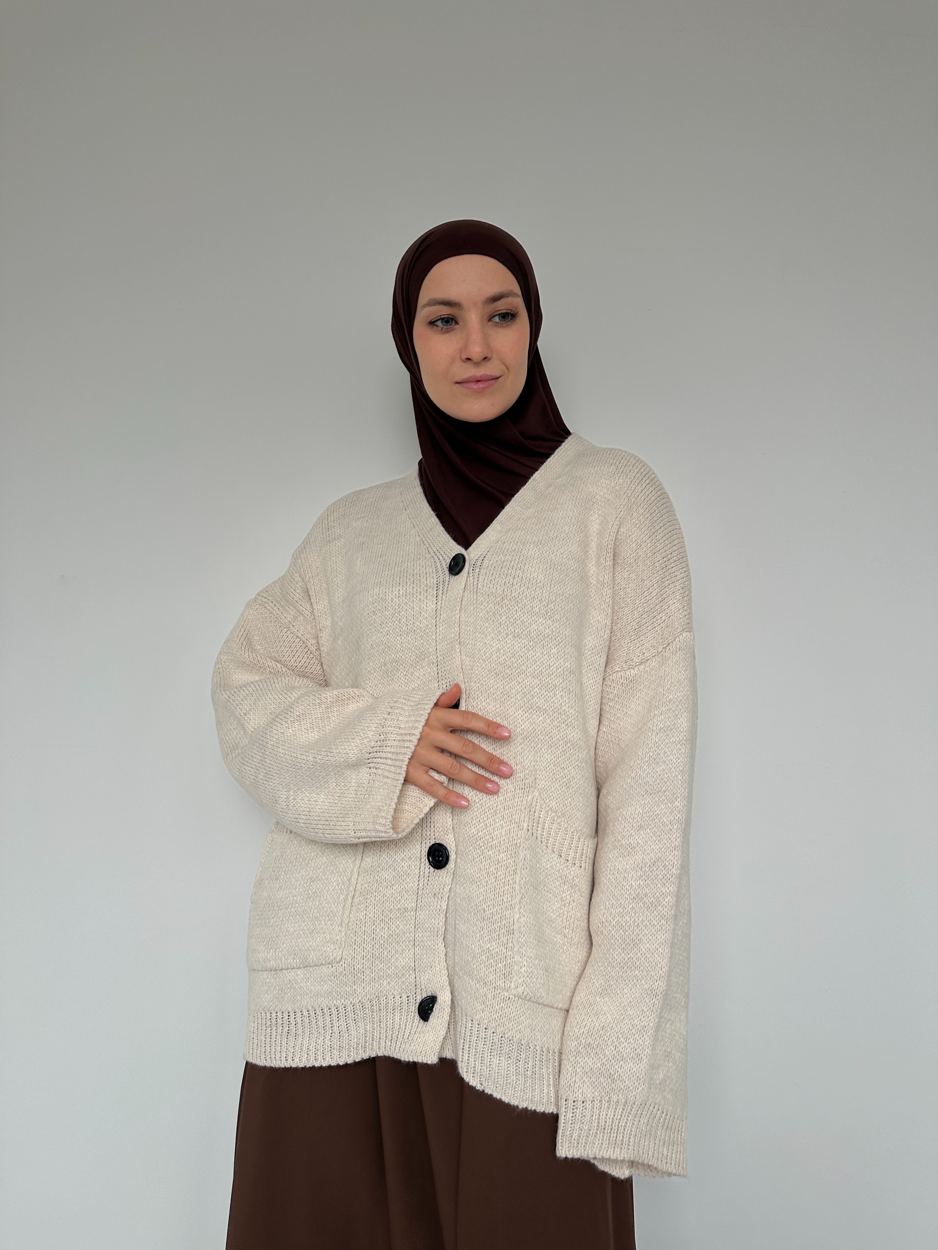 Un cardigan doux et confortable au style minimaliste. Sa coupe oversize et ses manches tombantes apportent une allure moderne et décontractée. Idéal pour la mi-saison, à porter sur une robe, un top ou une abaya pour un look élégant et cosy.