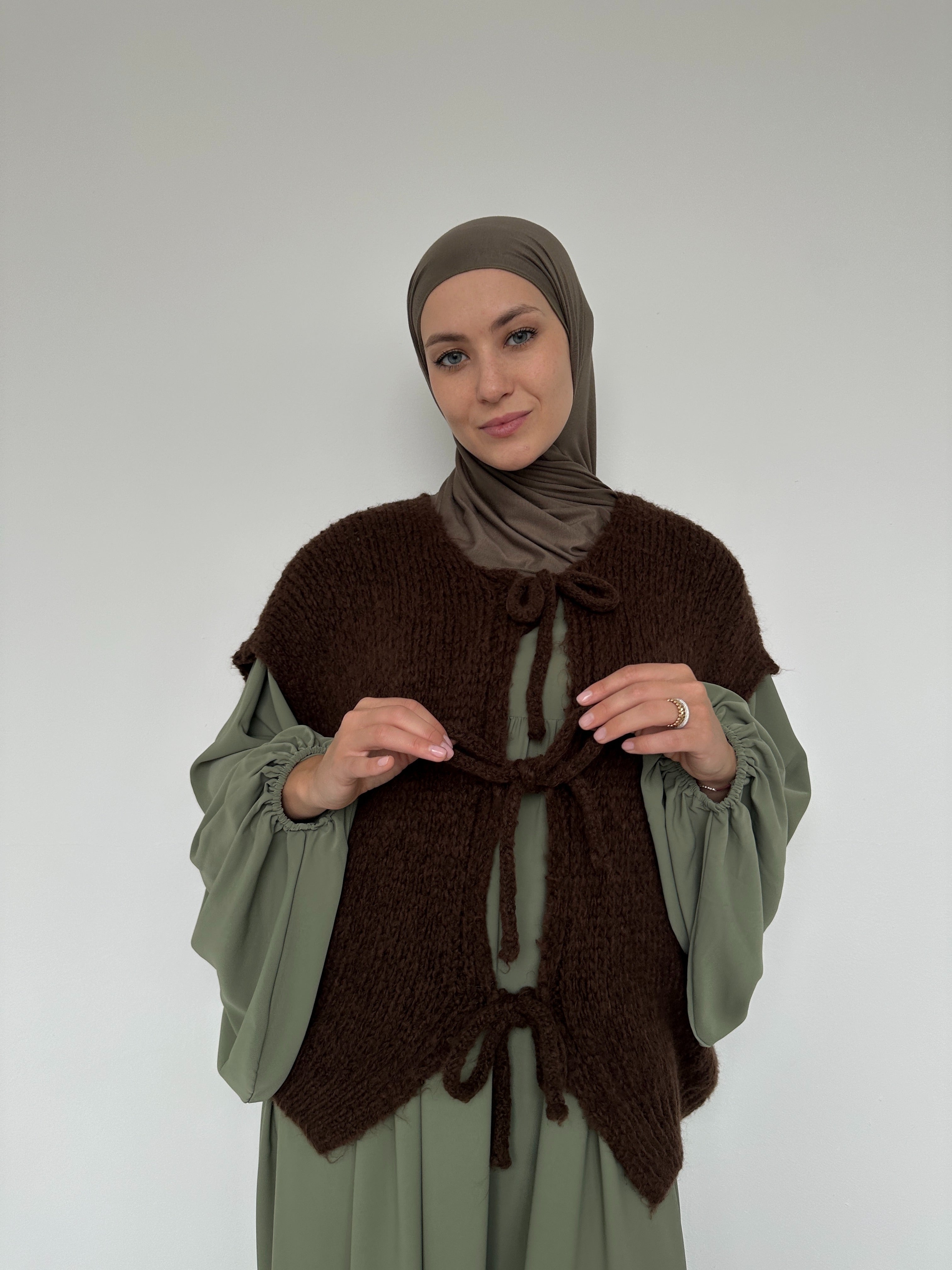 Cette veste sans manches se distingue par sa coupe minimaliste et sa texture confortable — idéale à superposer sur une chemise, une abaya ou un pull léger.