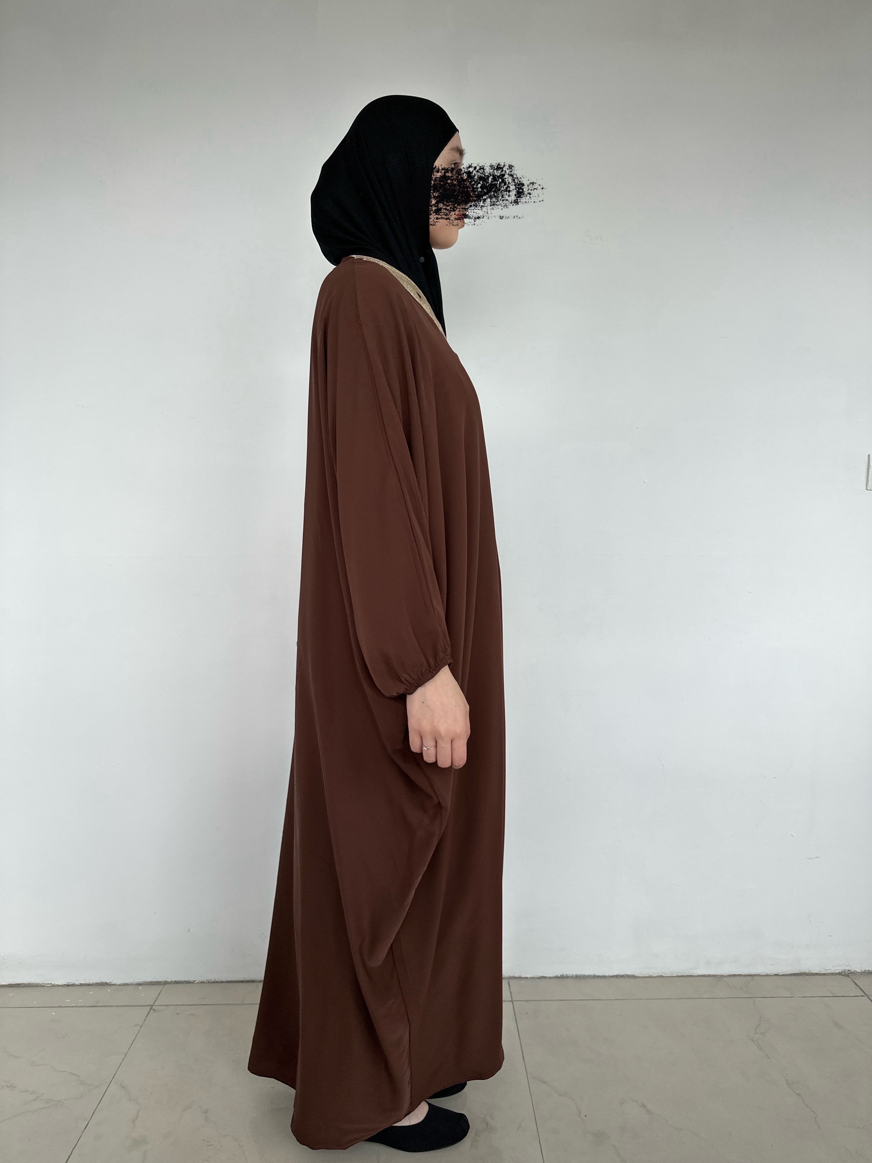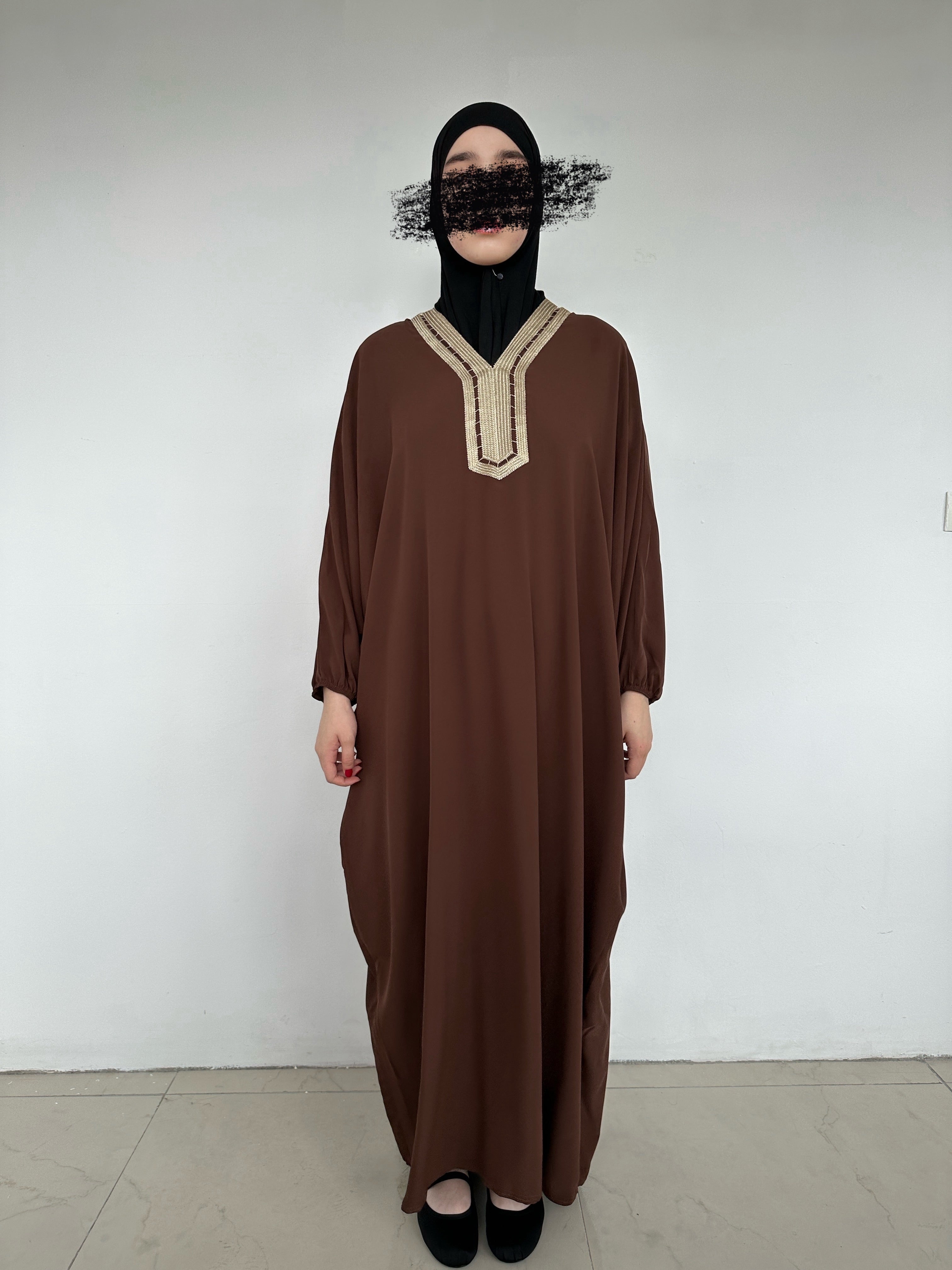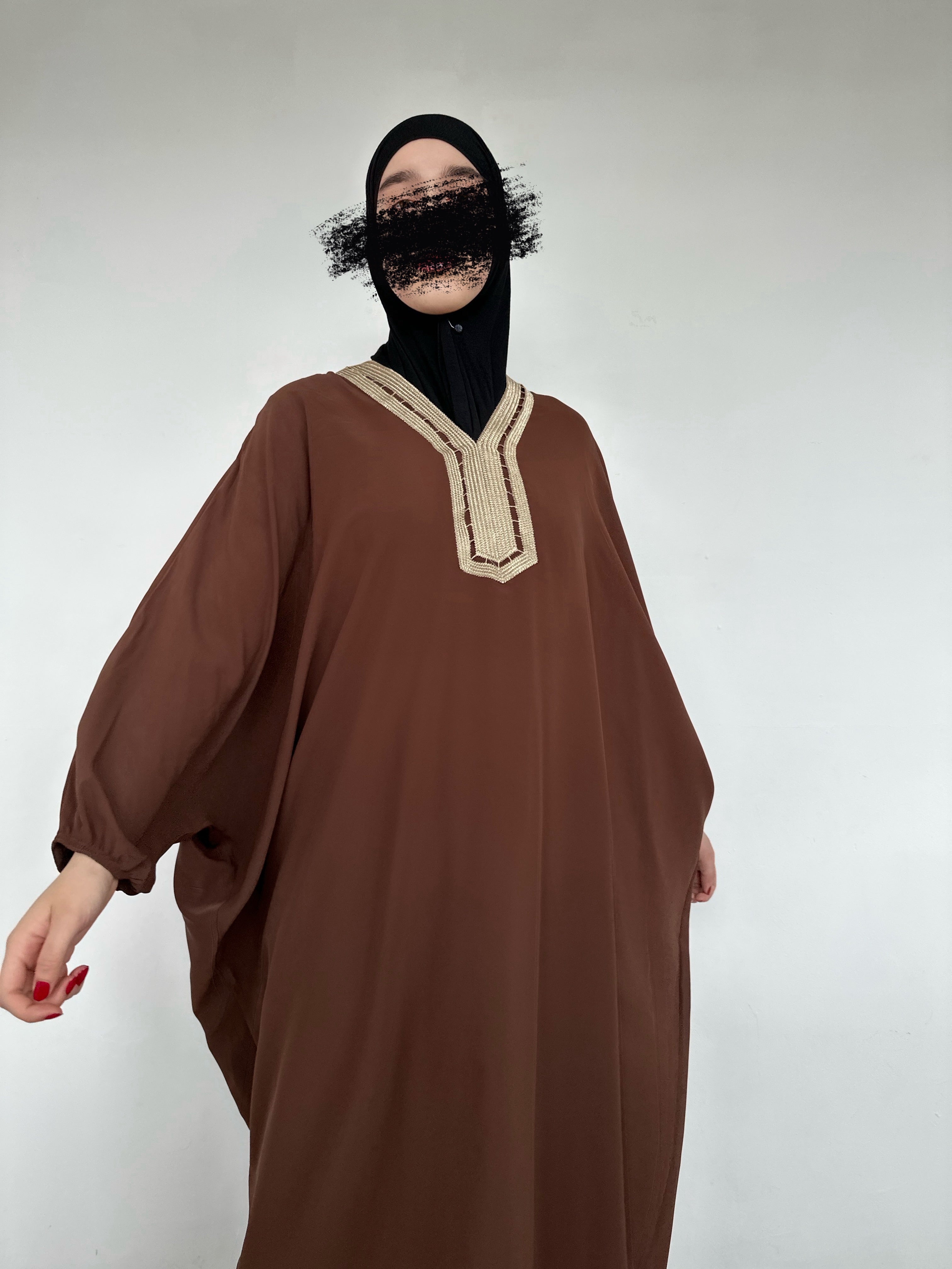 Djellaba avec détails sophistiqués au niveau du col. Manches papillon accordant amplitude. Les bouts de manches élastiques empêchent celles-ci de remonter.