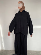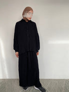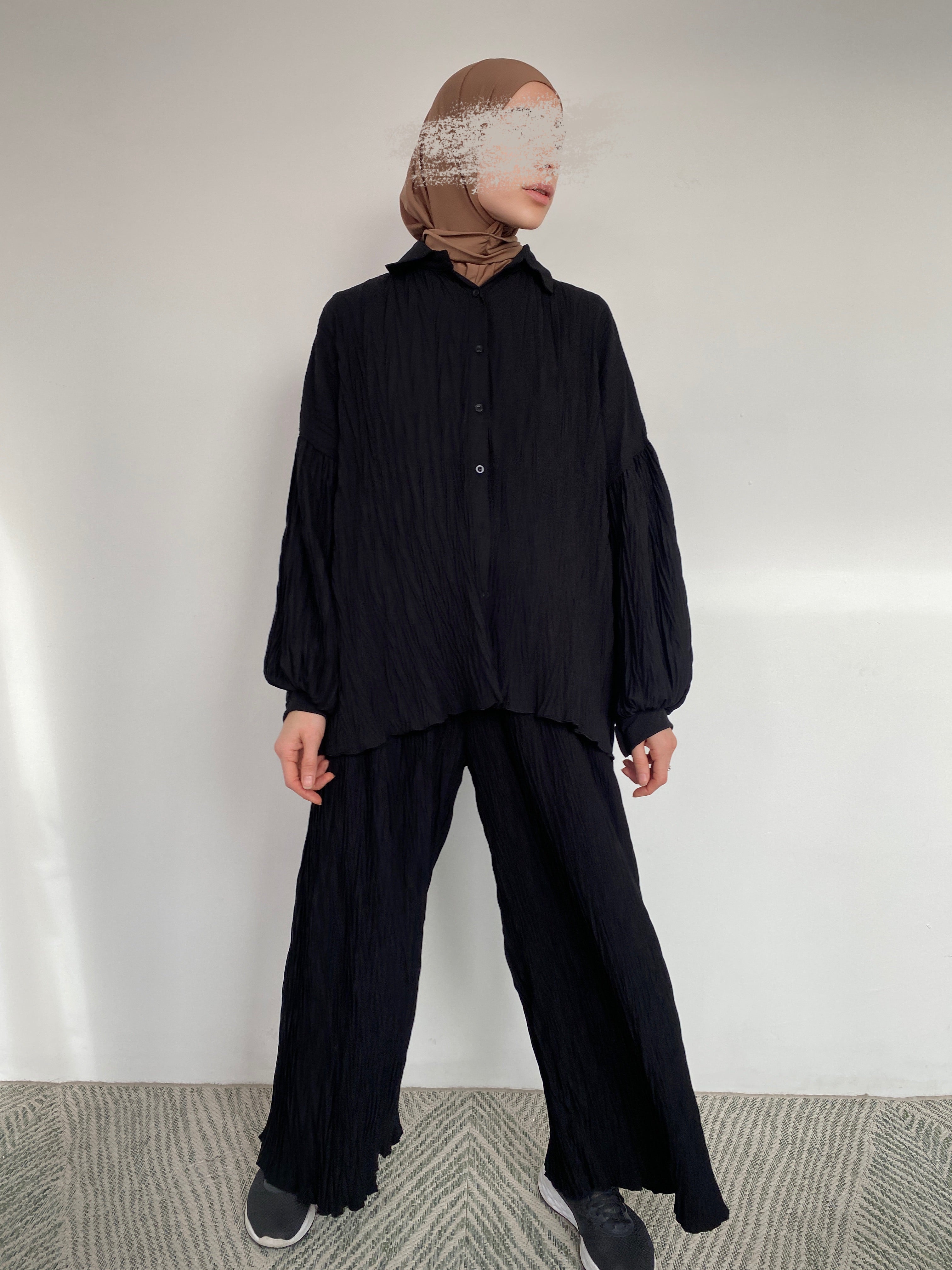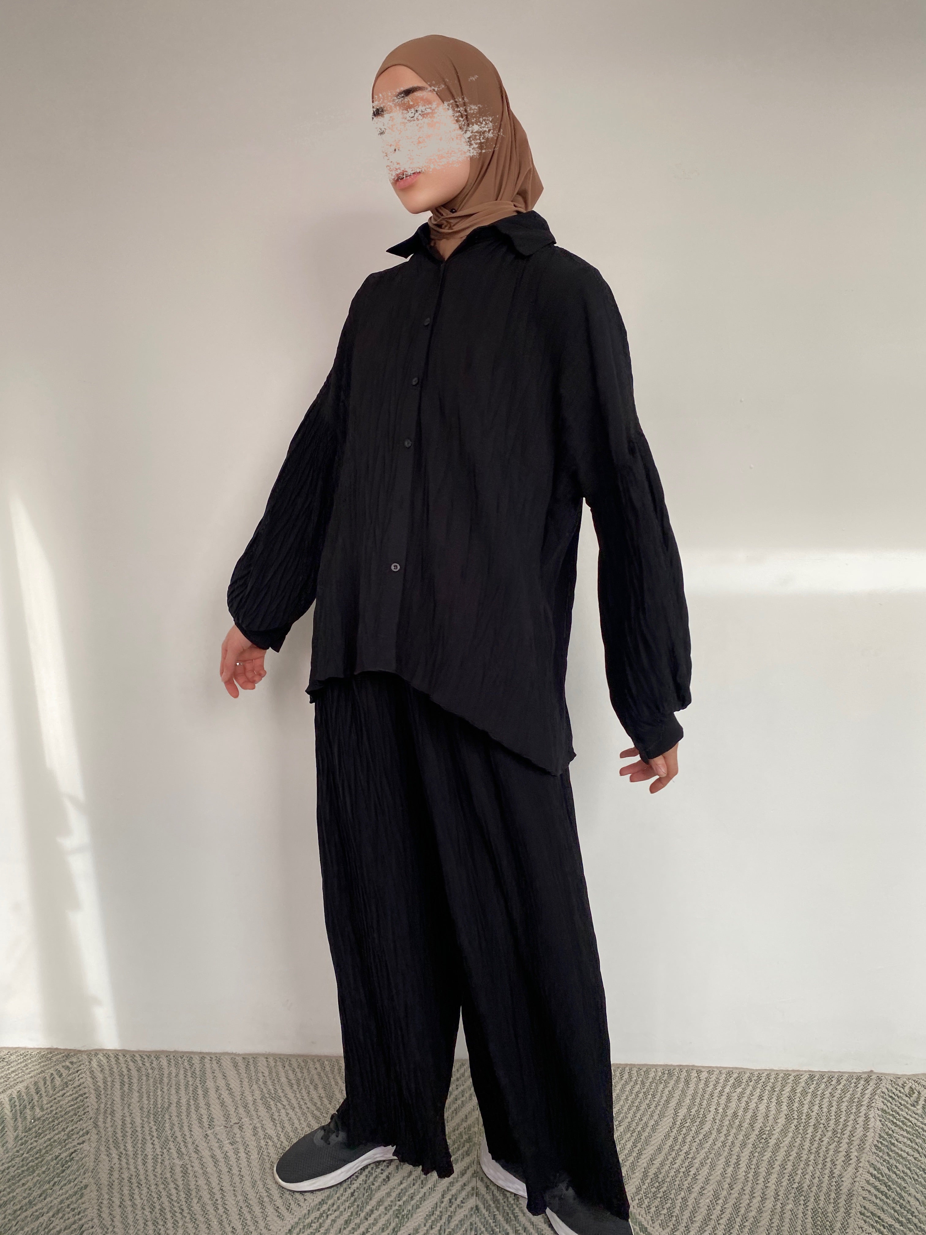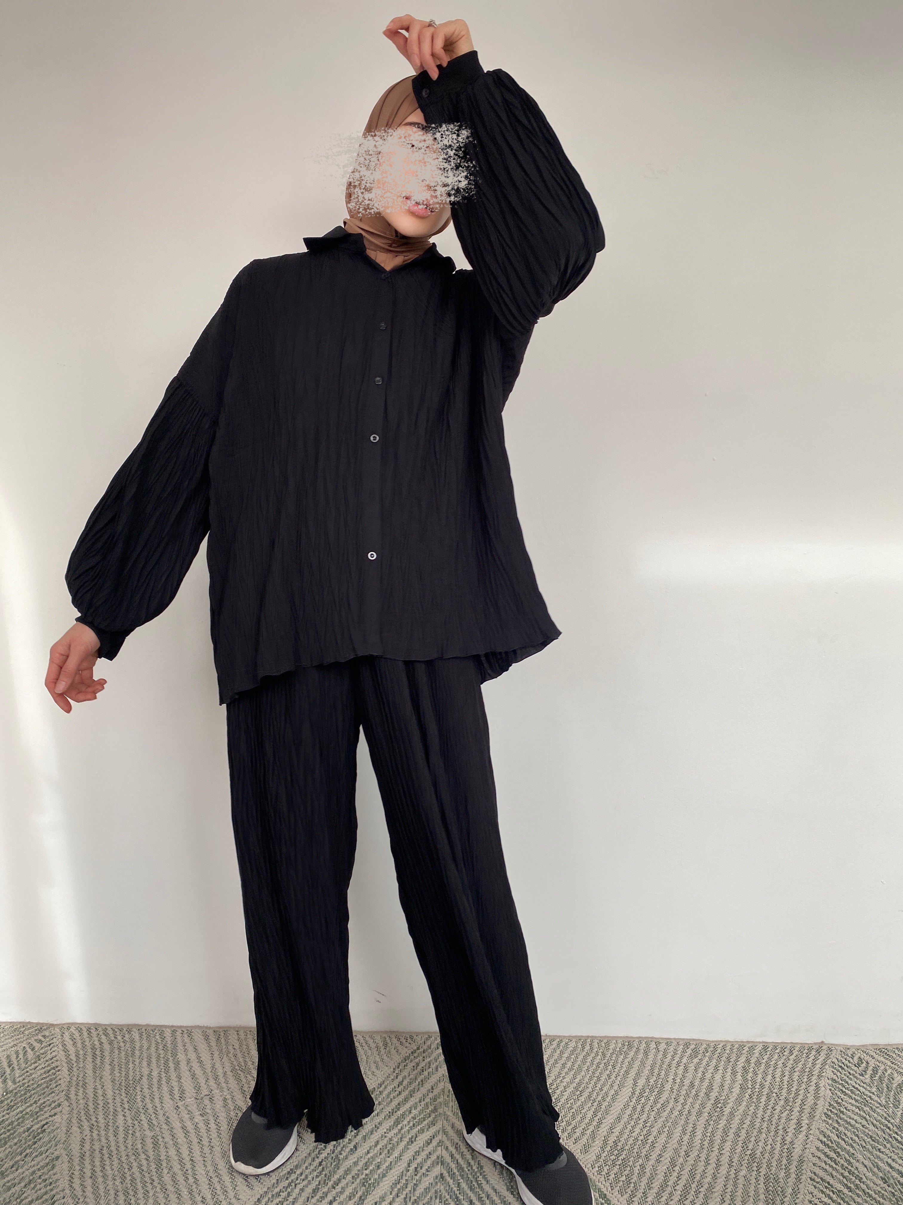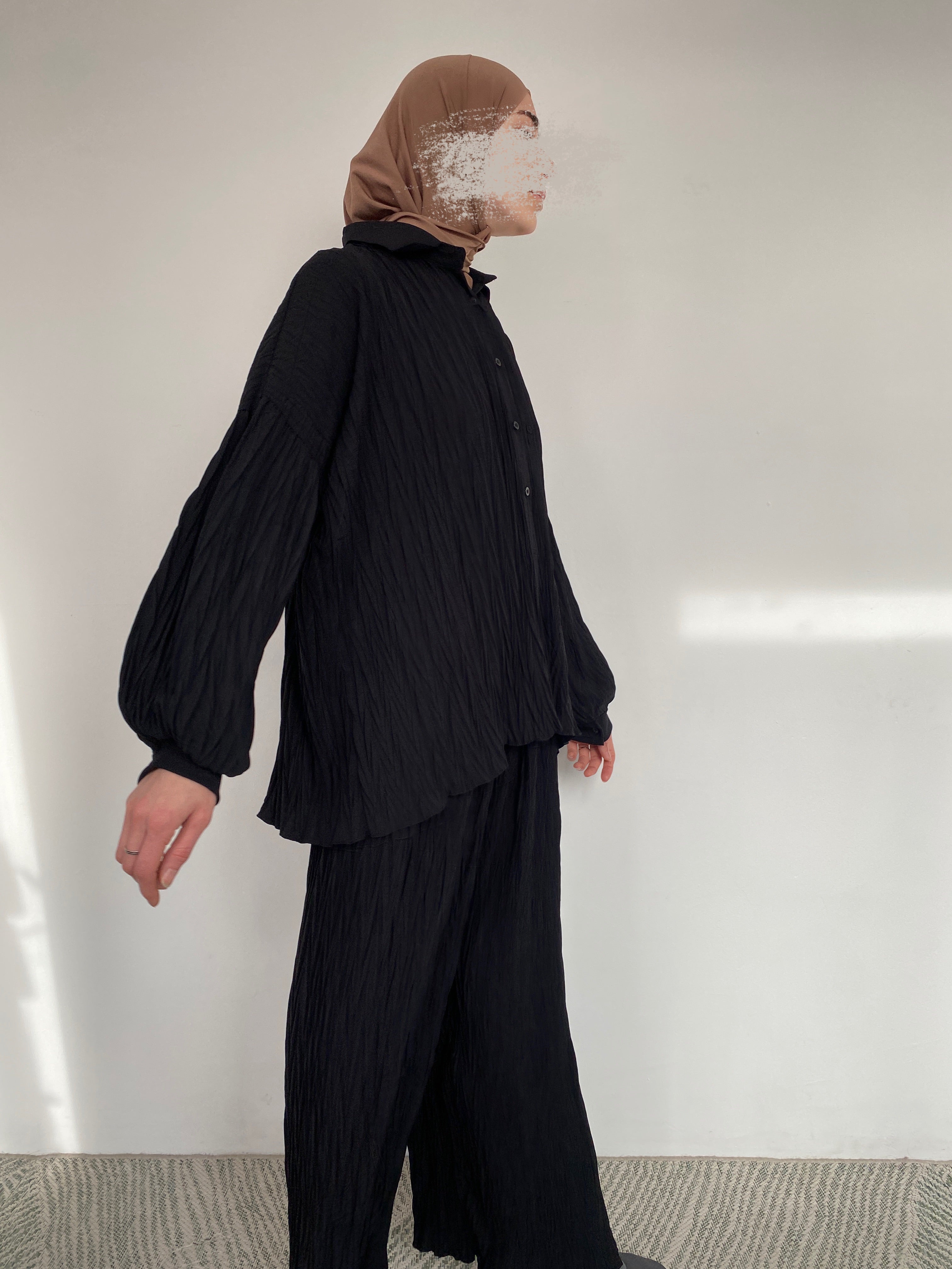 Ensemble composé d'une chemise et d'un pantalon large. Effet plissé. Chemise avec manches bouffantes et ourlet boutonné.