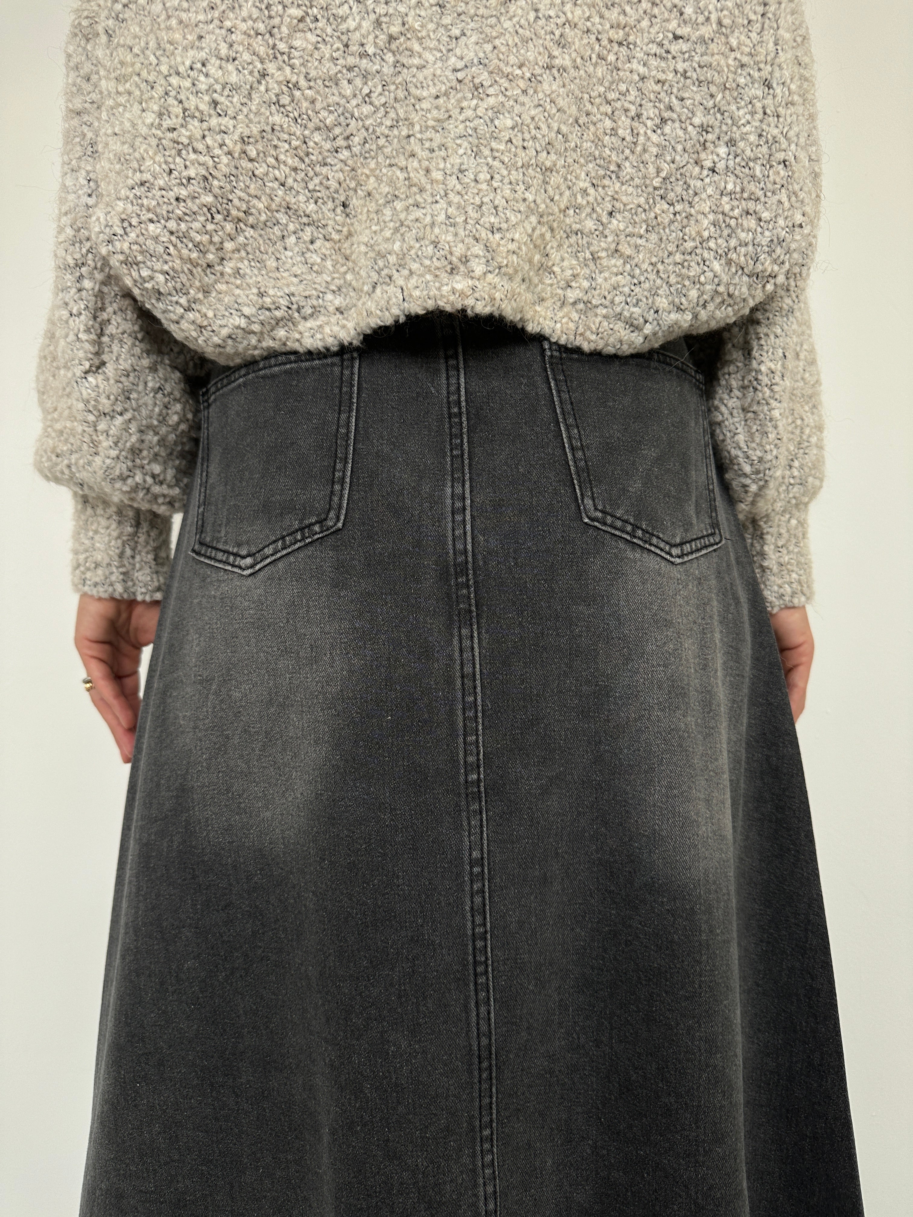 Cette jupe longue en jean allie confort et style, parfaite pour un look casual ou chic selon les accessoires.