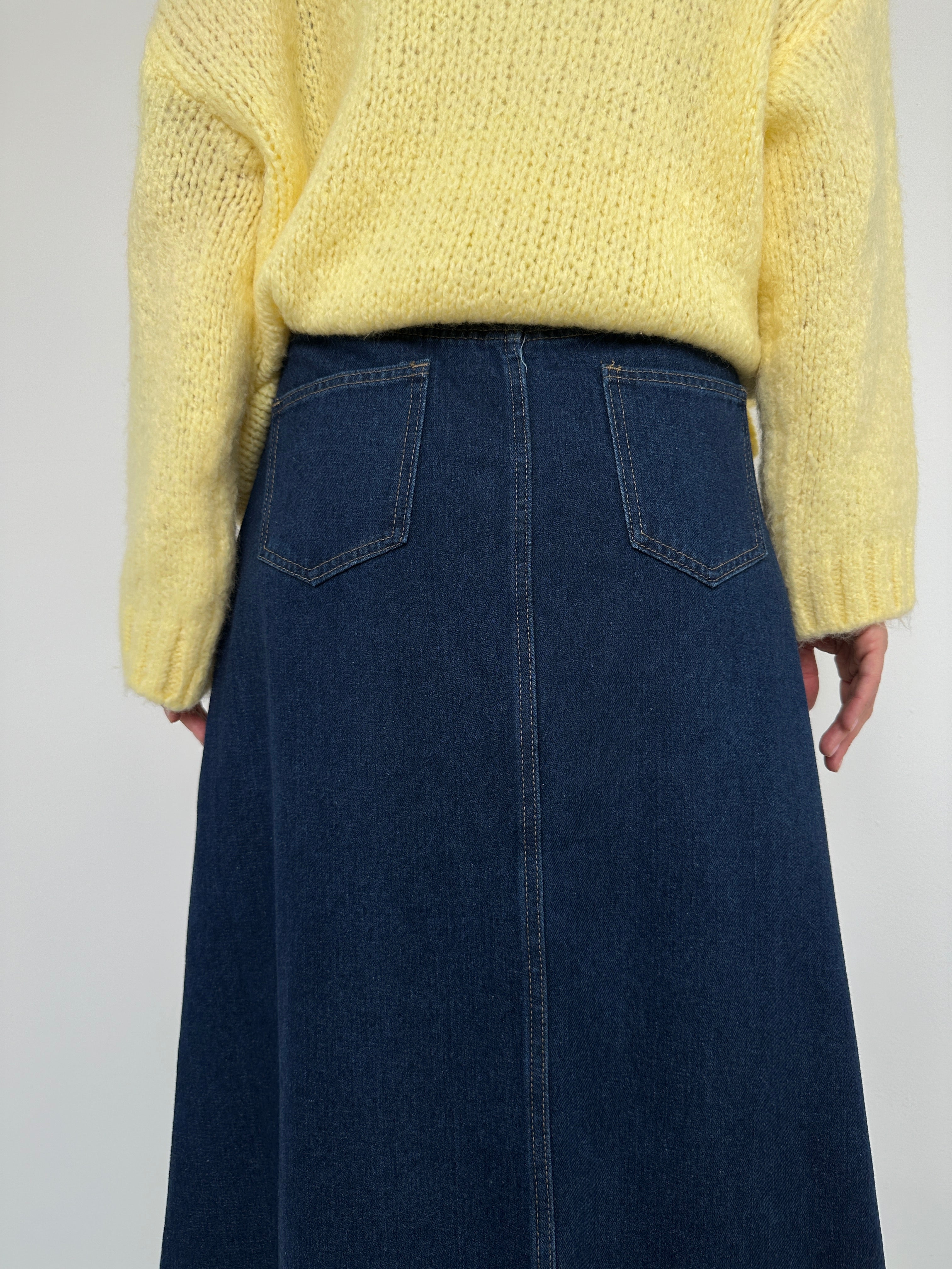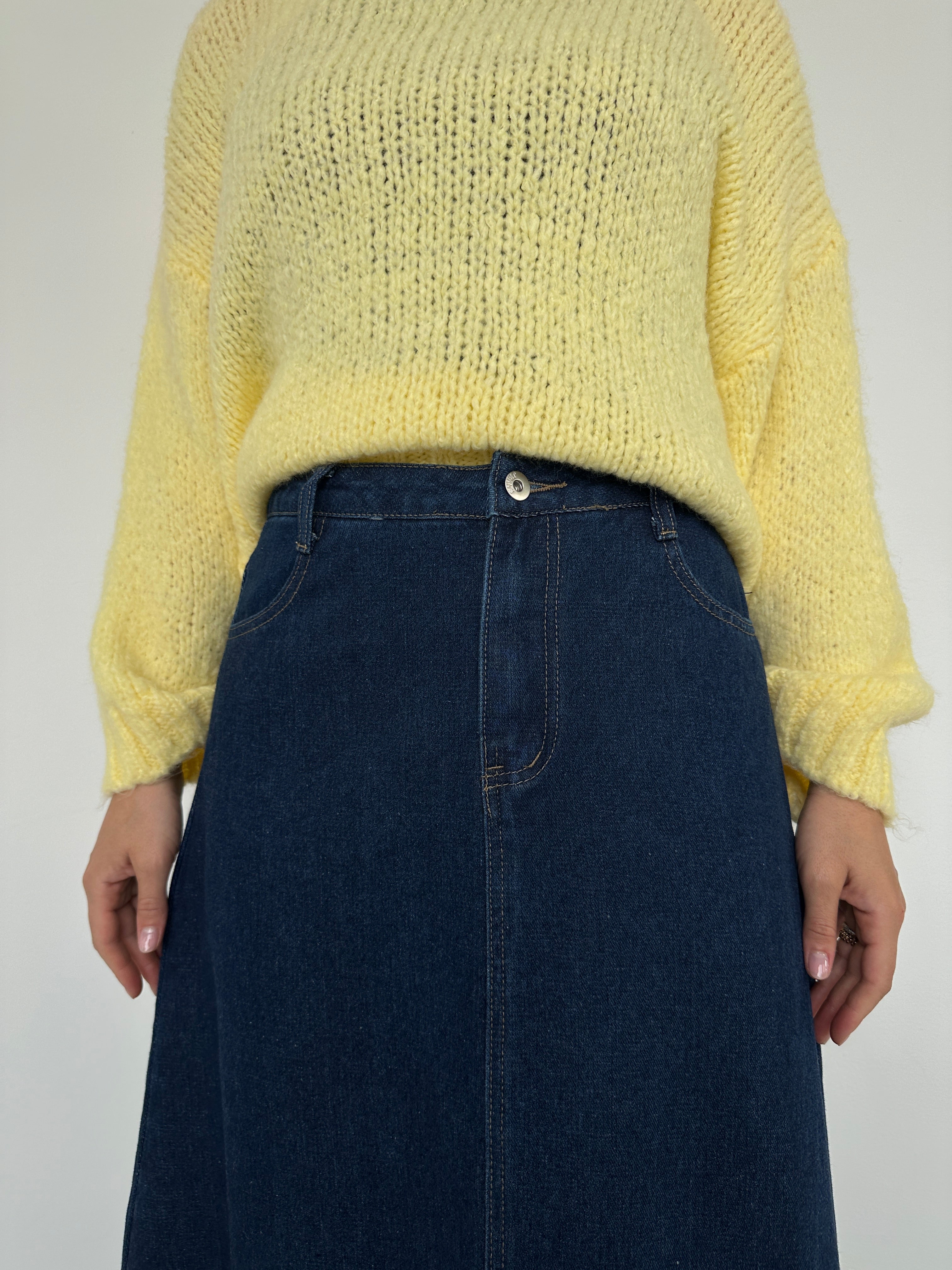 Cette jupe longue en jean allie confort et style, parfaite pour un look casual ou chic selon les accessoires.