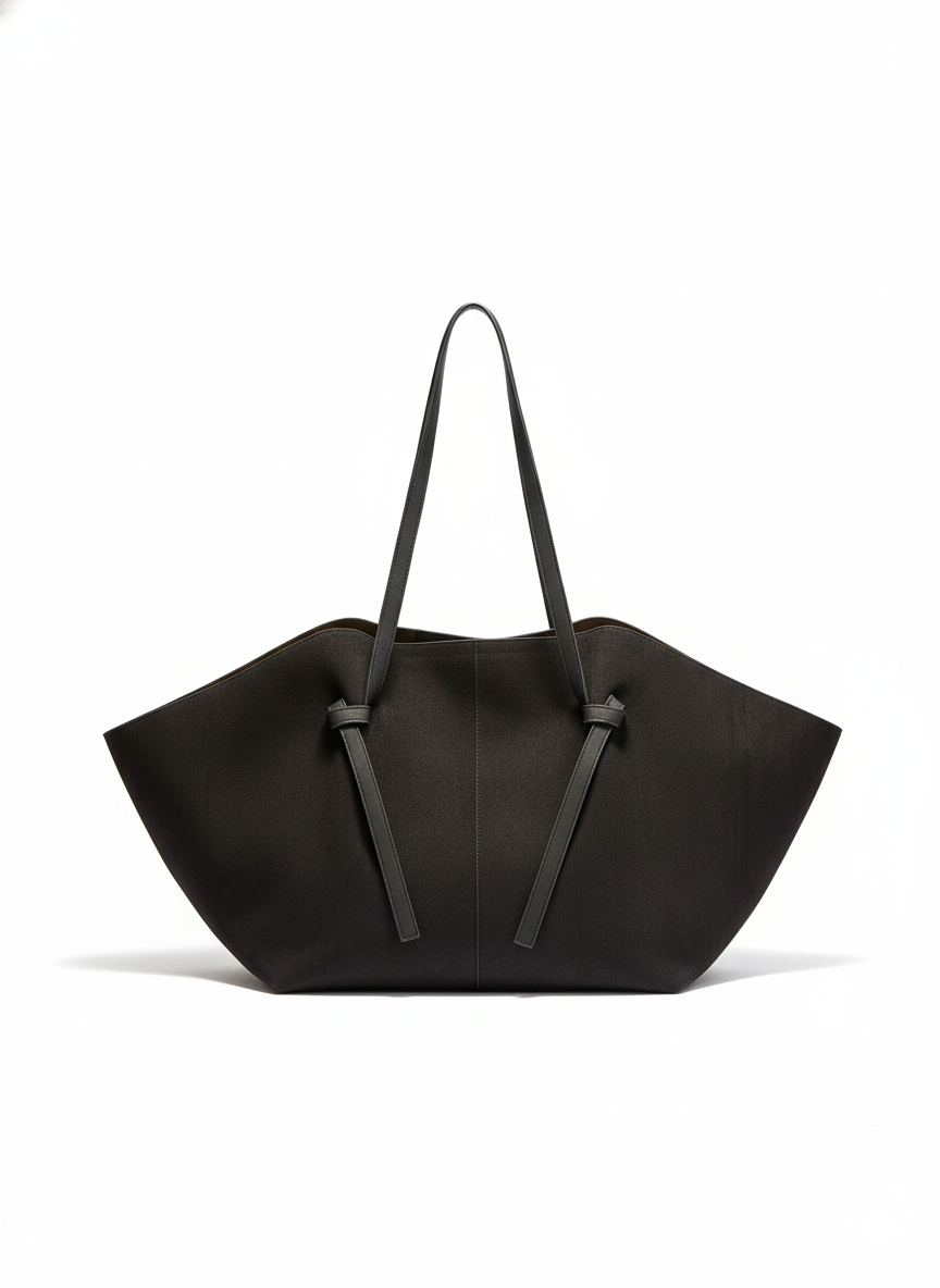 Ce sac cabas est la pièce maîtresse pour celles et ceux qui recherchent un maximum d'espace sans compromettre le style. Réalisé dans un noir intense et confectionné dans un matériau doux à l'aspect velours/suédine, il allie minimalisme contemporain et capacité impressionnante.