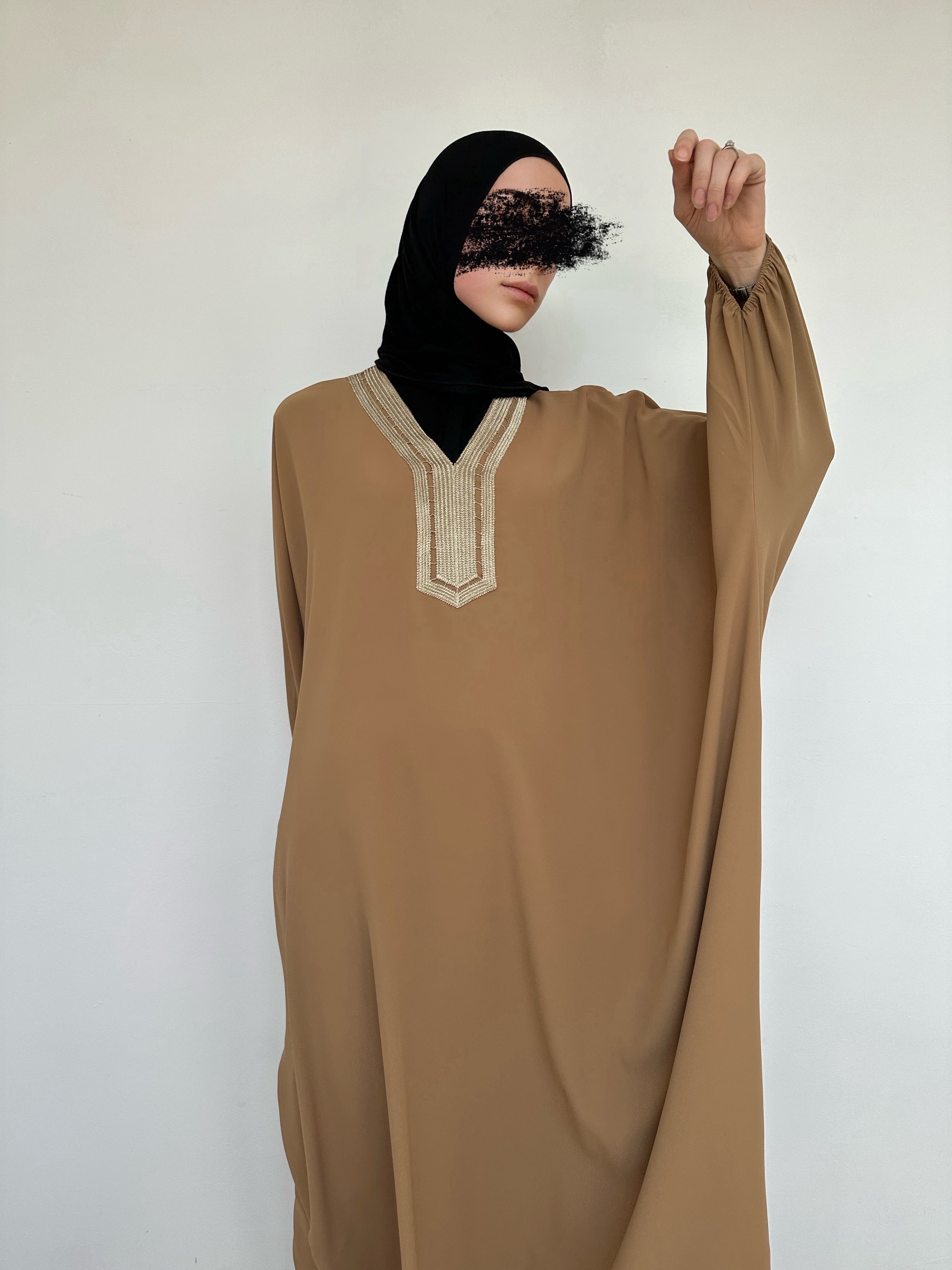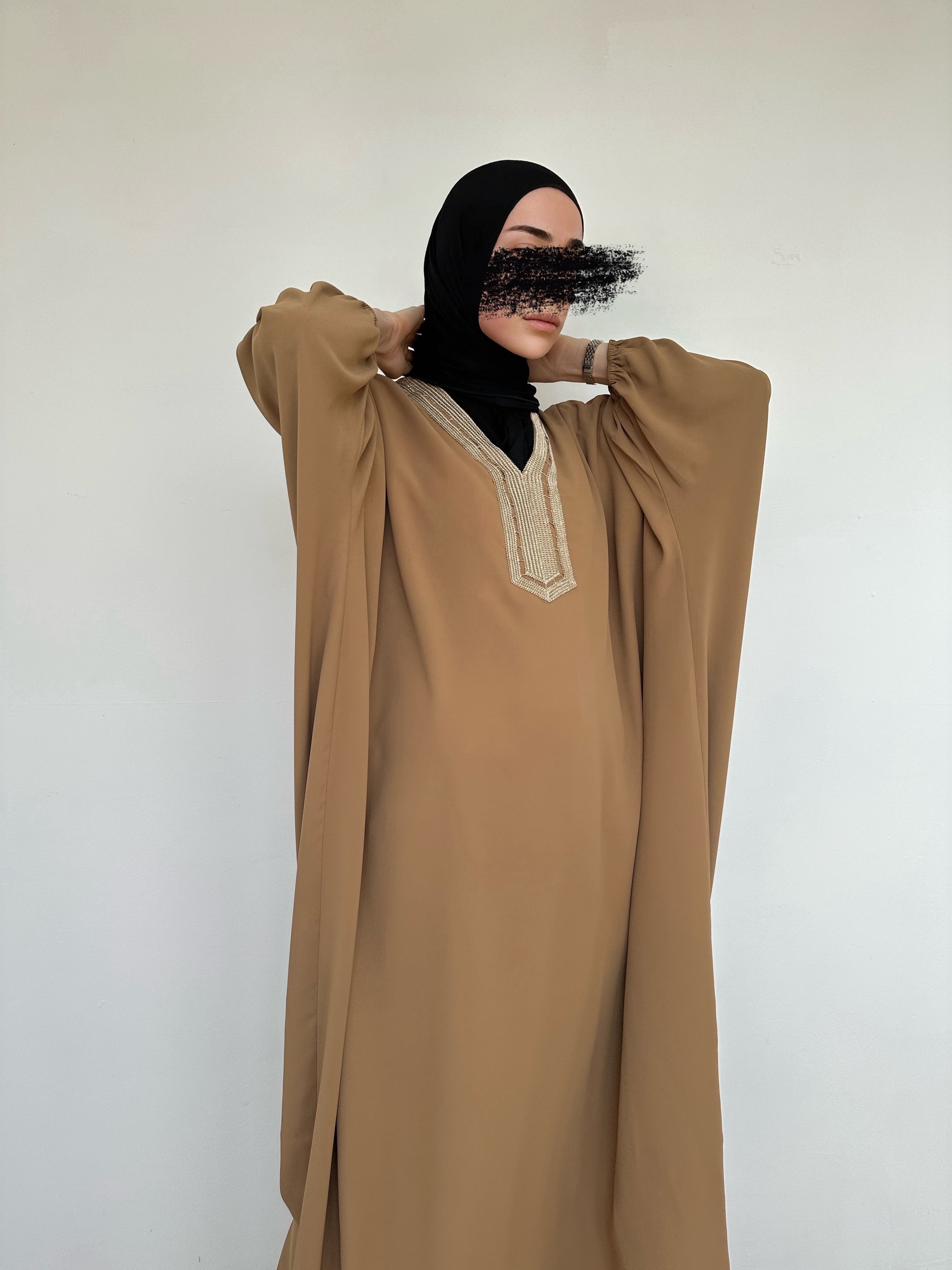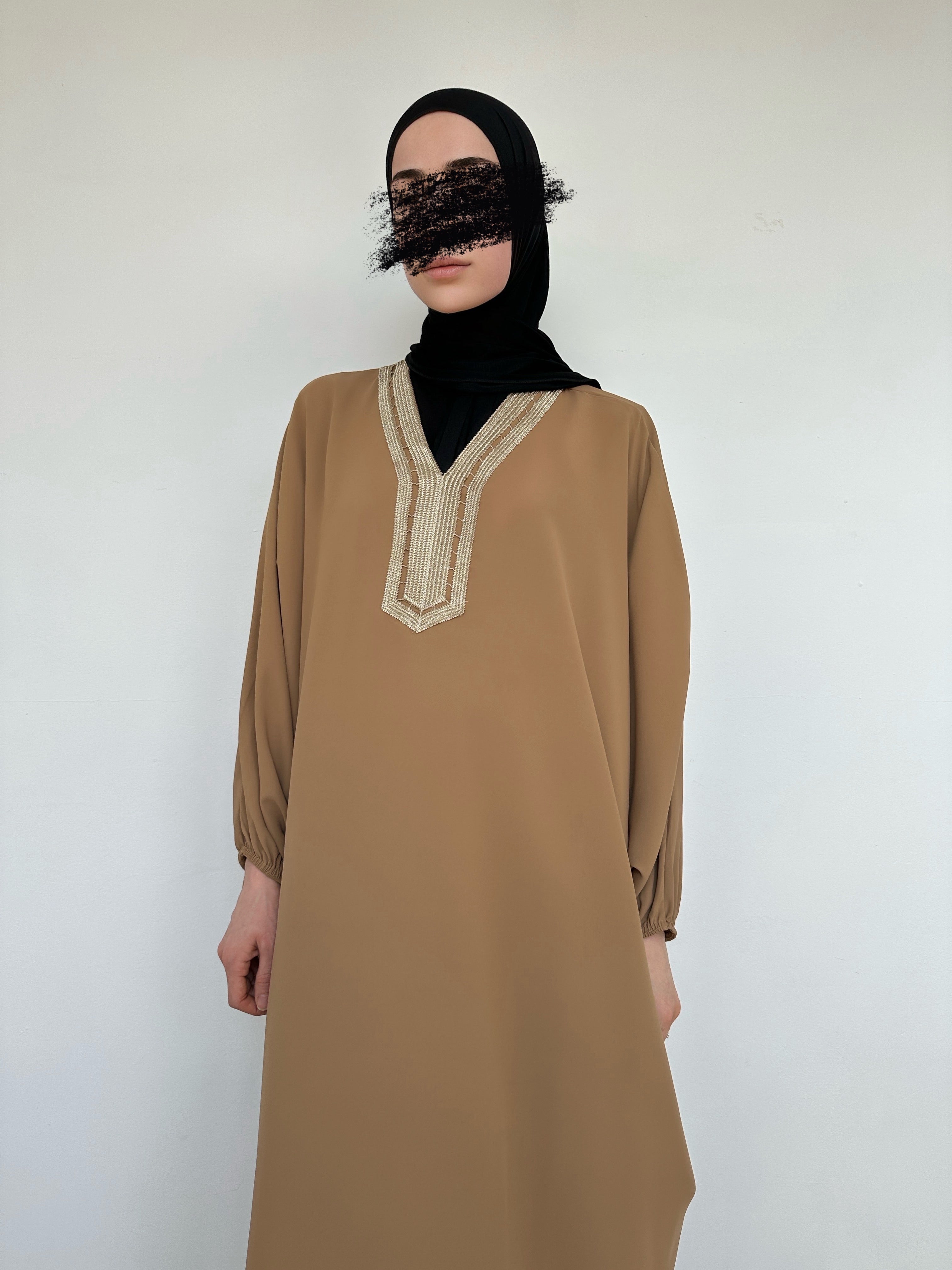 Djellaba avec détails sophistiqués au niveau du col. Manches papillon accordant amplitude. Les bouts de manches élastiques empêchent celles-ci de remonter.