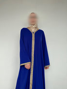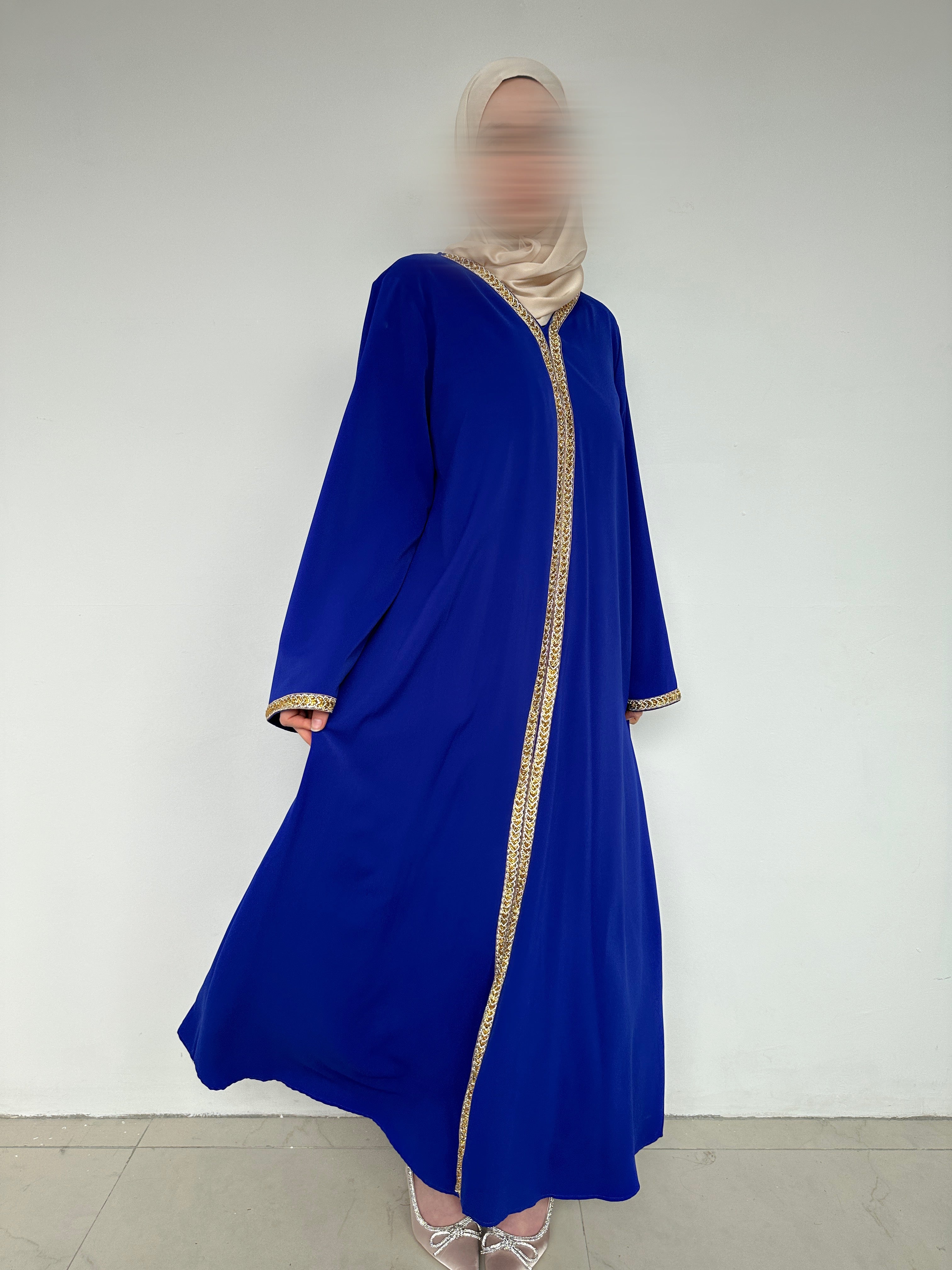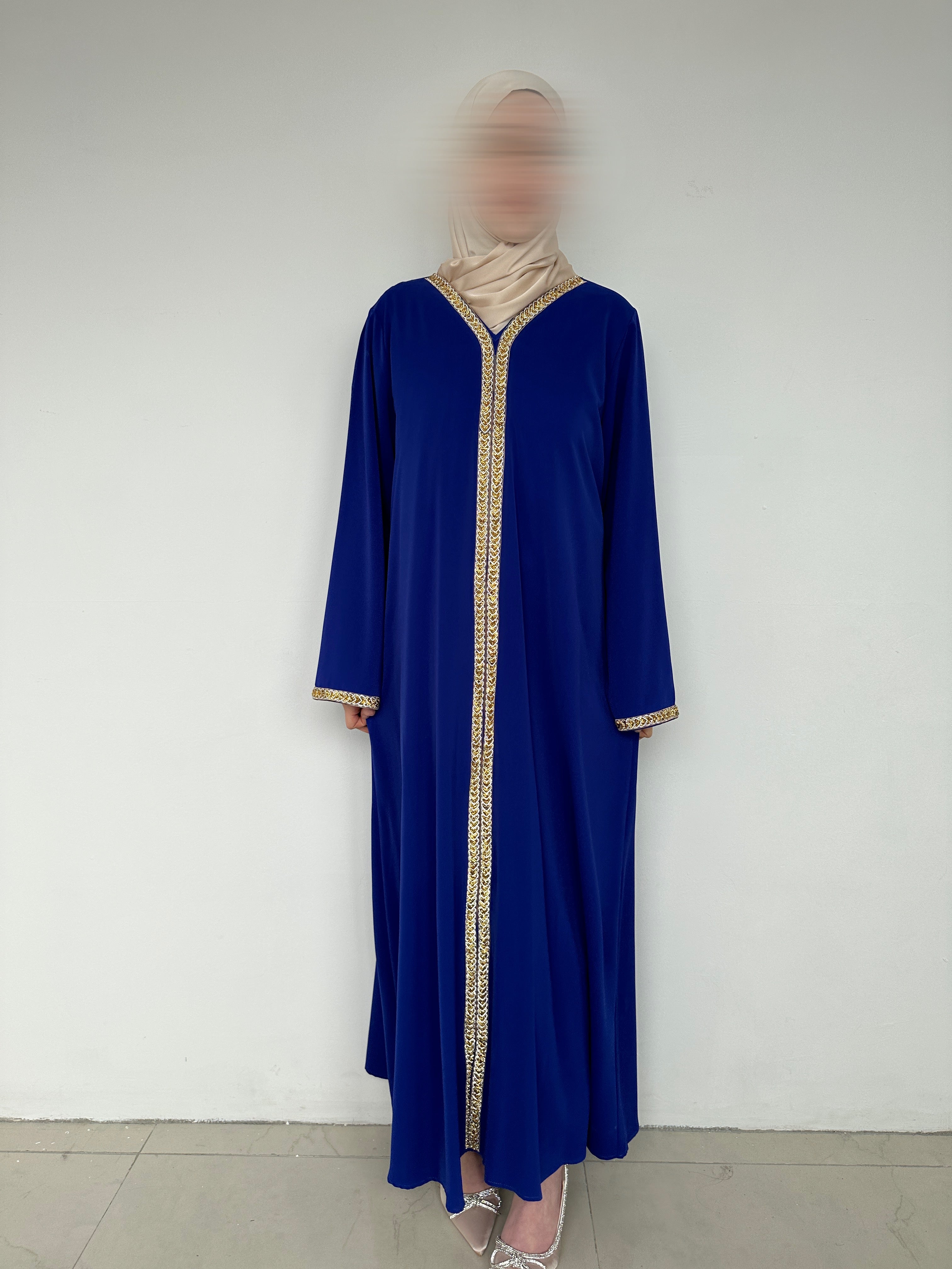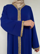 Découvrez notre abaya élégante ornée de détails dorés raffinés. Avec sa couleur bleue profonde et sa coupe droite classique, cette abaya est parfaite pour toutes les occasions, qu’elles soient formelles ou décontractées. La bordure dorée le long de l’ouverture et sur les manches ajoute une touche d’élégance à cette tenue intemporelle.